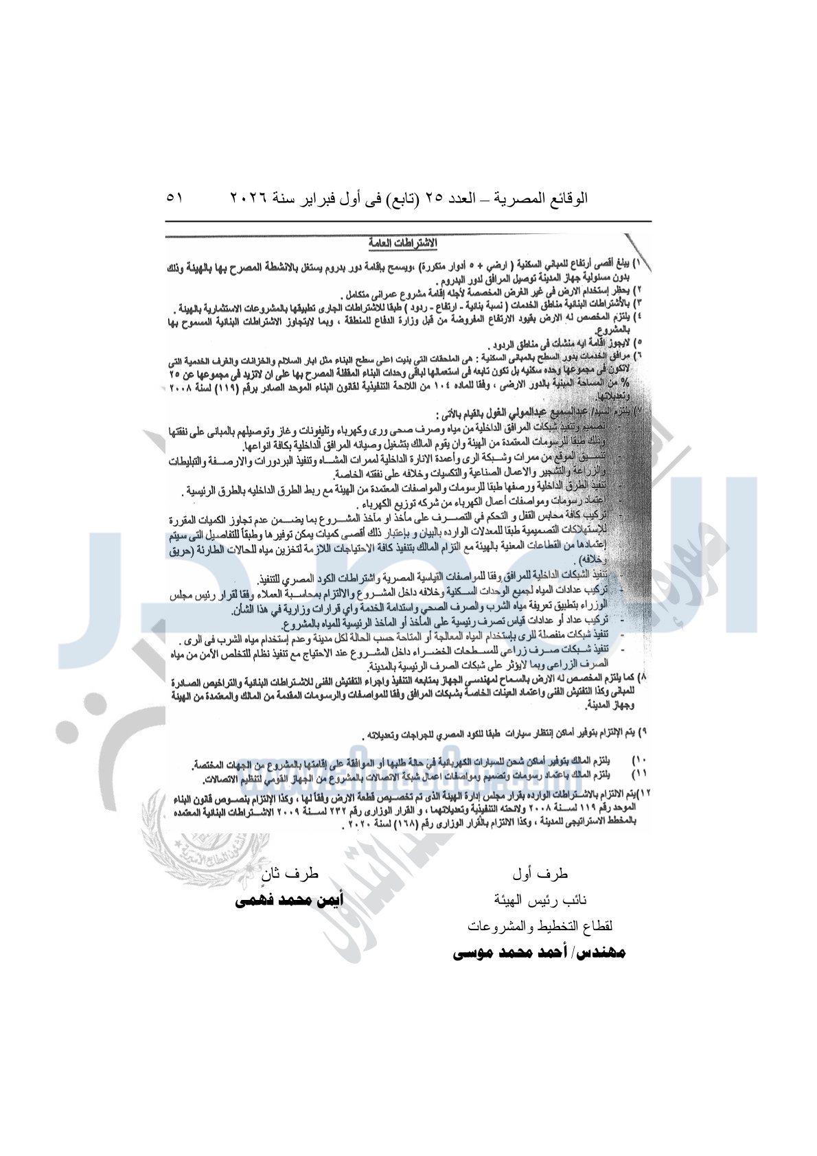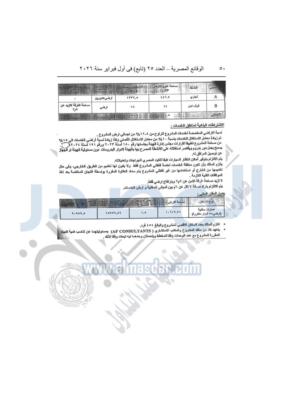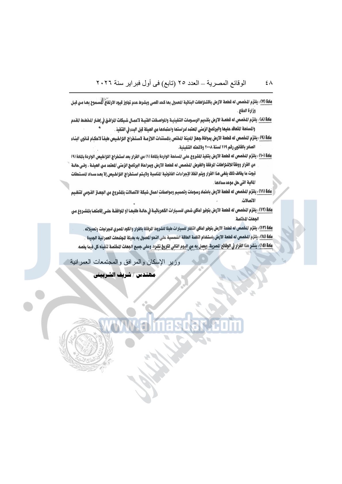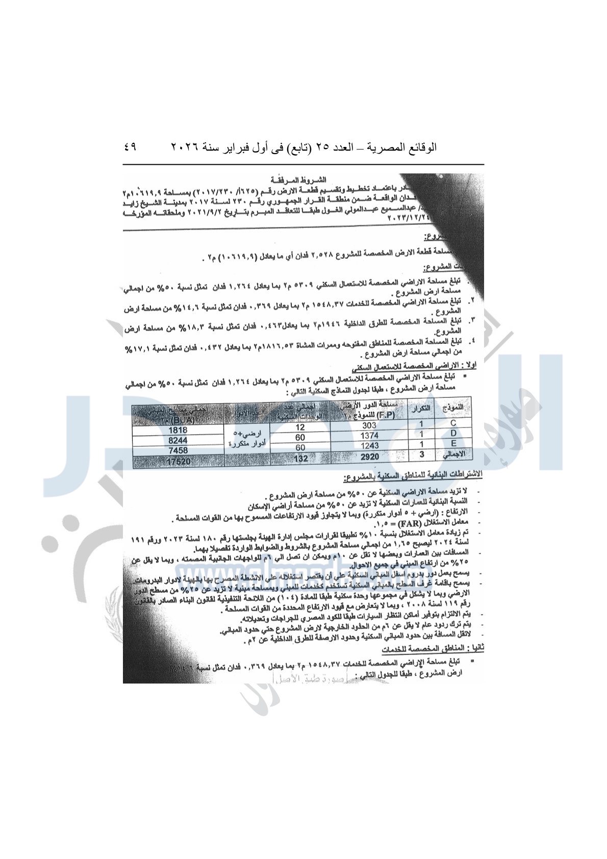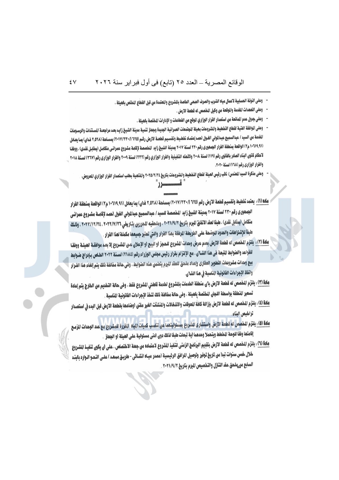 نشرت الوقائع المصرية، في العدد 25 "تابع"، الصادر في أول فبراير سنة 2026، قرار وزارة الإسكان والمرافق والمجتمعات العمرانية، رقم 299 لسنة 2025، بتاريخ 2-3-2025، بشأن اعتماد تخطيط وتقسيم قطعة الأرض أرقام "625أ / 230 / 2017" بمساحة 2.528 فدان بما يعادل "10619.91م2" الواقعة بمنطقة القرار الجمهورى رقم 230 لسنة 2017 بمدينة الشيخ زايد المخصصة لعبد السميع عبد المولى الغول أحمد لإقامة مشروع عمراني متكامل "بمقابل نقدى".