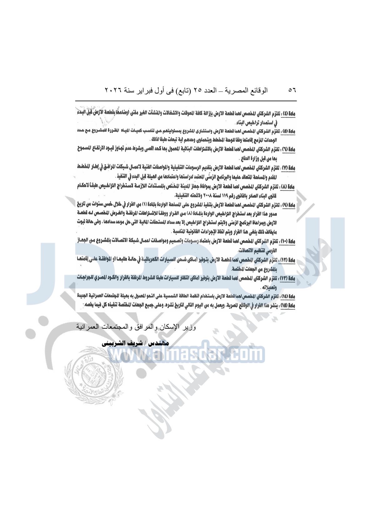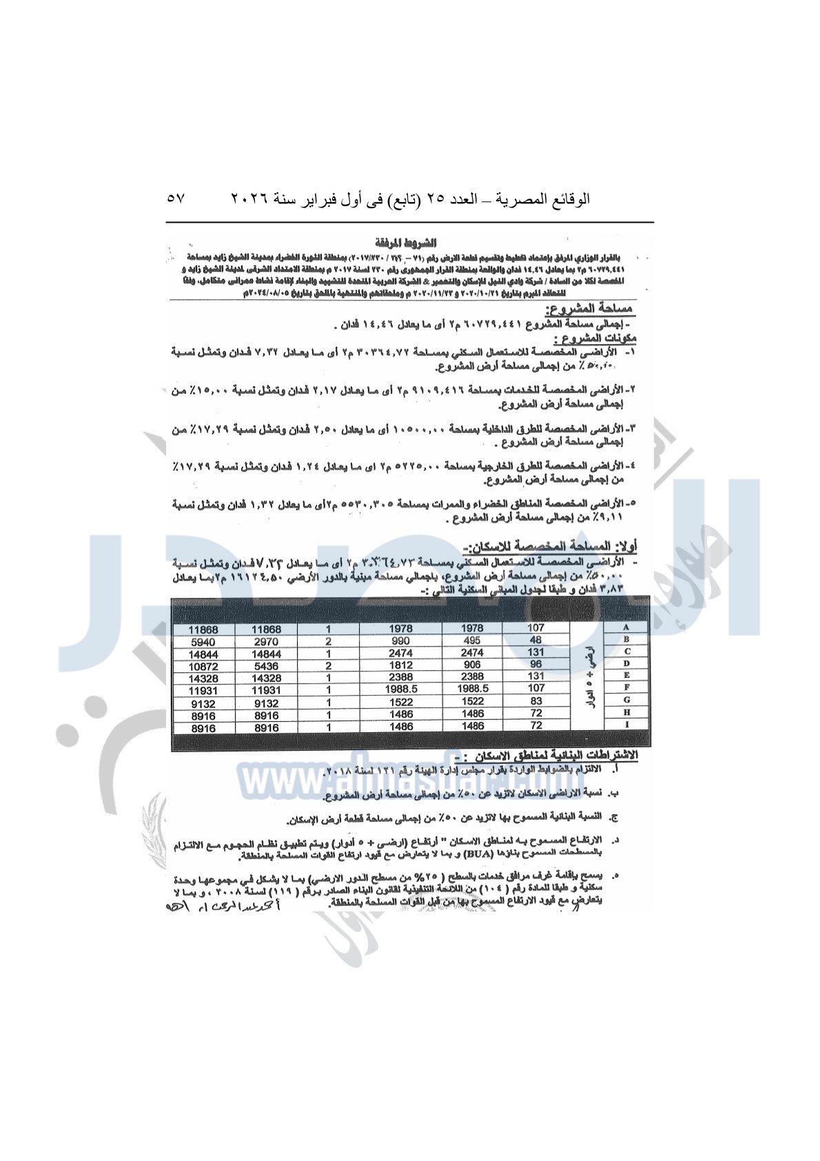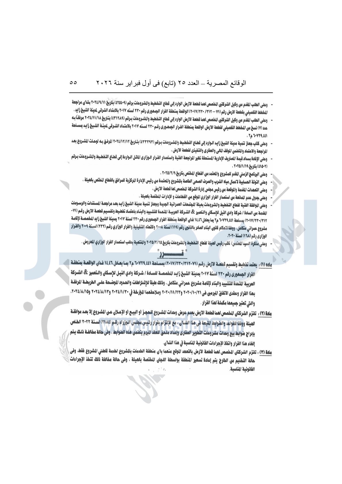 نشرت الوقائع المصرية، في العدد 25 "تابع"، الصادر في أول فبراير سنة 2026، قرار وزارة الإسكان والمرافق والمجتمعات العمرانية، رقم 317 لسنة 2025، بتاريخ 9-3-2025، بشأن اعتماد تخطيط وتقسيم قطعة أرض بمساحة 60729.441م2 بما يعادل 14.46 فدان الواقعة بمنطقة القرار الجمهورى رقم 230 لسنة 2017 بمدينة الشيخ زايد المخصصة لشركة وادى النيل للإسكان والتعمير & الشركة العربية المتحدة للتشييد والبناء لإقامة مشروع عمراني متكامل.