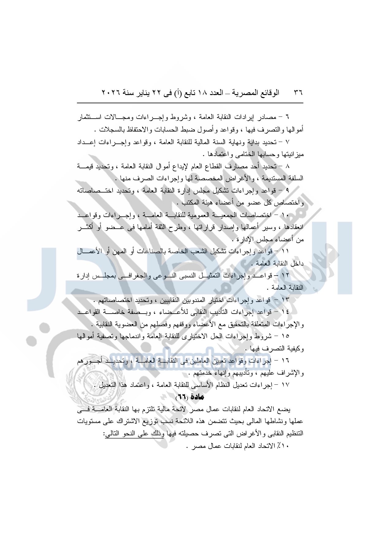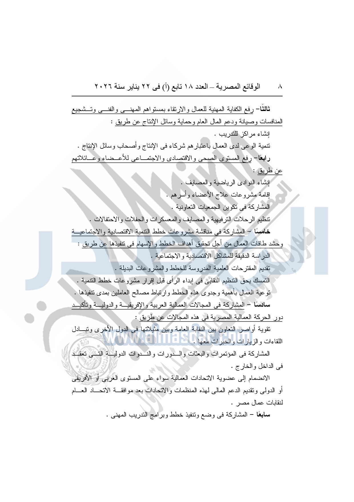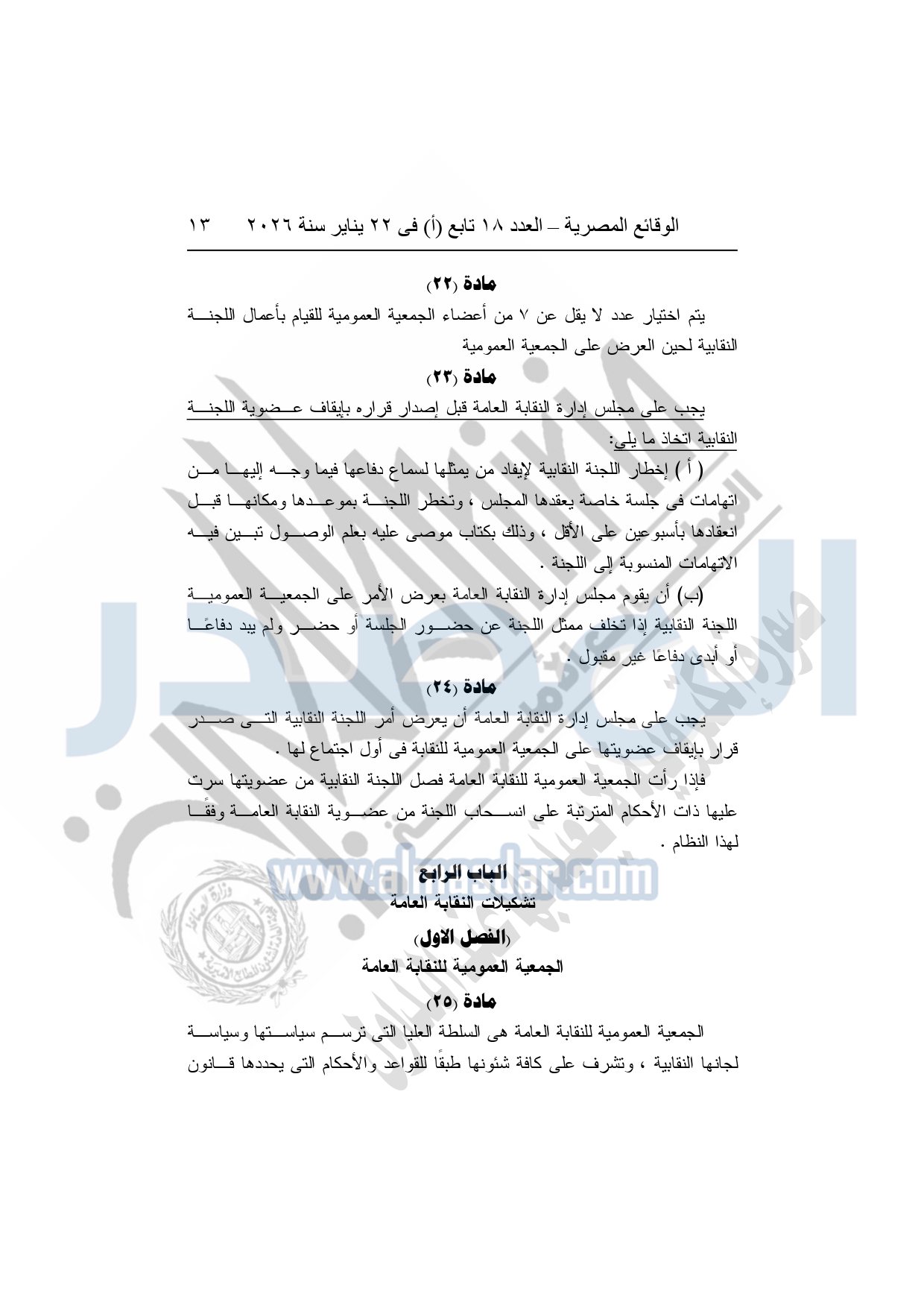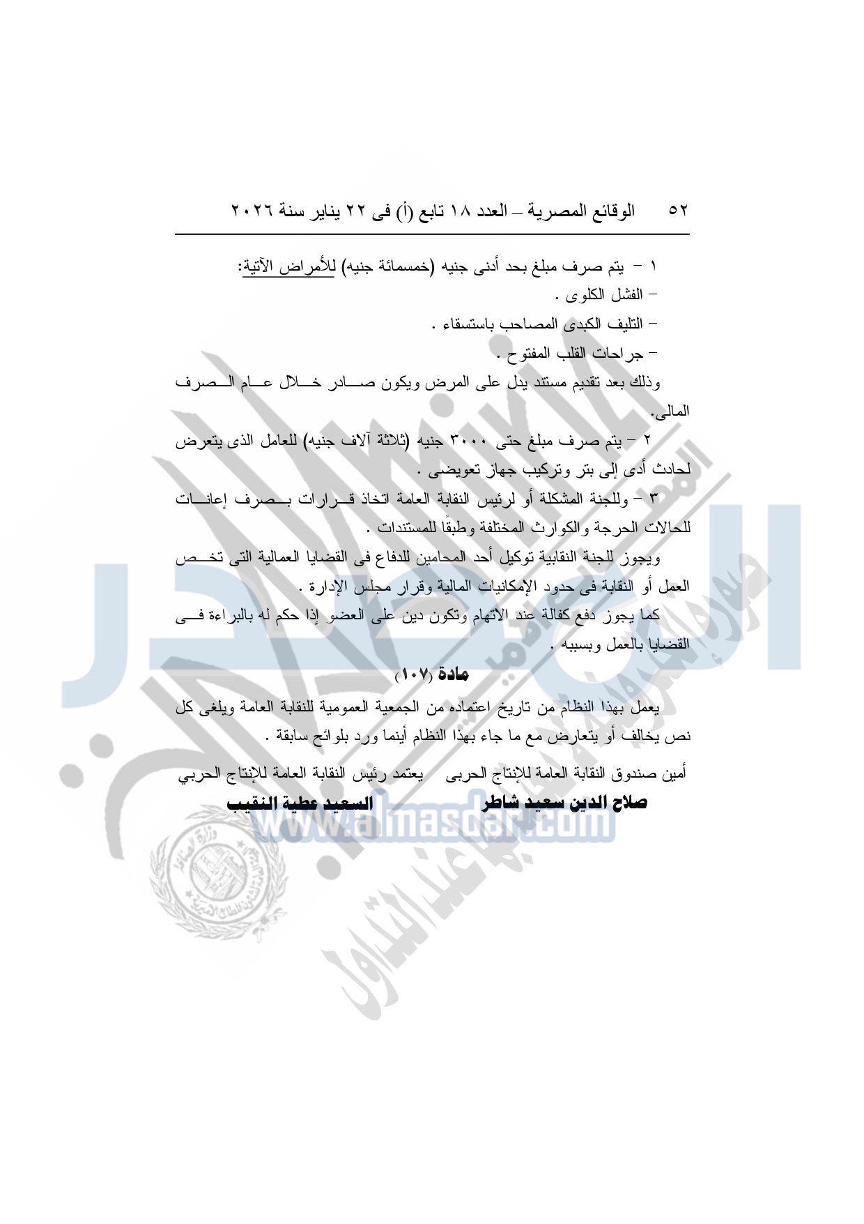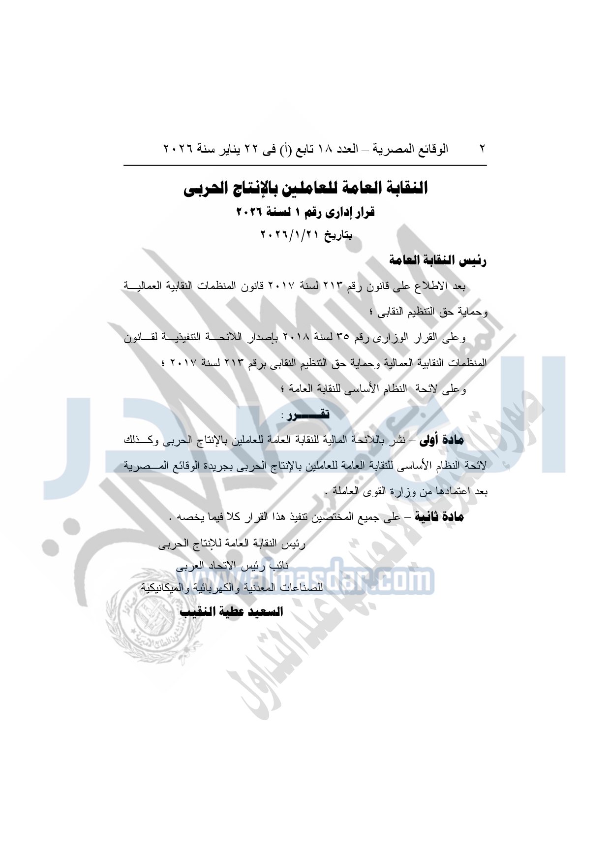 نشرت الوقائع المصرية، في العدد 18 تابع "أ"، الصادر في 22 يناير سنة 2026، بشأن النقابة العامة للعاملين بالإنتاج الحربى، قرار إدارى رقم 1 لسنة 2026، بتاريخ 21-1-2026، بشأن إعتماد لائحة النظام الأساسي للنقابة العامة للعاملين المدنيين بالإنتاج الحربي.