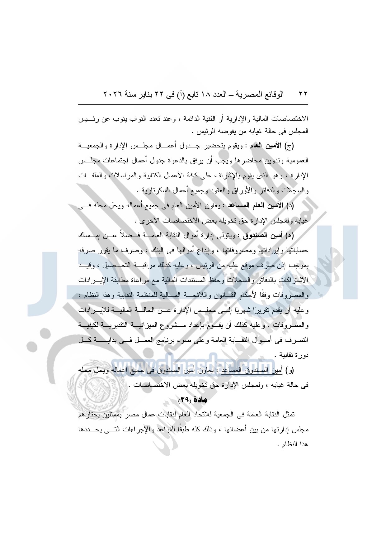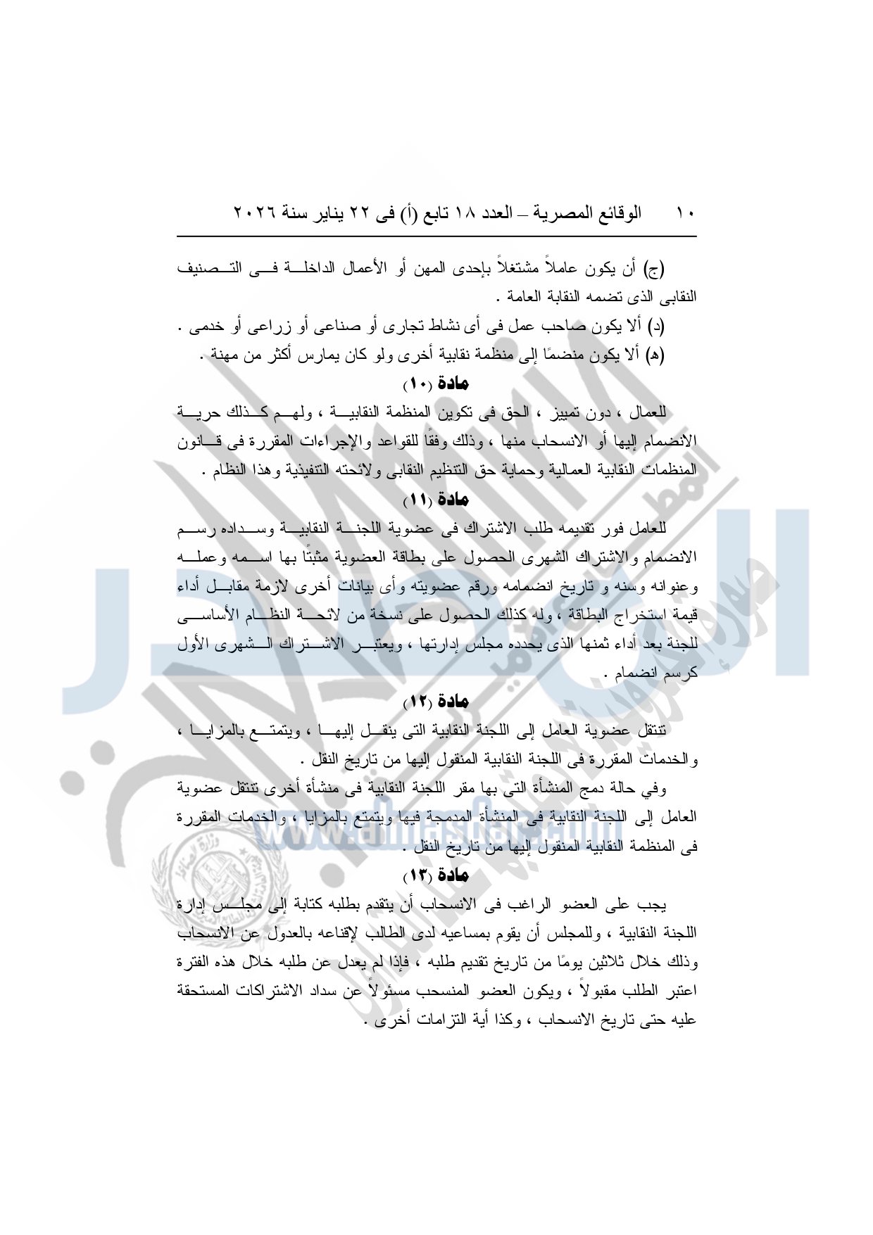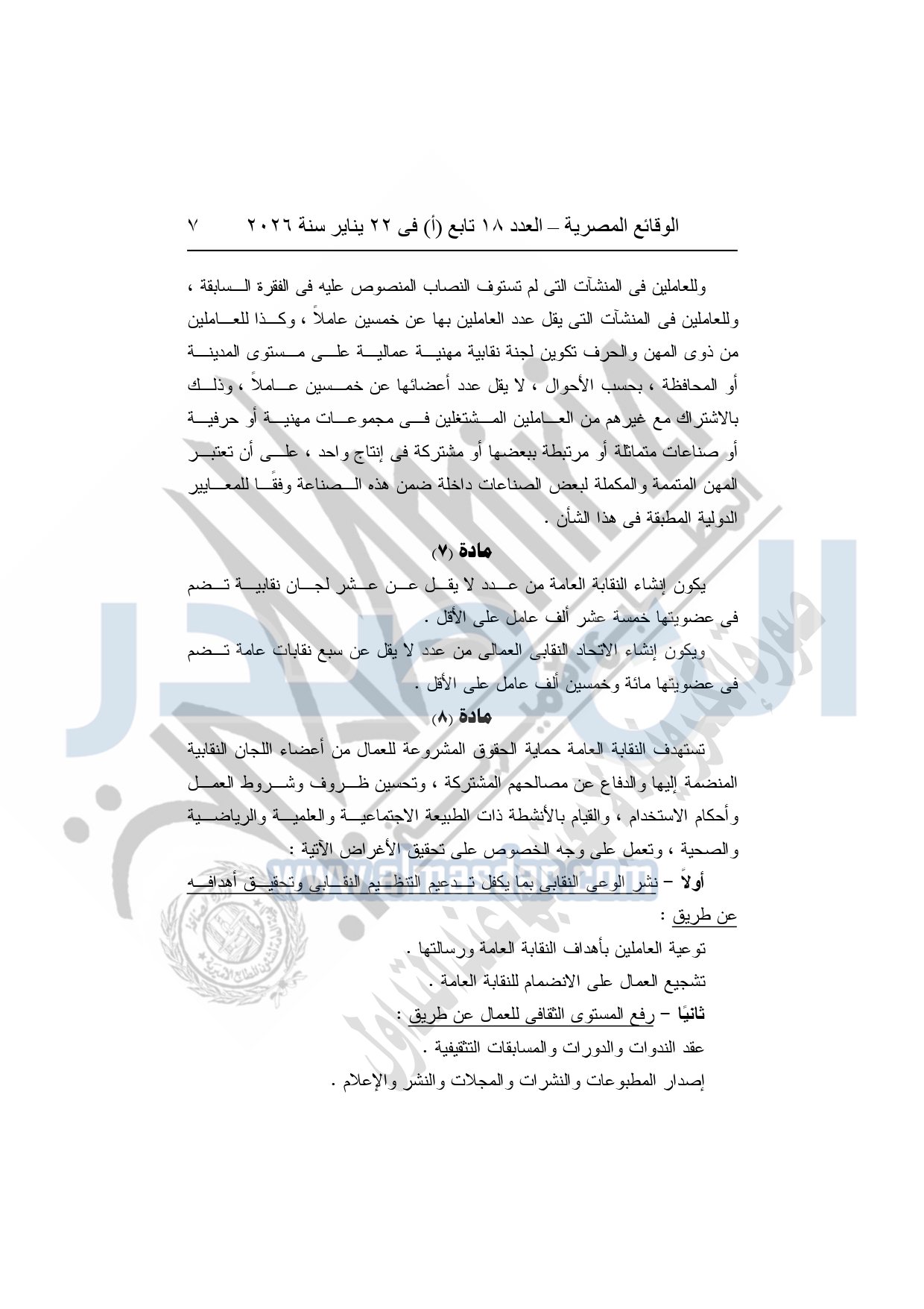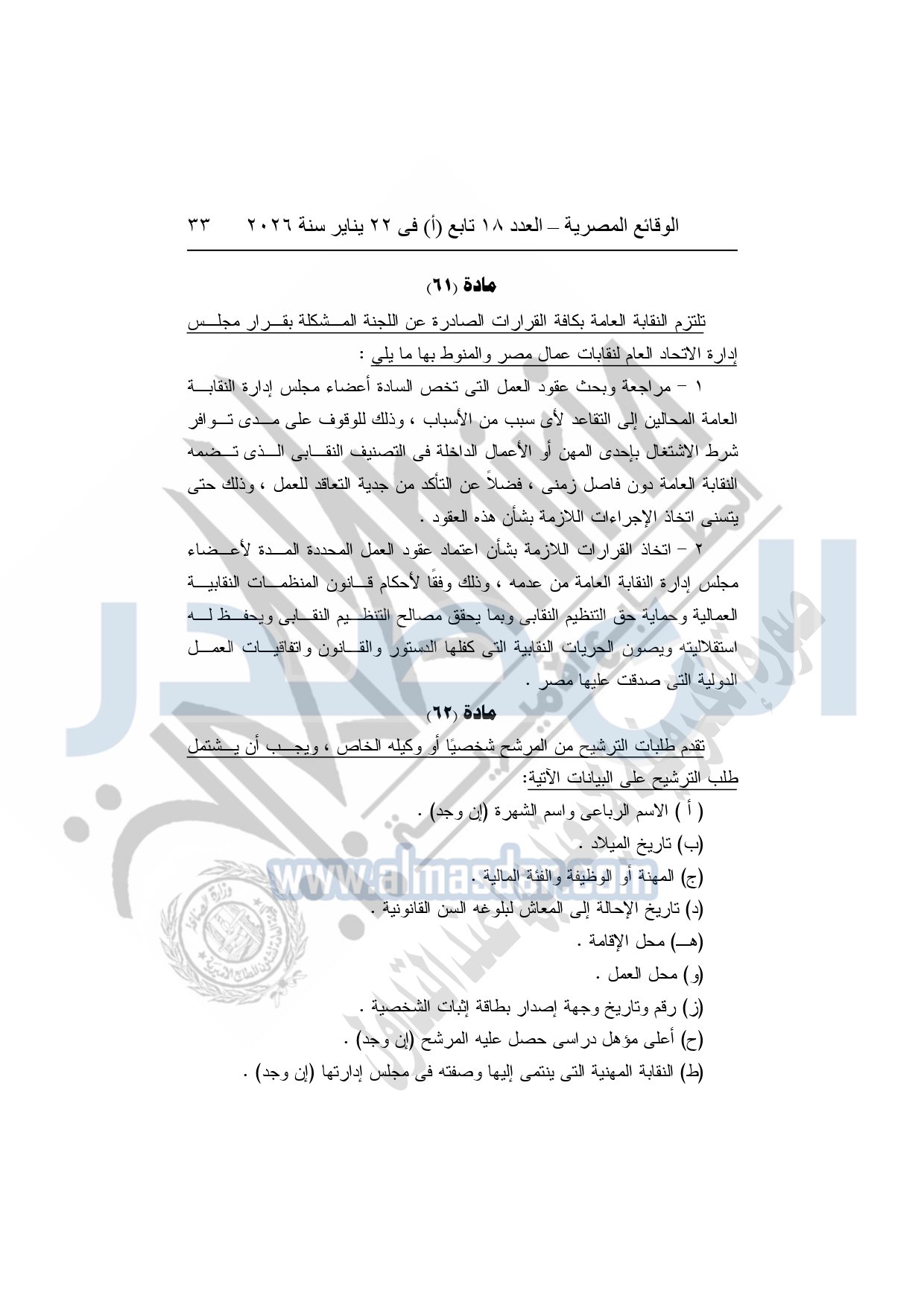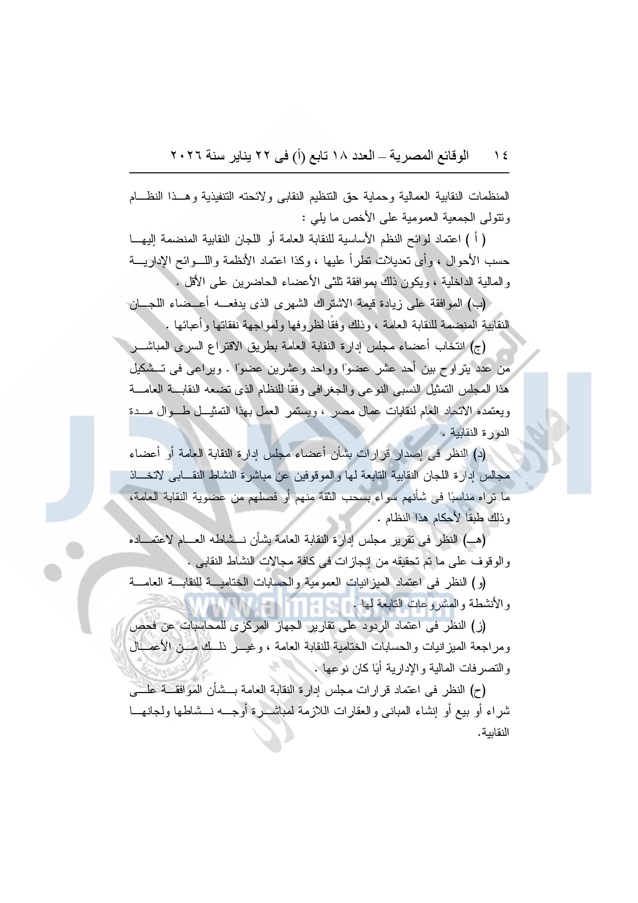 نشرت الوقائع المصرية، في العدد 18 تابع "أ"، الصادر في 22 يناير سنة 2026، بشأن النقابة العامة للعاملين بالإنتاج الحربى، قرار إدارى رقم 1 لسنة 2026، بتاريخ 21-1-2026، بشأن إعتماد لائحة النظام الأساسي للنقابة العامة للعاملين المدنيين بالإنتاج الحربي.
