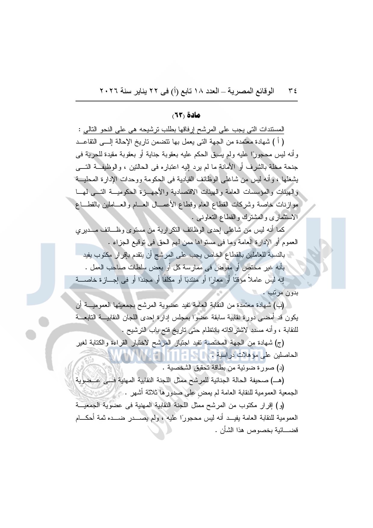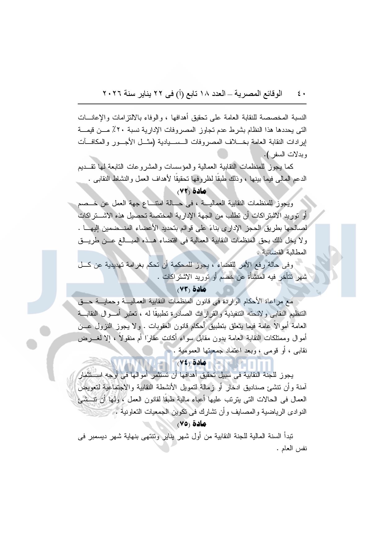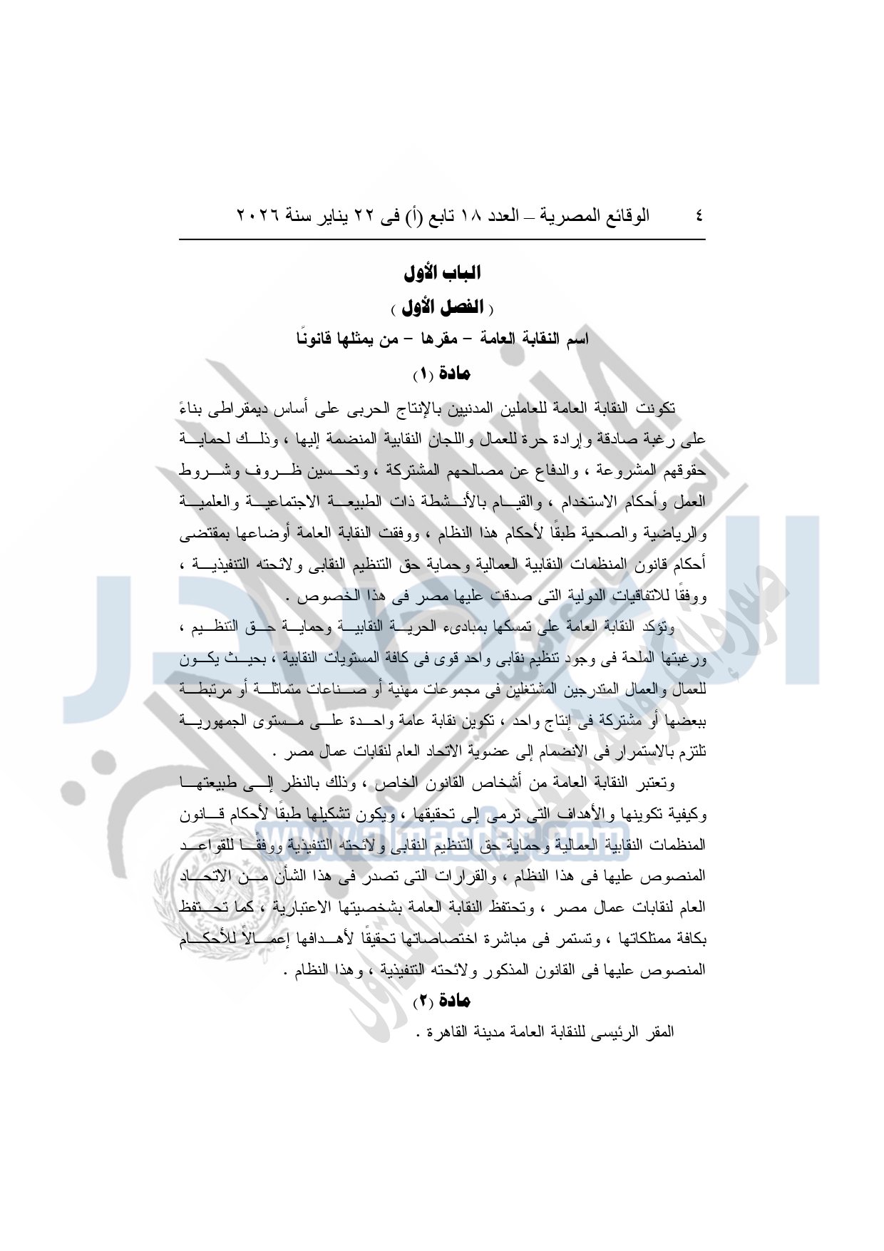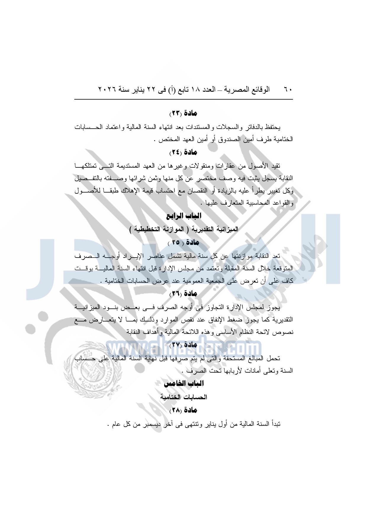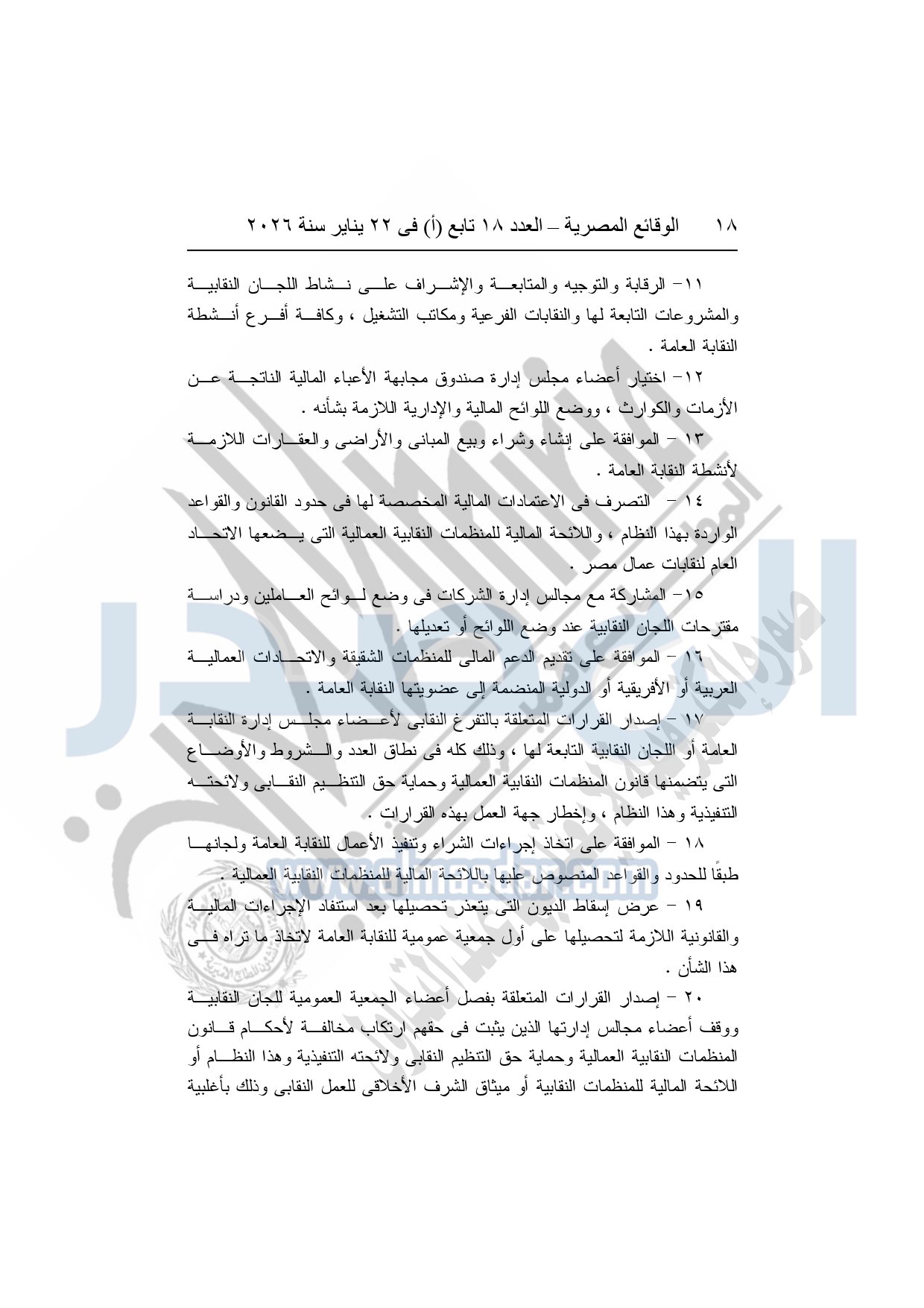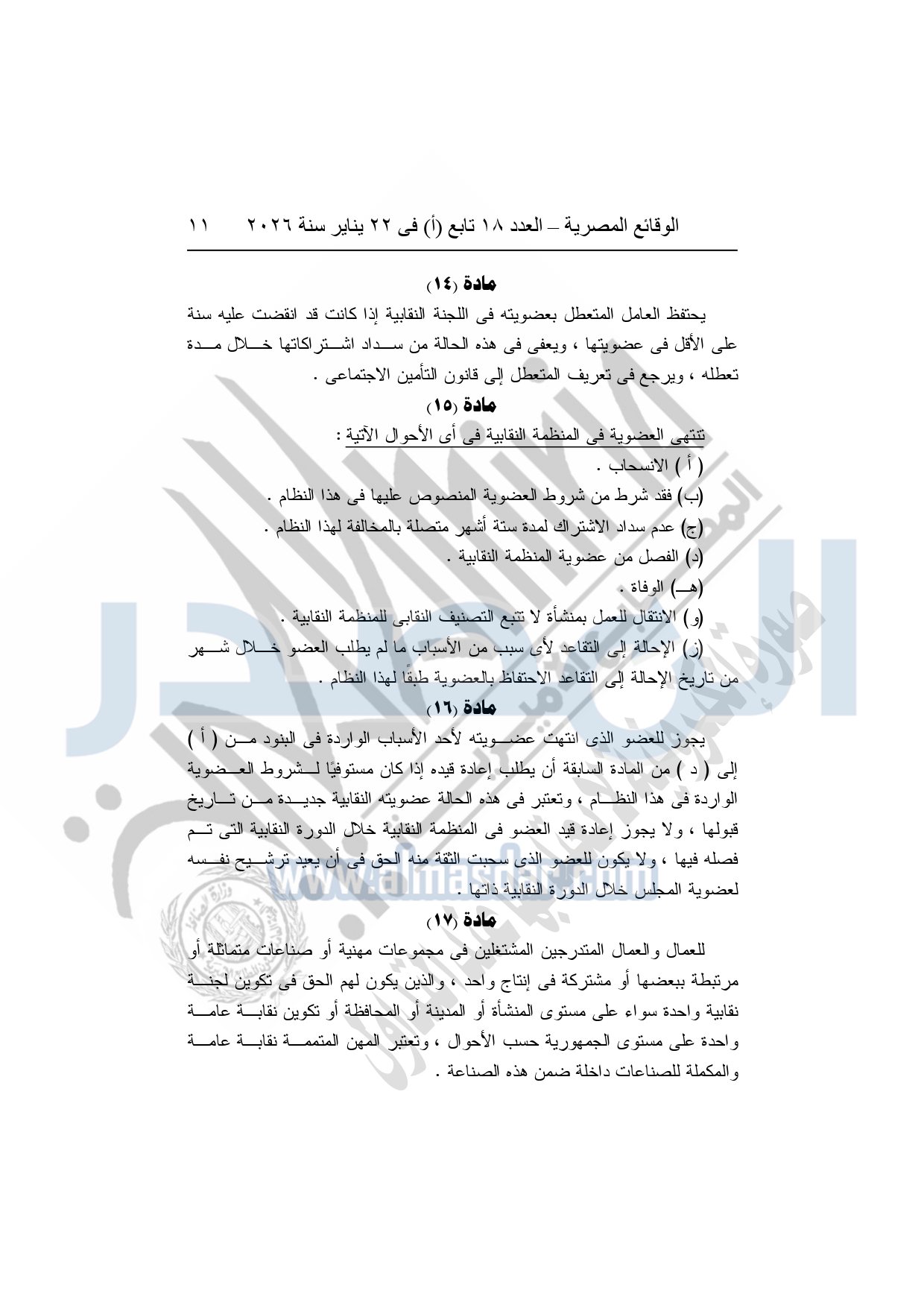 نشرت الوقائع المصرية، في العدد 18 تابع "أ"، الصادر في 22 يناير سنة 2026، بشأن النقابة العامة للعاملين بالإنتاج الحربى، قرار إدارى رقم 1 لسنة 2026، بتاريخ 21-1-2026، بشأن إعتماد لائحة النظام الأساسي للنقابة العامة للعاملين المدنيين بالإنتاج الحربي.