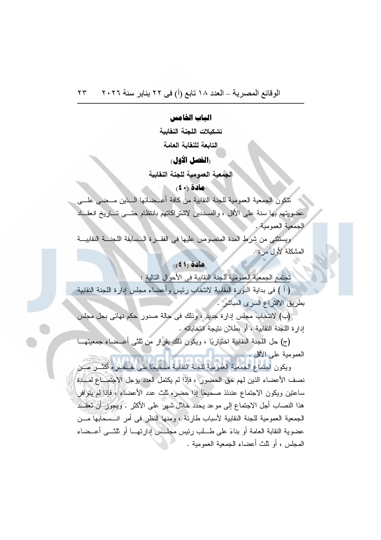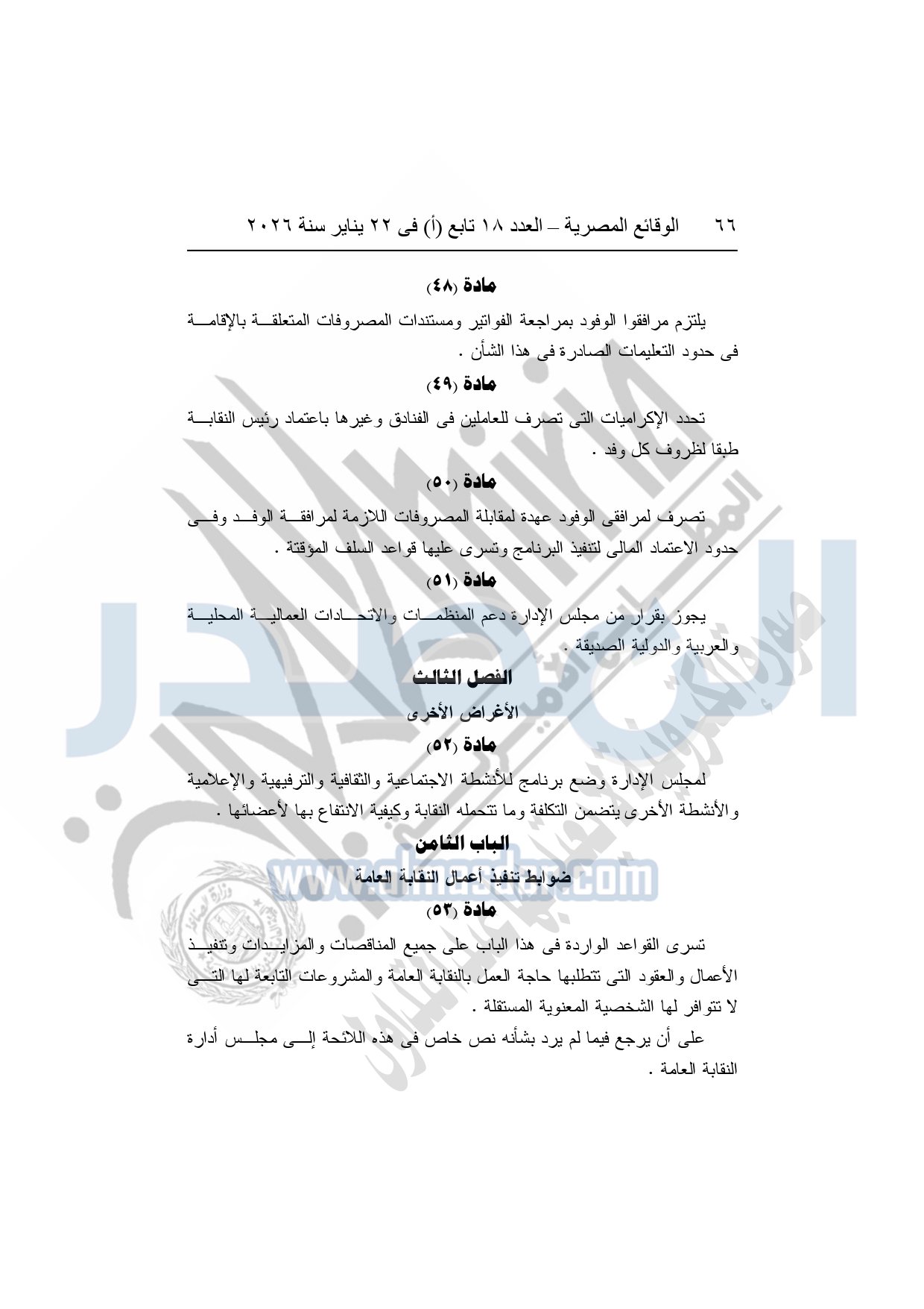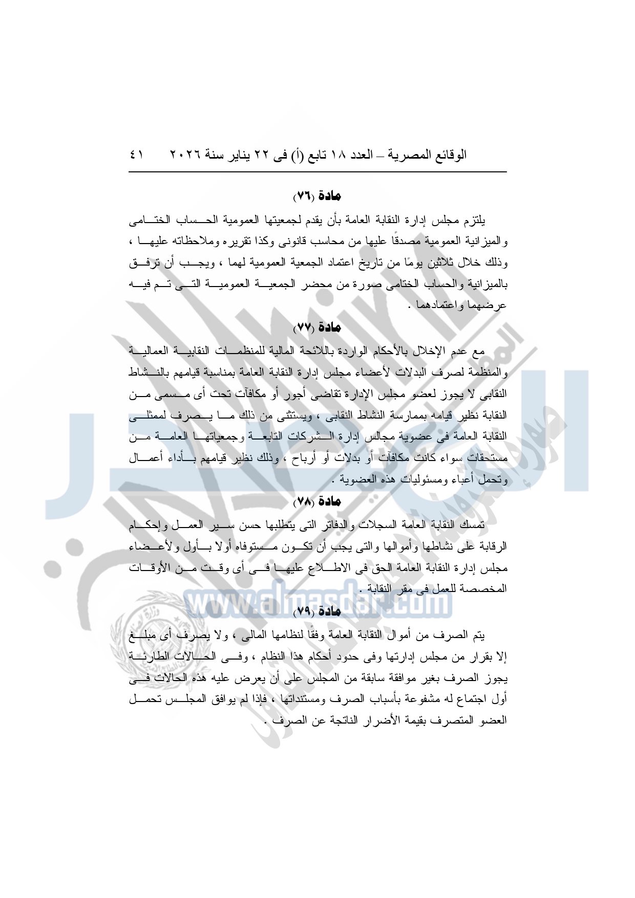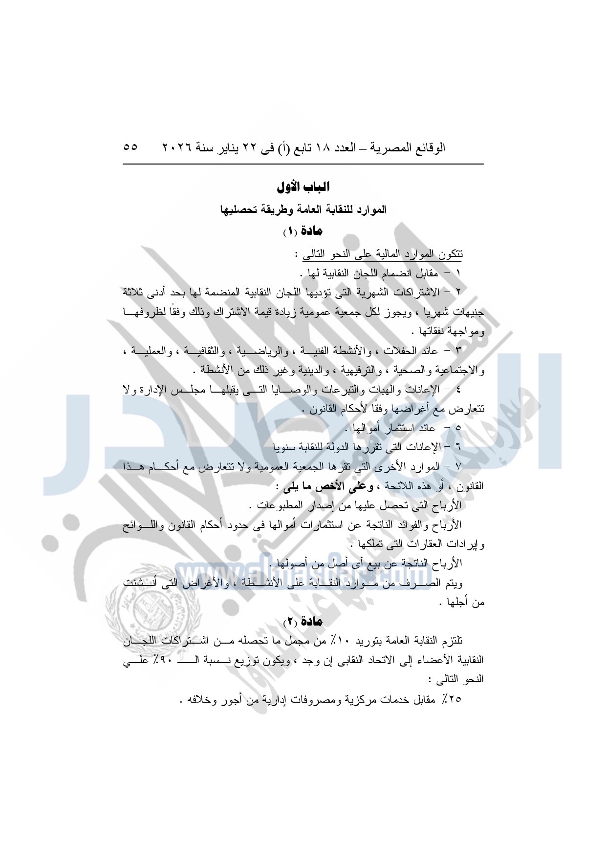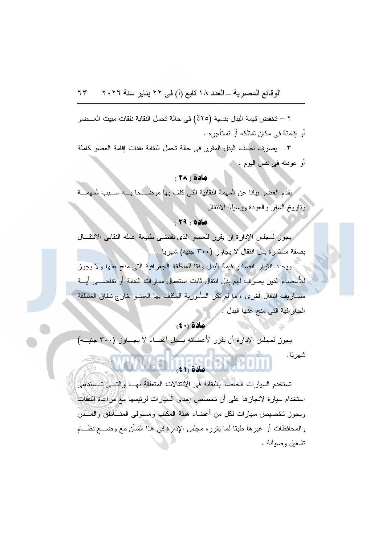 نشرت الوقائع المصرية، في العدد 18 تابع "أ"، الصادر في 22 يناير سنة 2026، بشأن النقابة العامة للعاملين بالإنتاج الحربى، قرار إدارى رقم 1 لسنة 2026، بتاريخ 21-1-2026، بشأن إعتماد لائحة النظام الأساسي للنقابة العامة للعاملين المدنيين بالإنتاج الحربي.