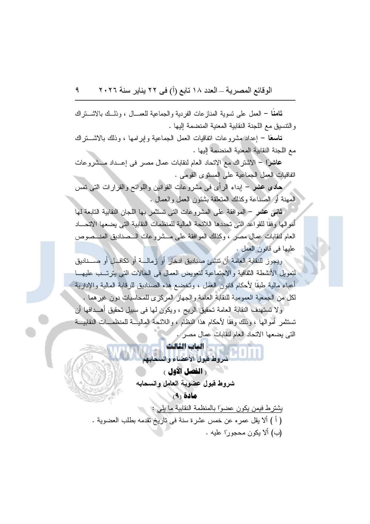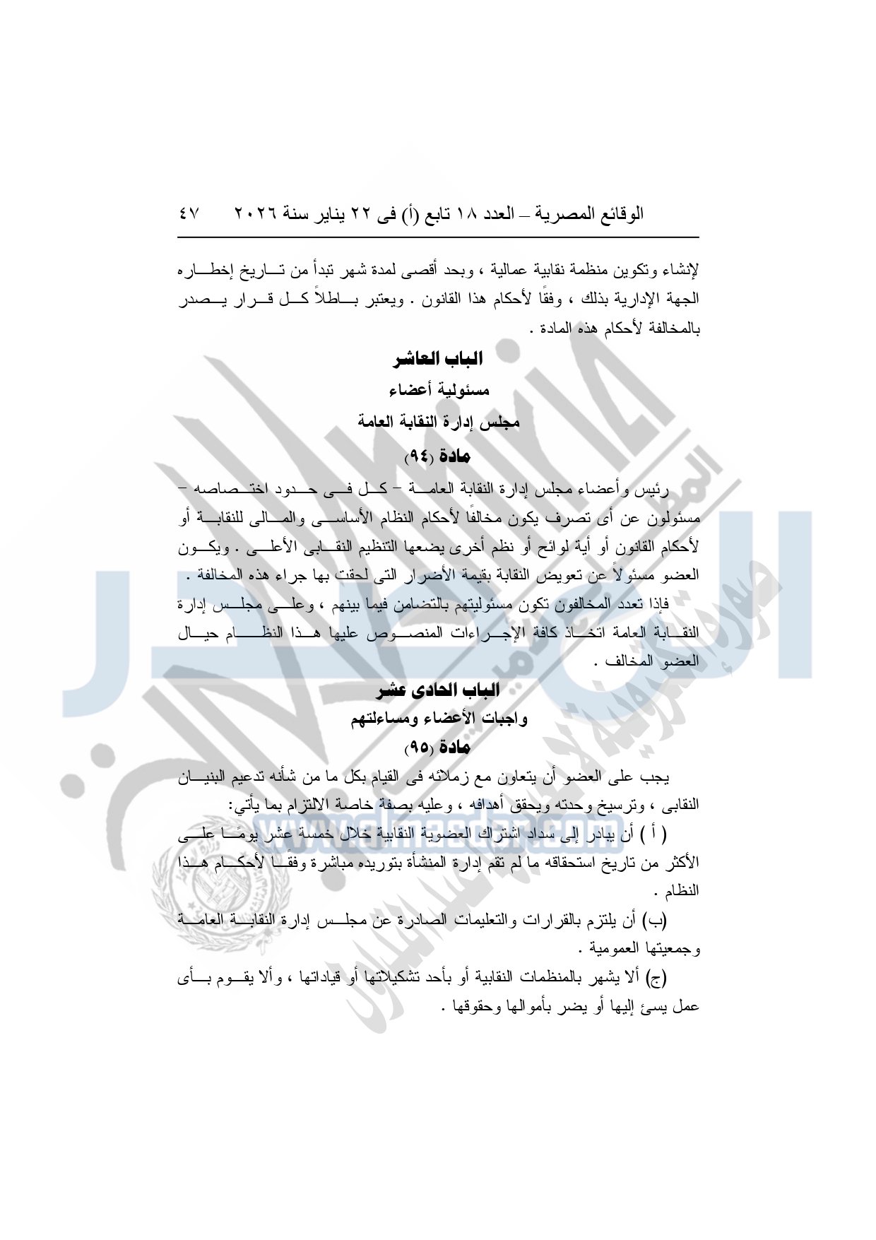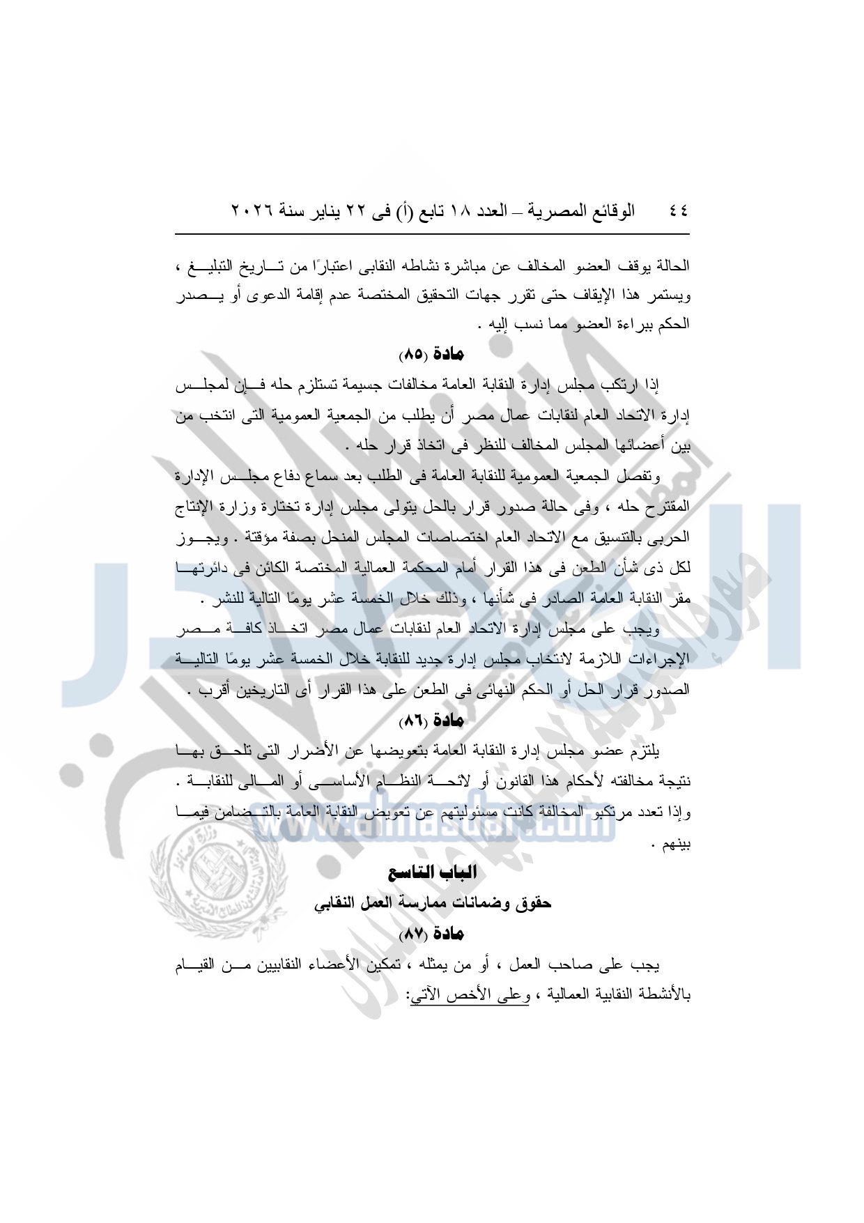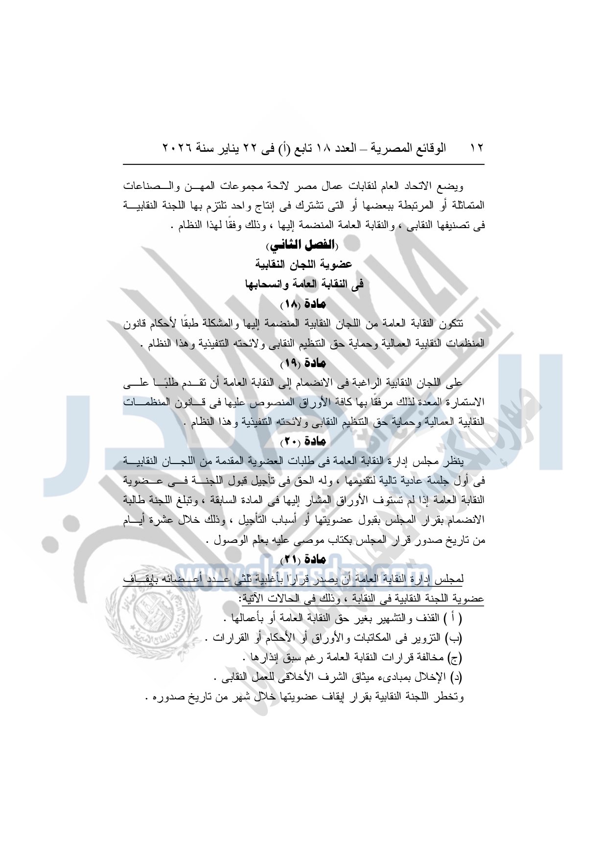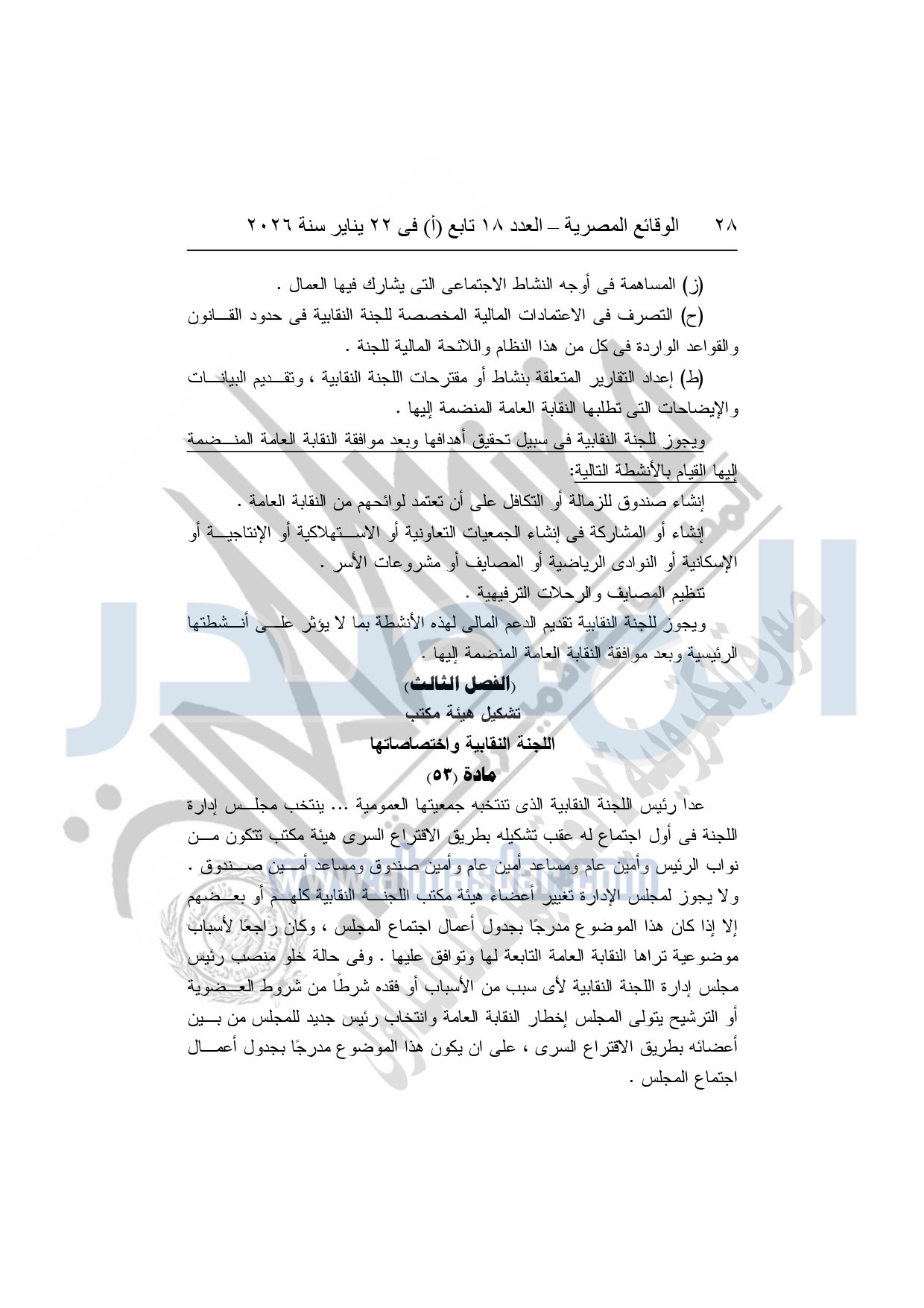 نشرت الوقائع المصرية، في العدد 18 تابع "أ"، الصادر في 22 يناير سنة 2026، بشأن النقابة العامة للعاملين بالإنتاج الحربى، قرار إدارى رقم 1 لسنة 2026، بتاريخ 21-1-2026، بشأن إعتماد لائحة النظام الأساسي للنقابة العامة للعاملين المدنيين بالإنتاج الحربي.