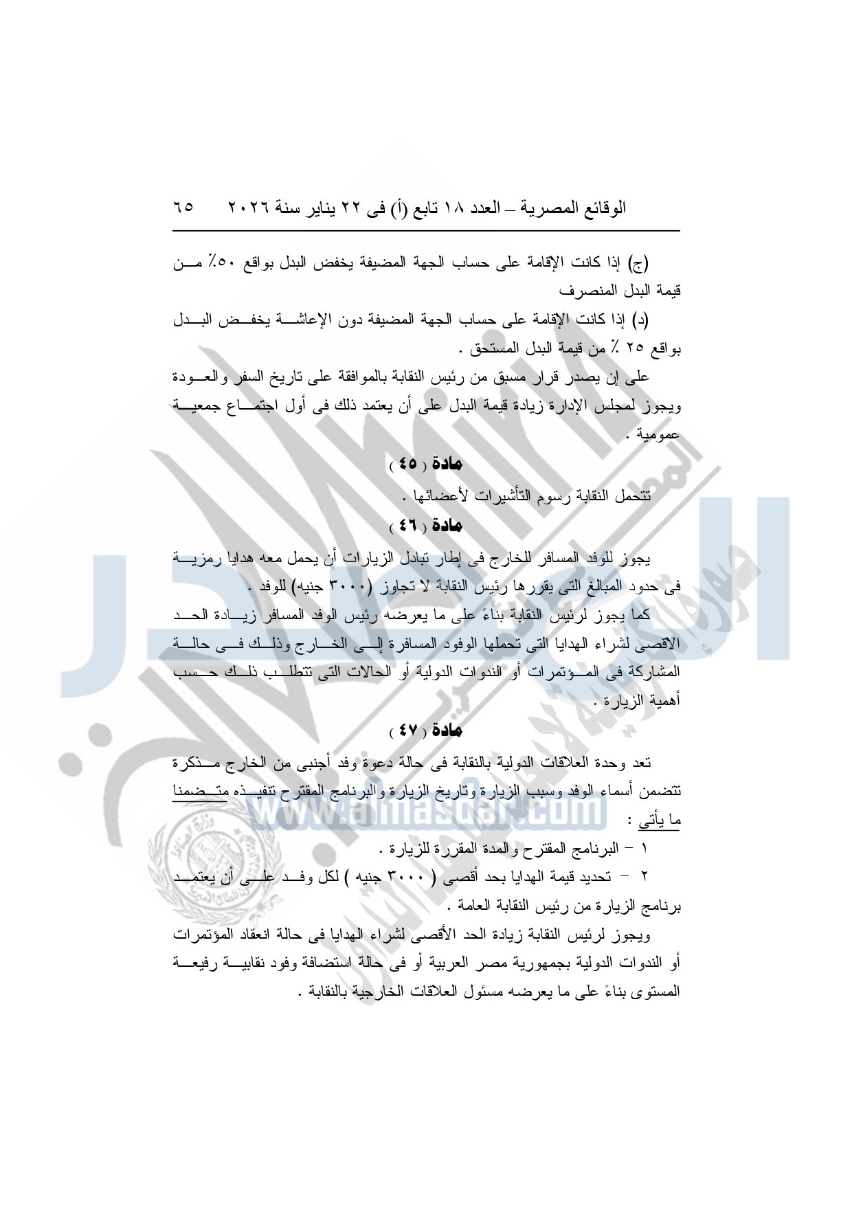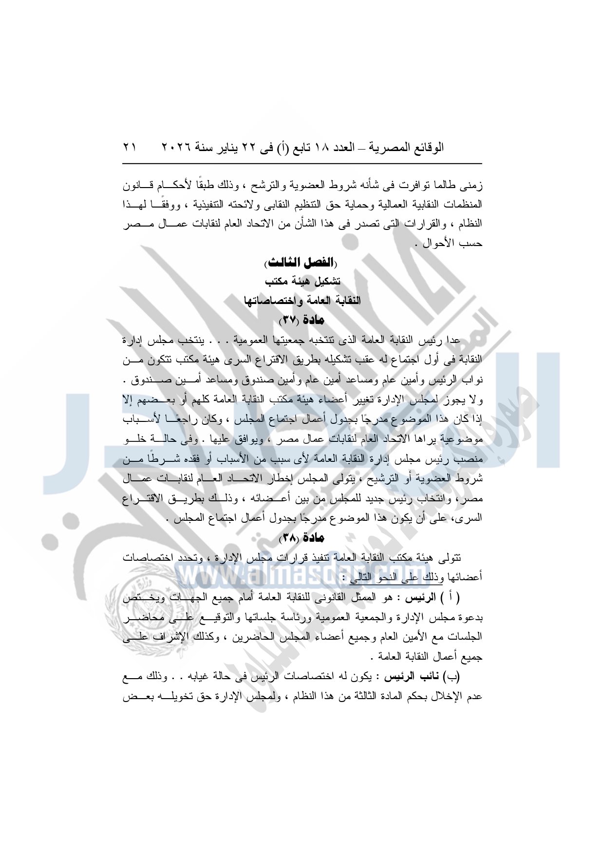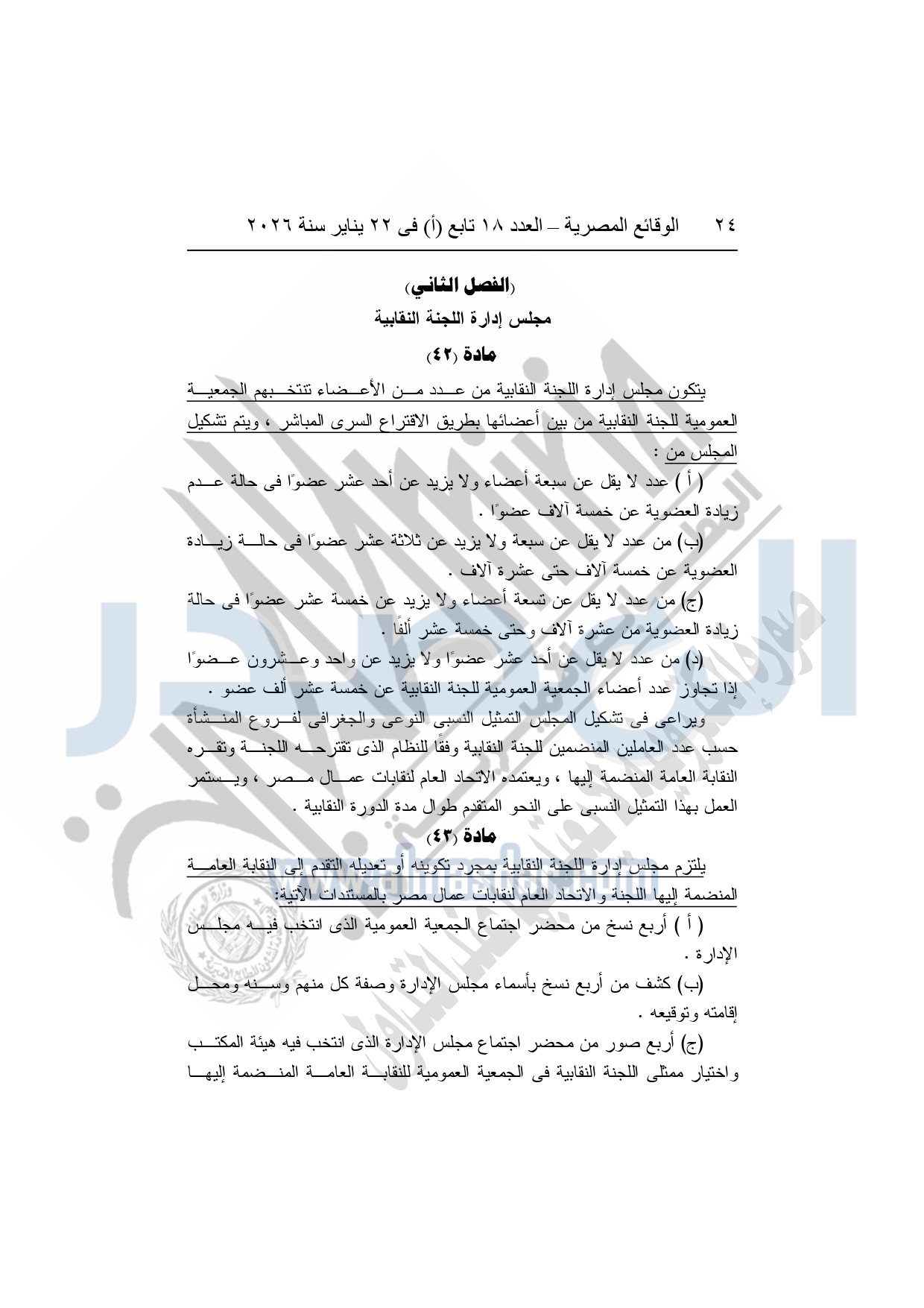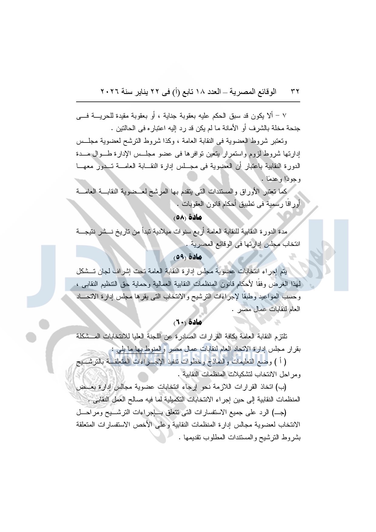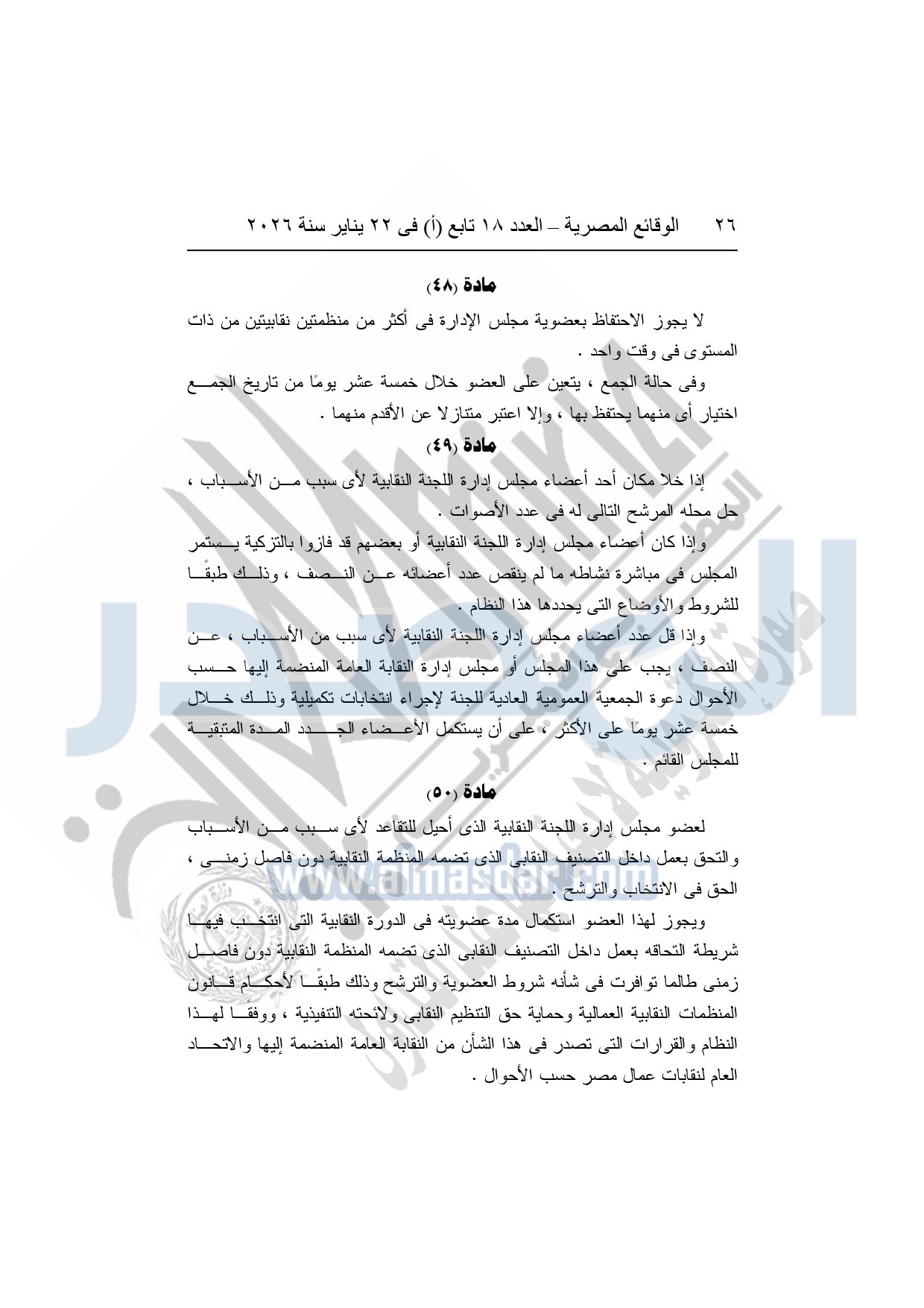 نشرت الوقائع المصرية، في العدد 18 تابع "أ"، الصادر في 22 يناير سنة 2026، بشأن النقابة العامة للعاملين بالإنتاج الحربى، قرار إدارى رقم 1 لسنة 2026، بتاريخ 21-1-2026، بشأن إعتماد لائحة النظام الأساسي للنقابة العامة للعاملين المدنيين بالإنتاج الحربي.
