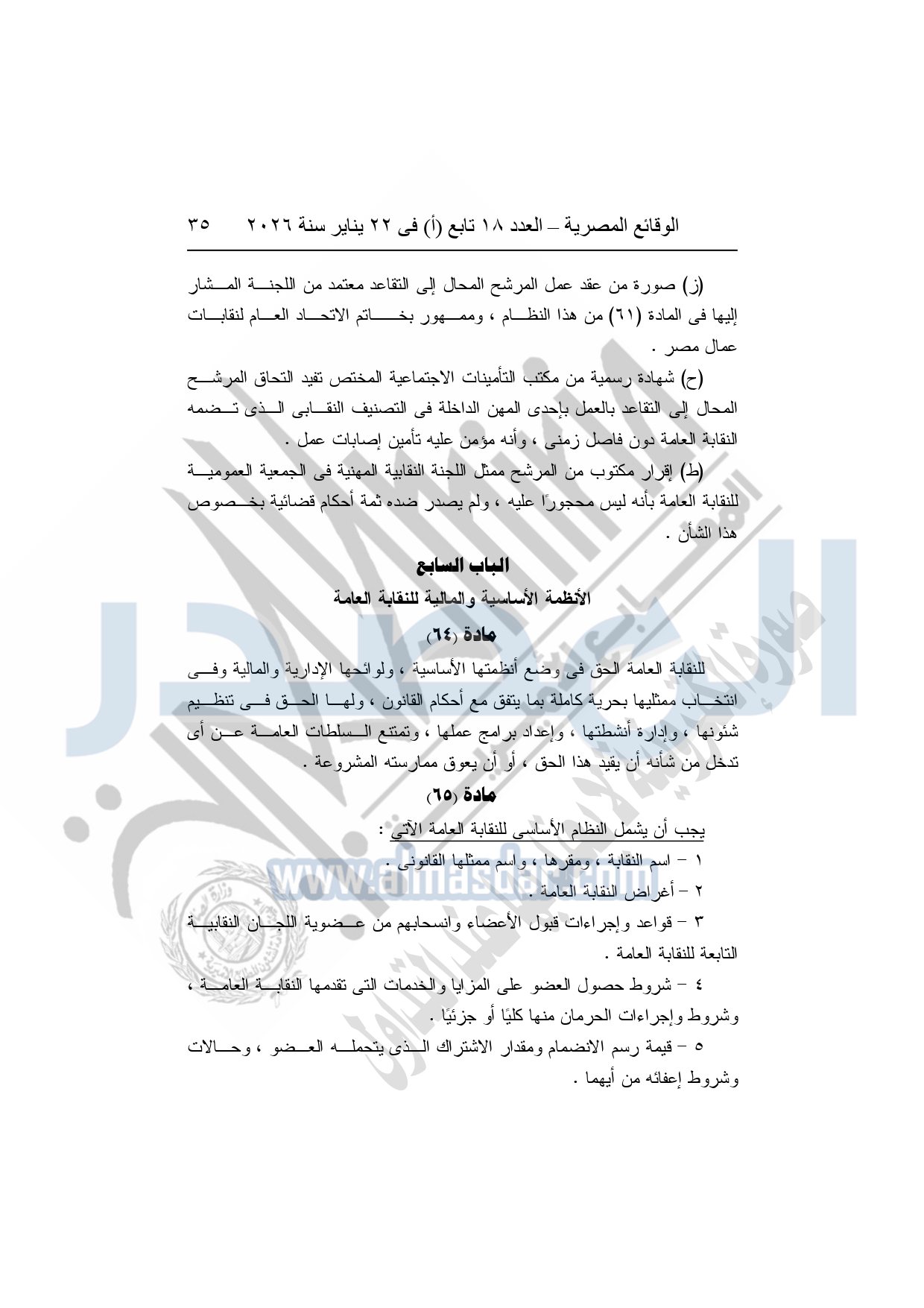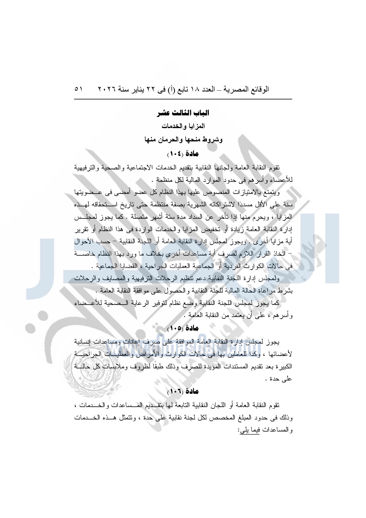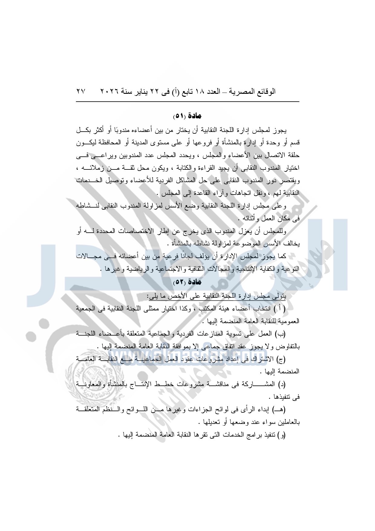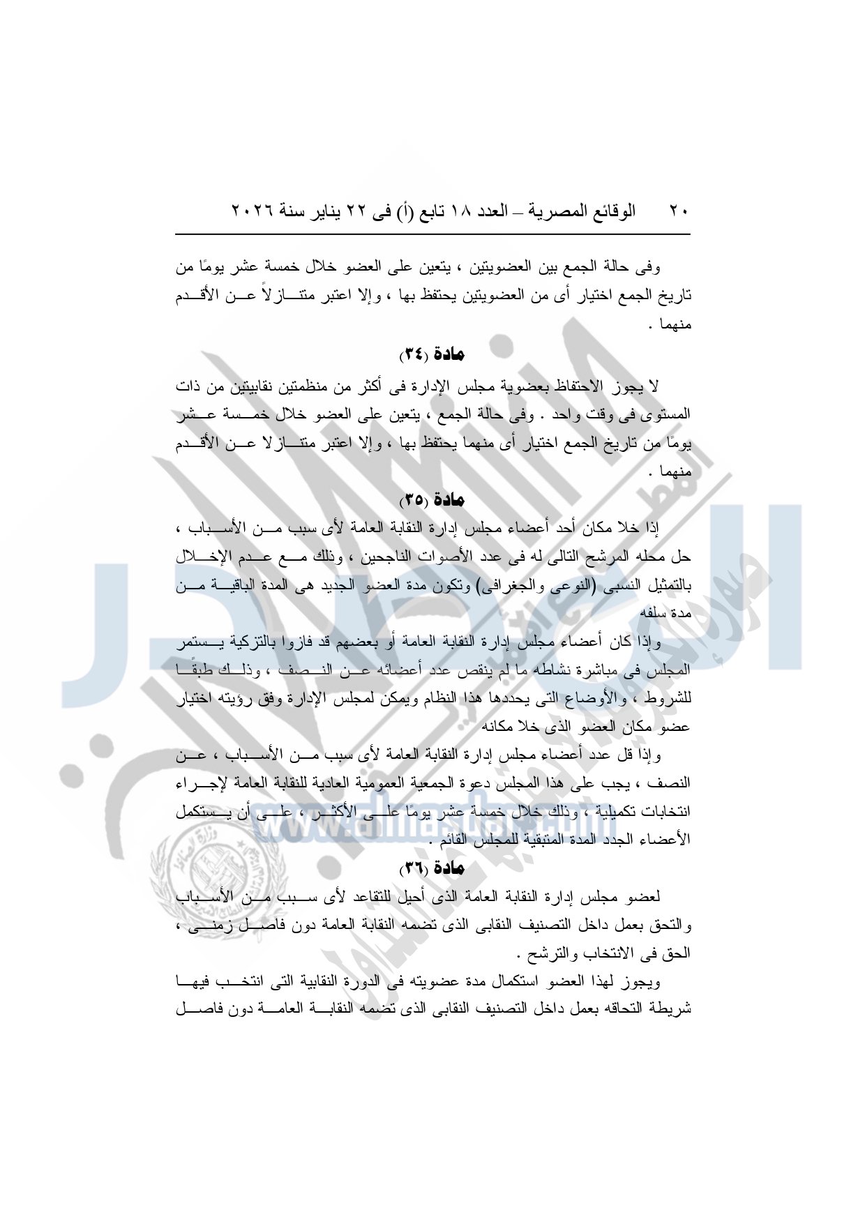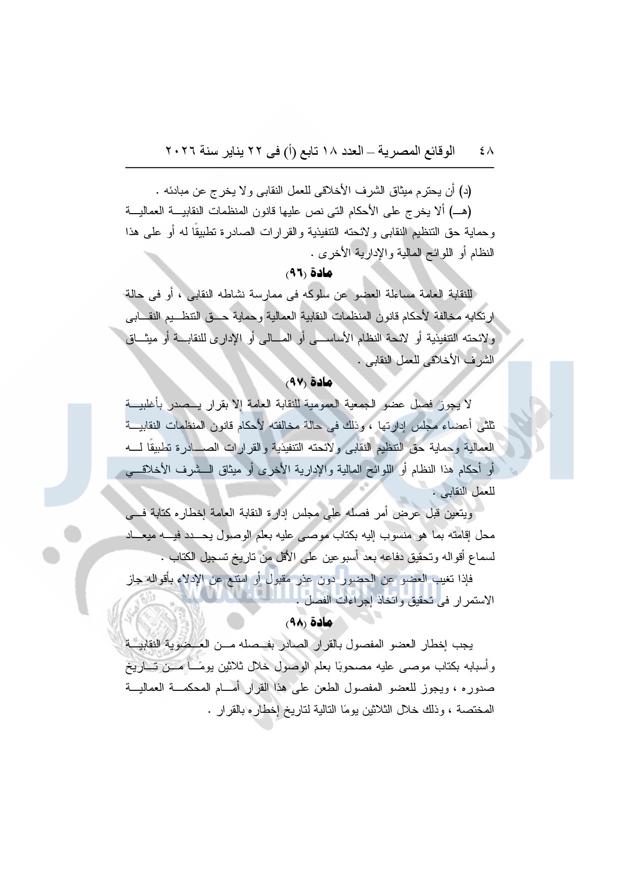 نشرت الوقائع المصرية، في العدد 18 تابع "أ"، الصادر في 22 يناير سنة 2026، بشأن النقابة العامة للعاملين بالإنتاج الحربى، قرار إدارى رقم 1 لسنة 2026، بتاريخ 21-1-2026، بشأن إعتماد لائحة النظام الأساسي للنقابة العامة للعاملين المدنيين بالإنتاج الحربي.