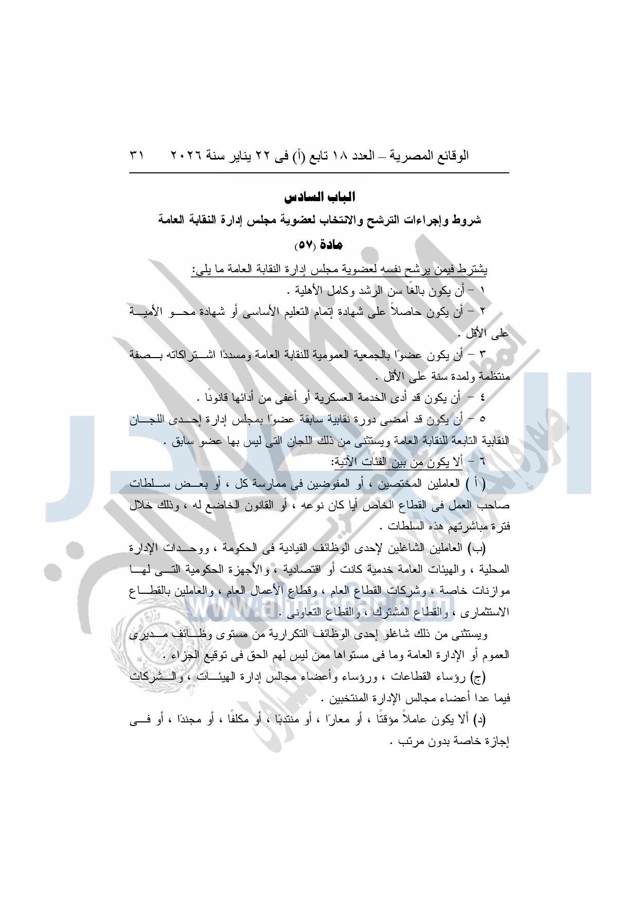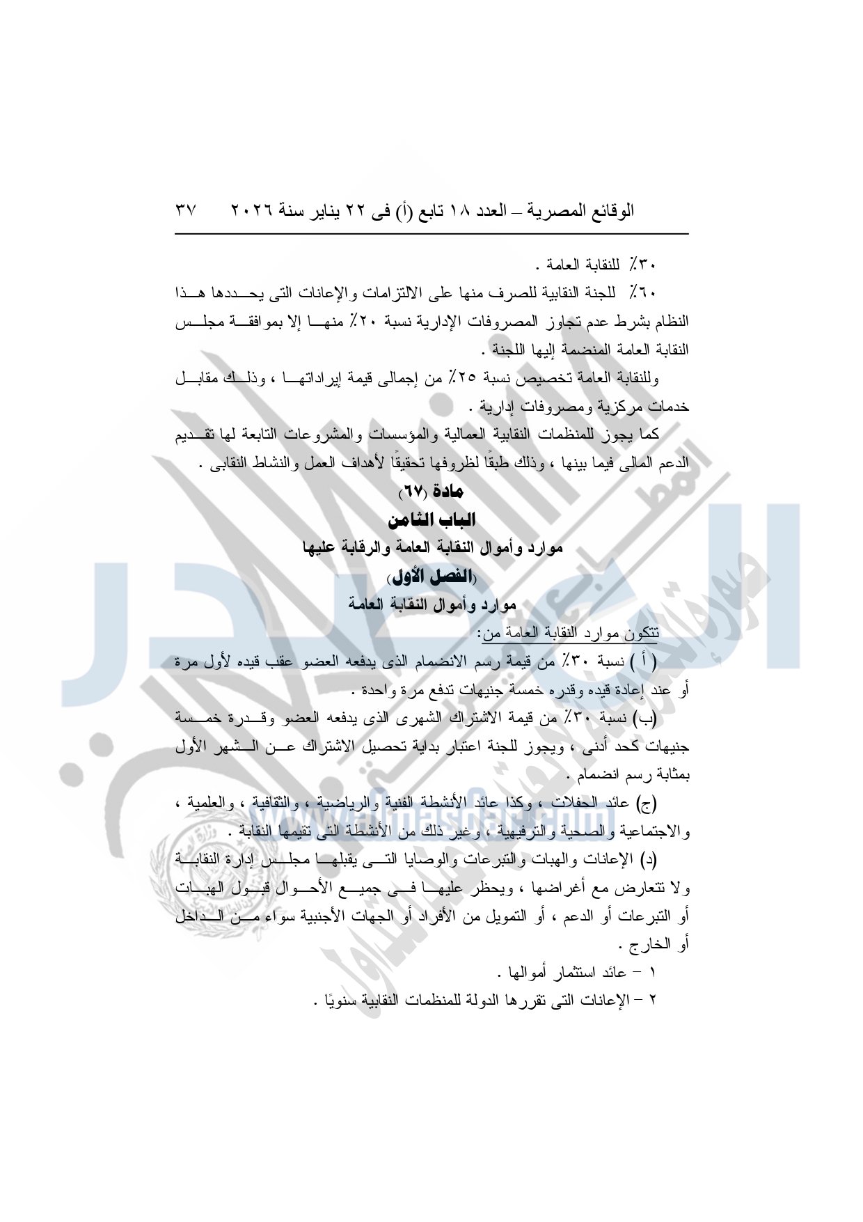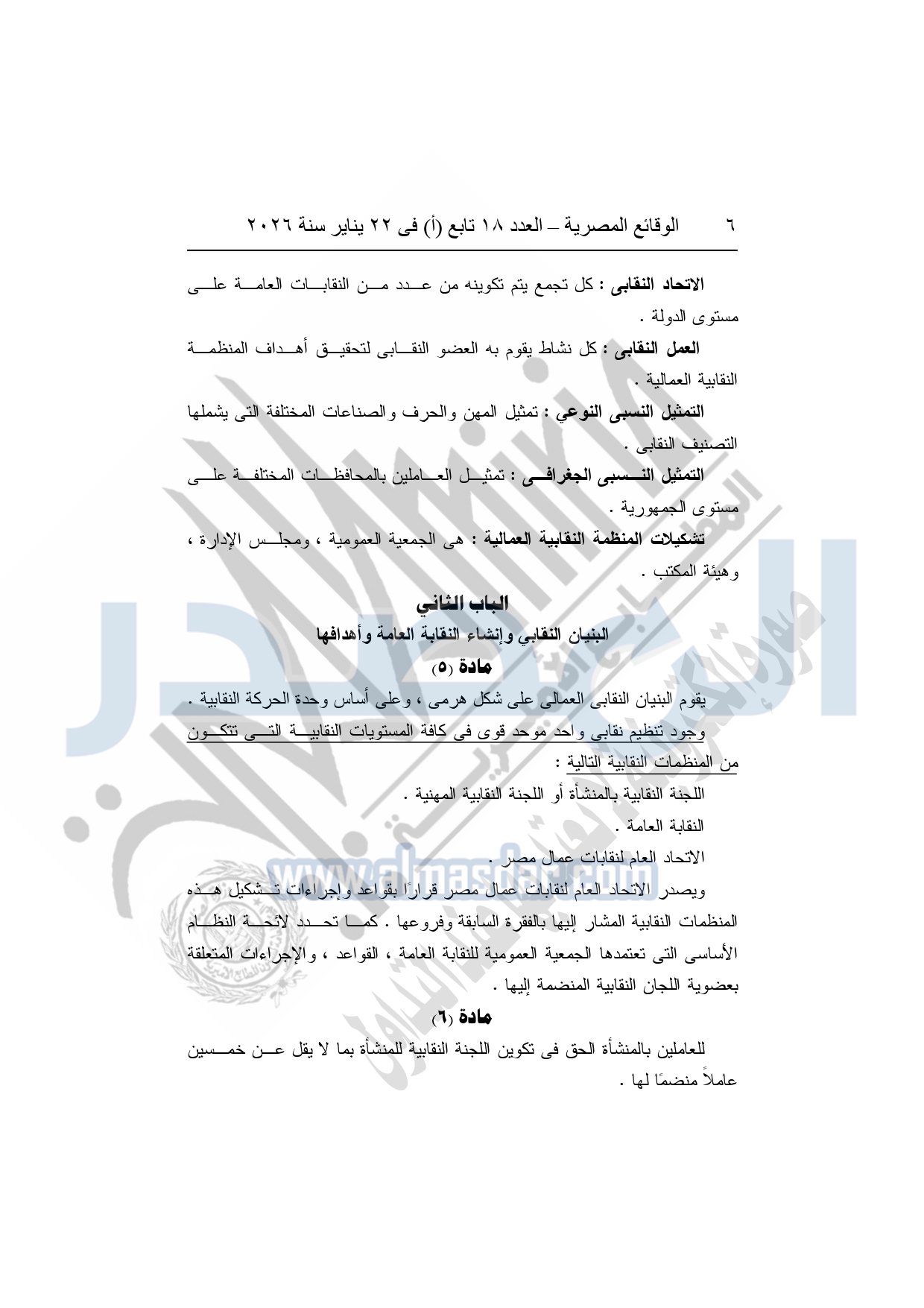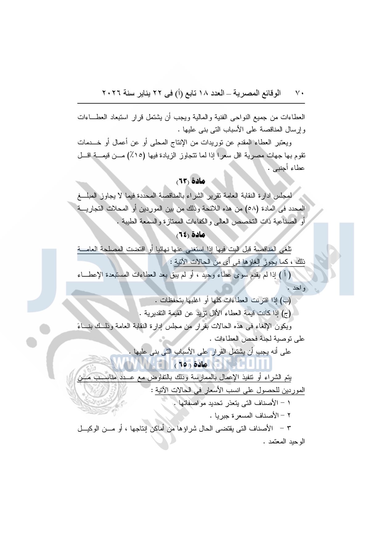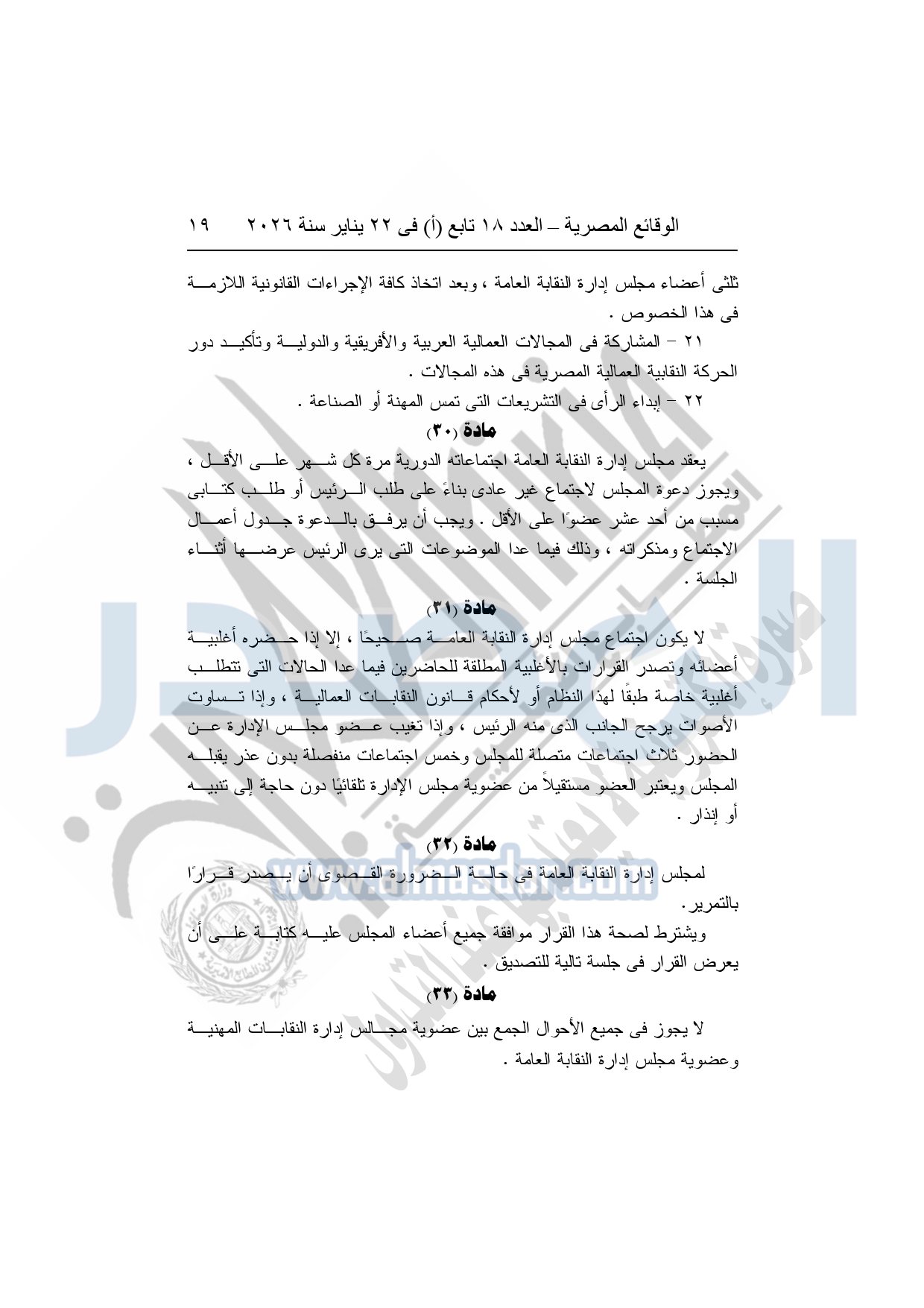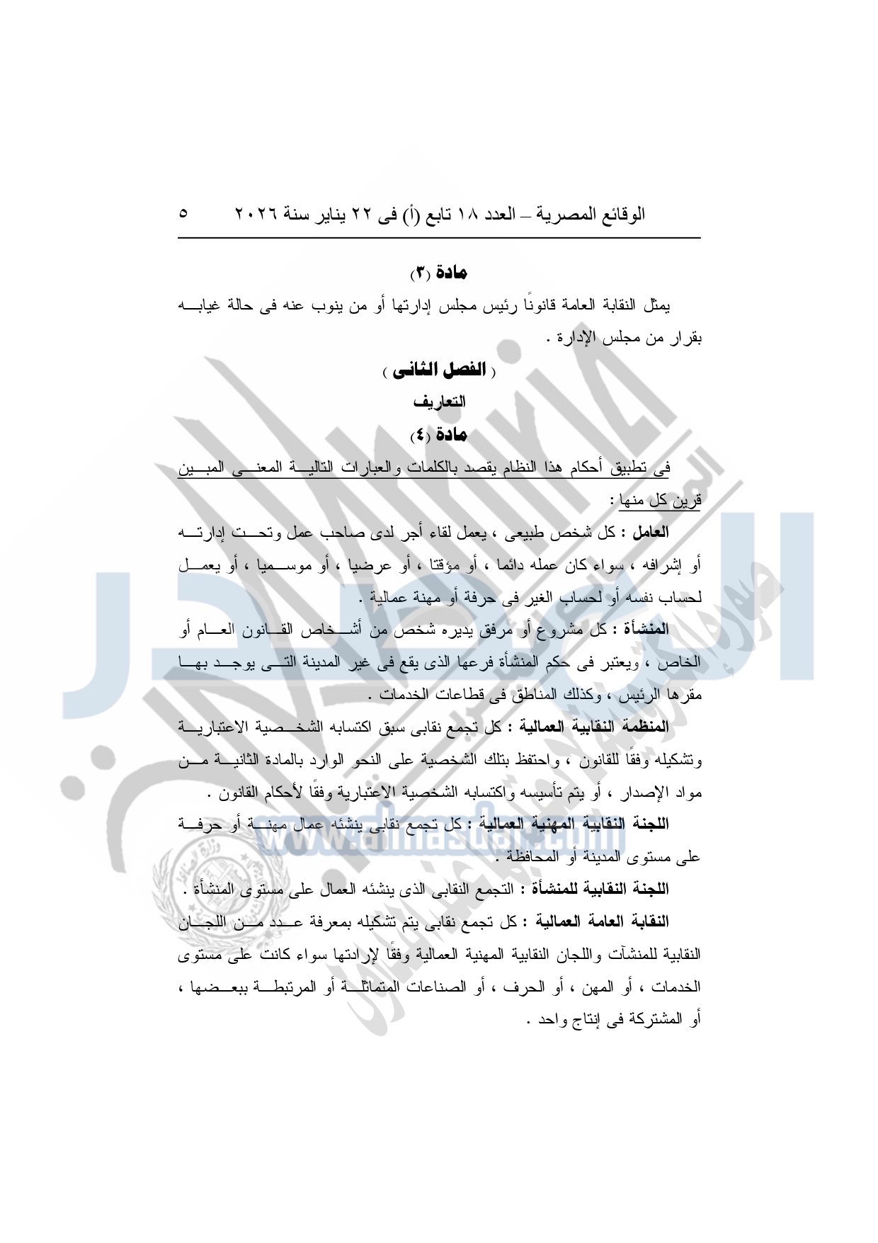 نشرت الوقائع المصرية، في العدد 18 تابع "أ"، الصادر في 22 يناير سنة 2026، بشأن النقابة العامة للعاملين بالإنتاج الحربى، قرار إدارى رقم 1 لسنة 2026، بتاريخ 21-1-2026، بشأن إعتماد لائحة النظام الأساسي للنقابة العامة للعاملين المدنيين بالإنتاج الحربي.