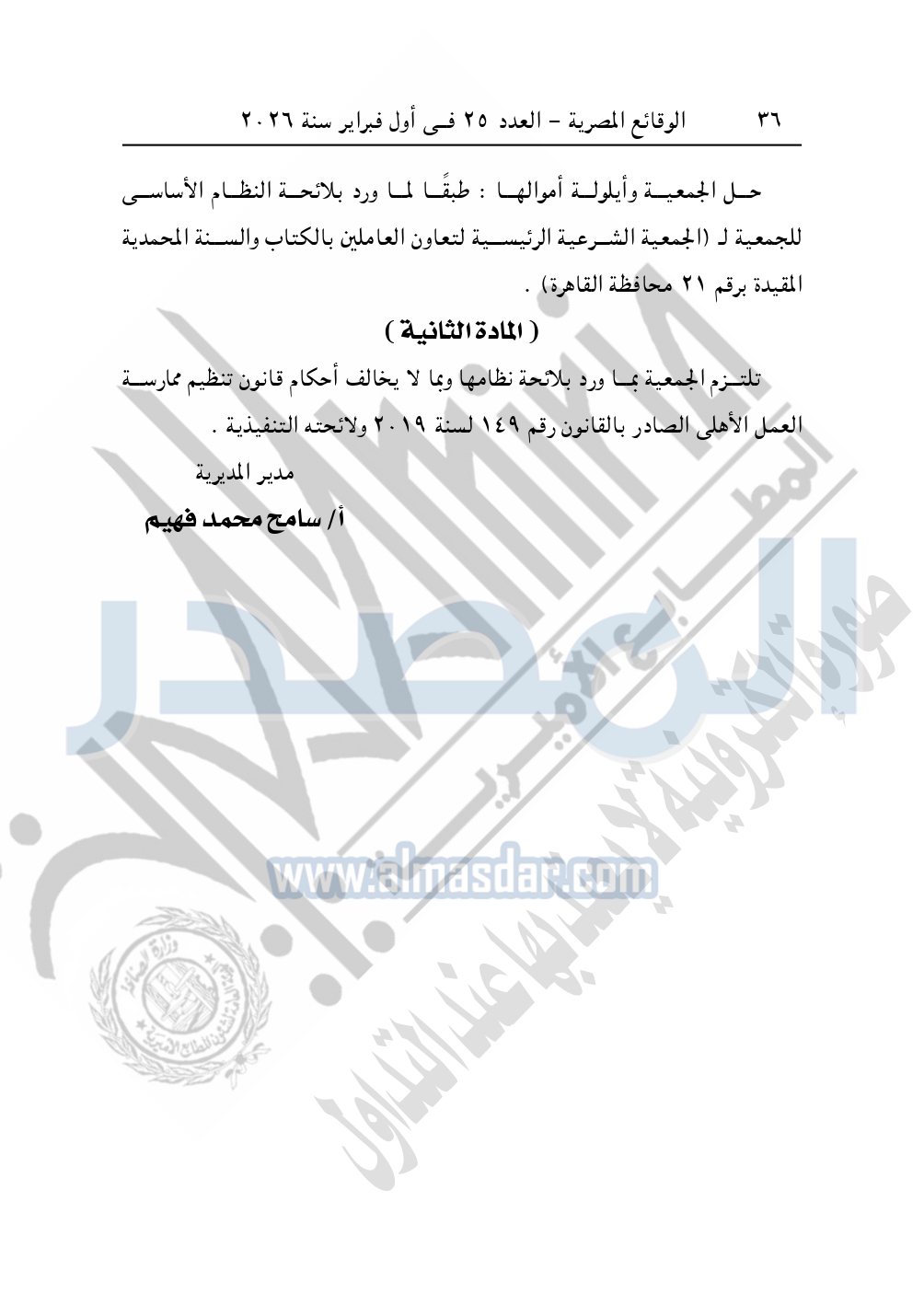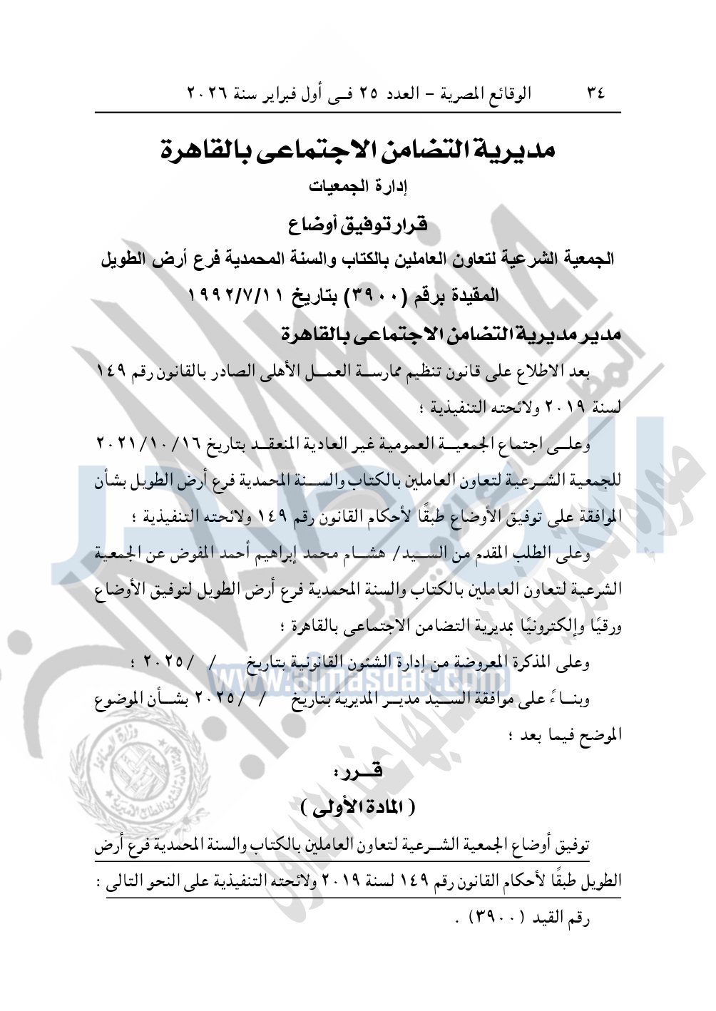 نشرت الوقائع المصرية في العدد 25، بتاريخ أول فبراير 2026، قرار مديرية التضامن الاجتماعي بالقاهرة، بشأن توفيق أوضاع الجمعية الشرعية لتعاون العاملين بالكتاب والسنة المحمدية فرع ارض الطويل، المقيدة برقم "3900" بتاريخ 11-7-1992.