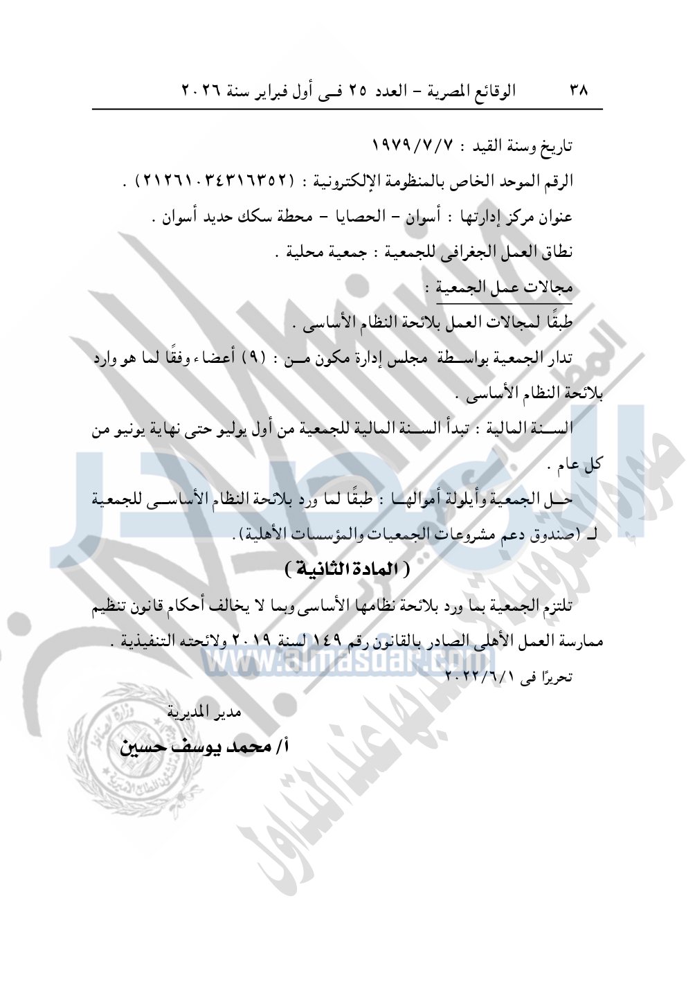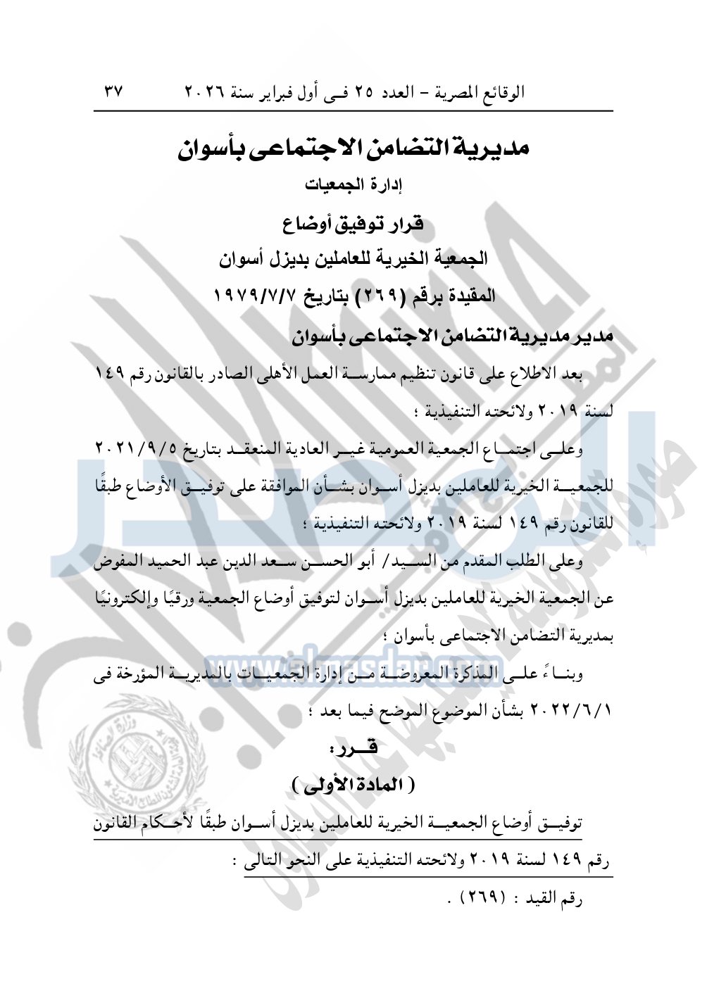 كما نشرت الوقائع المصرية في العدد 25، بتاريخ أول فبراير 2026، قرار مديرية التضامن الاجتماعي بأسوان، بشأن توفيق أوضاع الجمعية الخيرية للعاملين بديزل أسوان، المقيدة برقم "269" بتاريخ 7-7-1979.