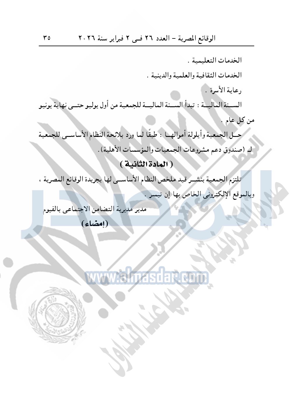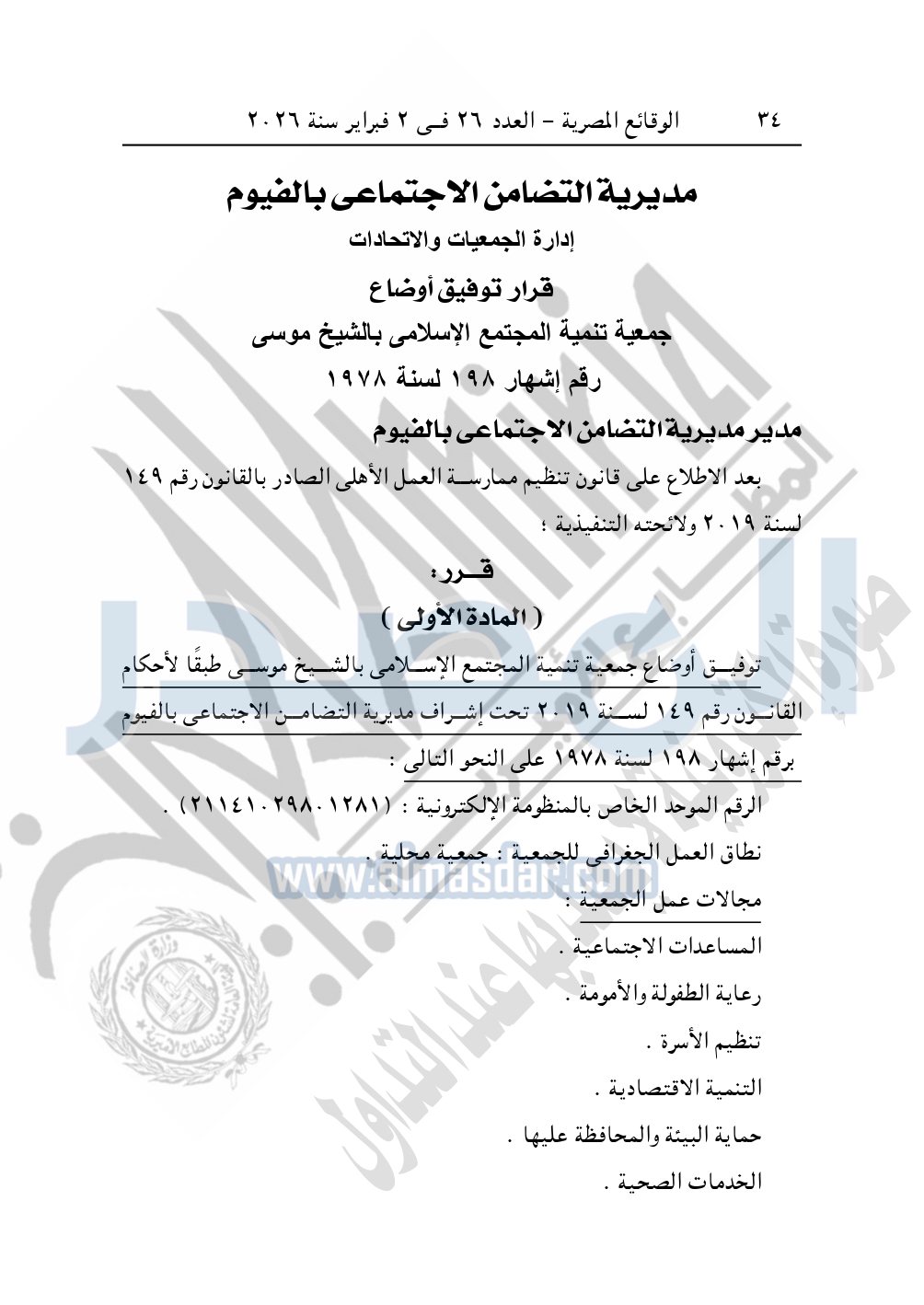 وأيضا نشرت الوقائع المصرية في العدد 26، بتاريخ 2 فبراير 2026، قرار مديرية التضامن الاجتماعي بالفيوم، بشأن توفيق أوضاع جمعية تنمية المجتمع الإسلامي بالشيخ موسى، المقيدة برقم "198" لسنة 1978.