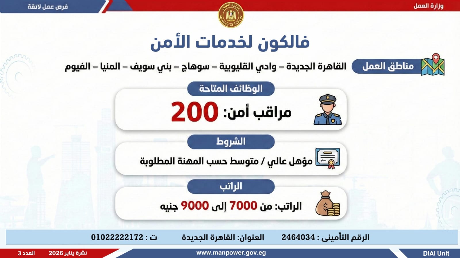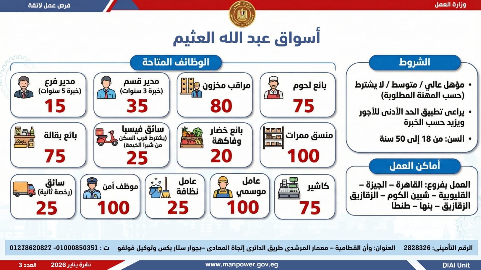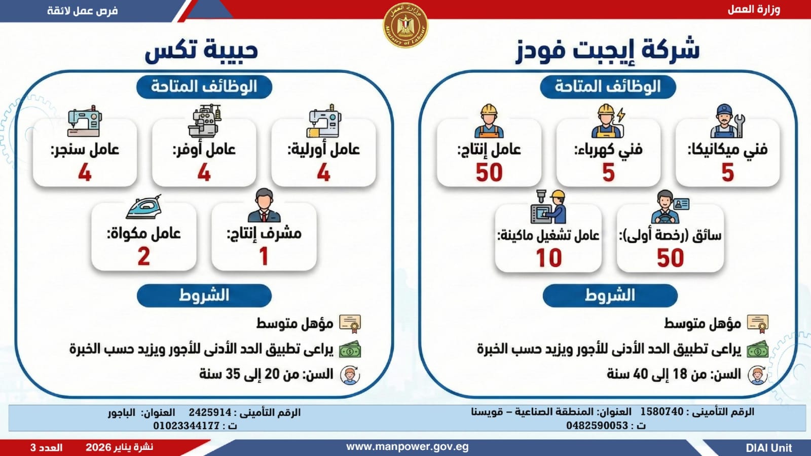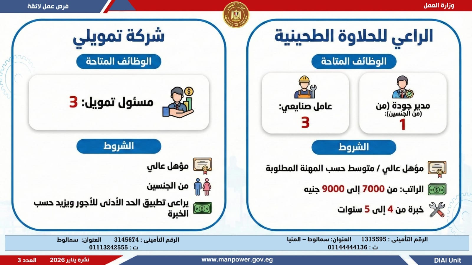 وتغطي النشرة الحالية فرص عمل بمحافظات القاهرة، القليوبية، الإسكندرية، الغربية، الإسماعيلية، المنيا، سوهاج، بني سويف، والمنوفية، قنا، ودمياط والفيوم.