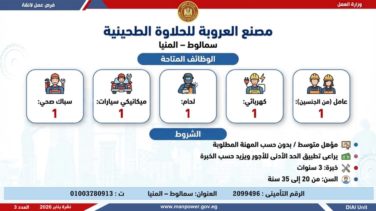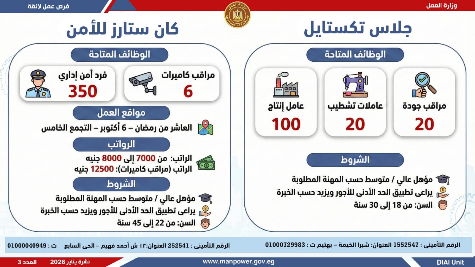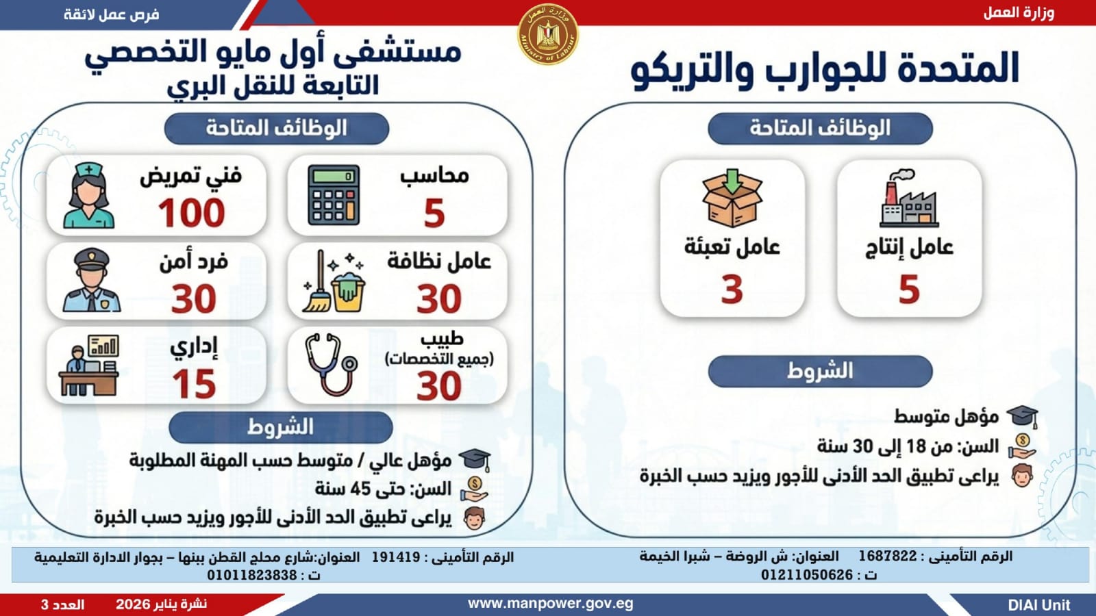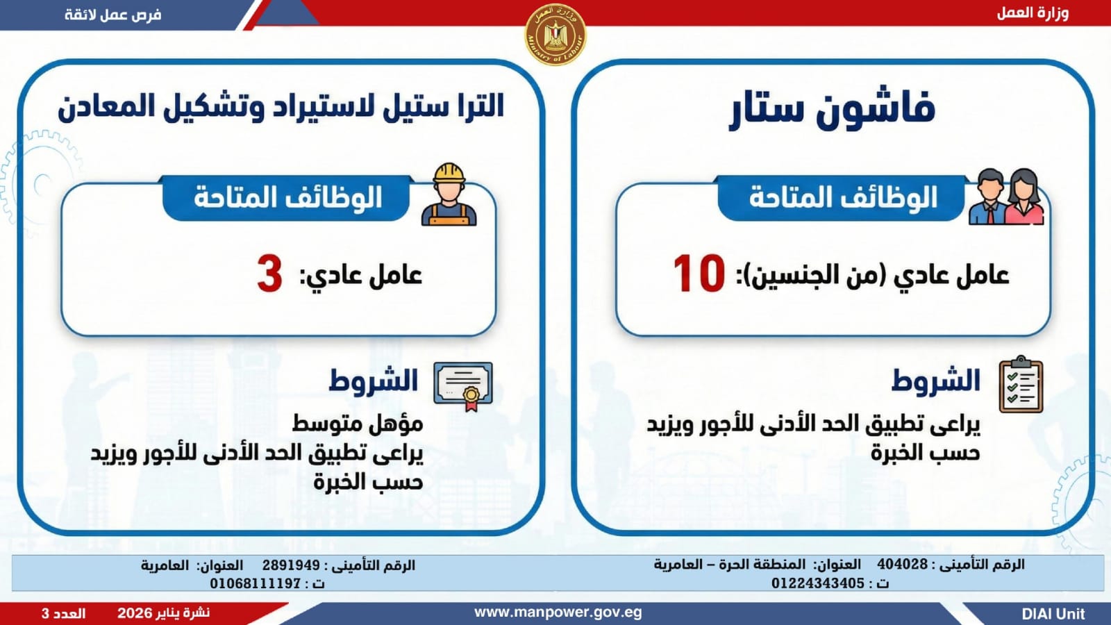وأضافت، أن نشرة التوظيف نصف الشهرية تصدر بصفة منتظمة كل 15 يومًا من خلال الإدارة العامة للتشغيل برئاسة هبة أحمد، وبإعداد منى شوقي – باحث أول بالإدارة، وتتضمن أحدث فرص العمل المتاحة على مستوى الجمهورية.