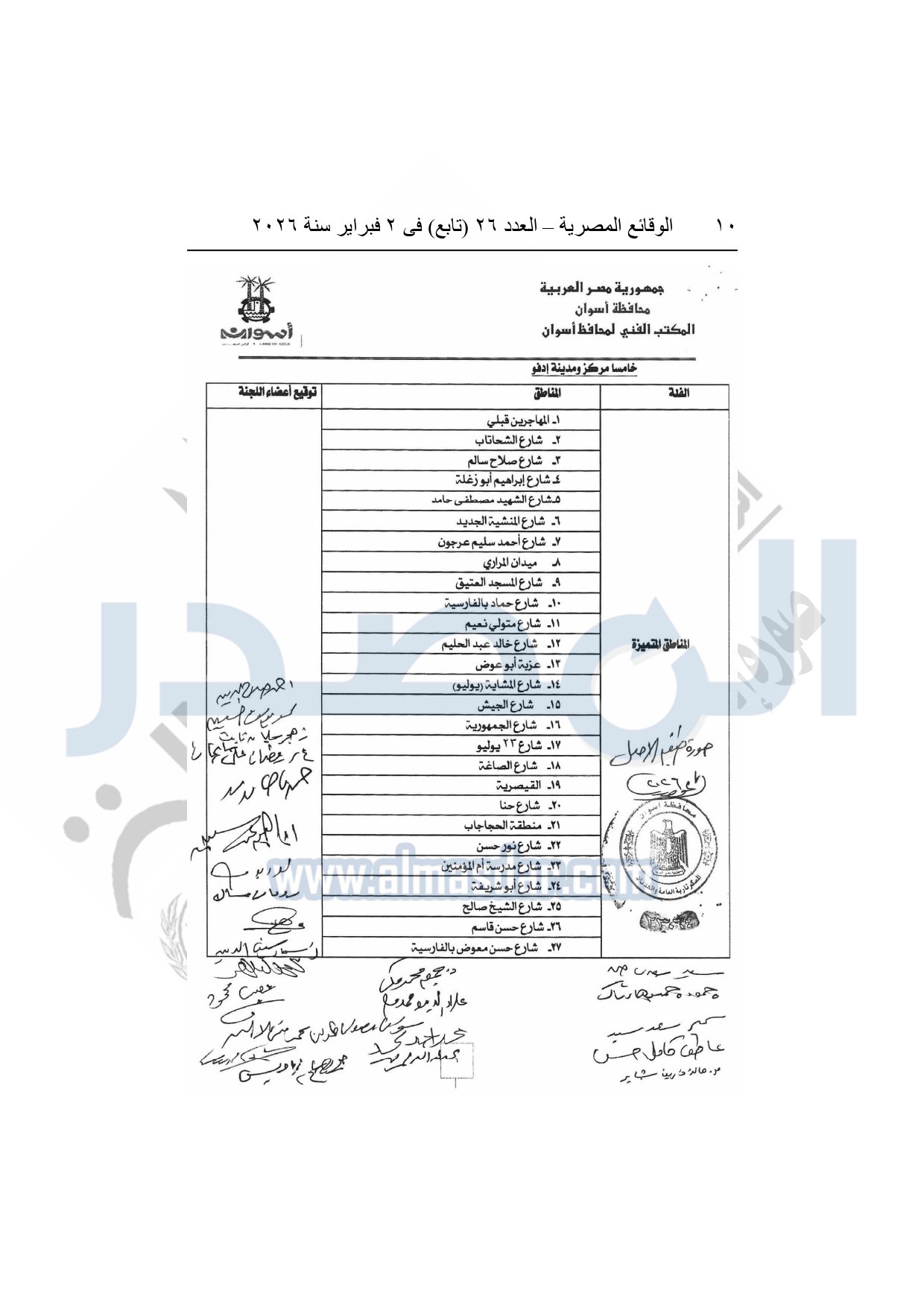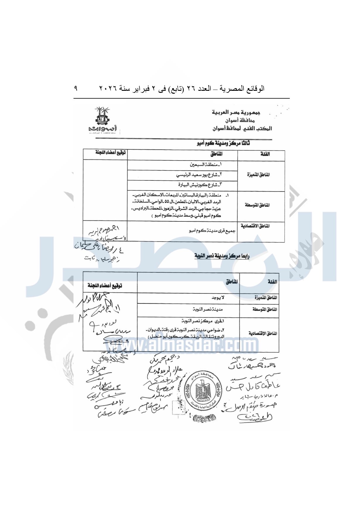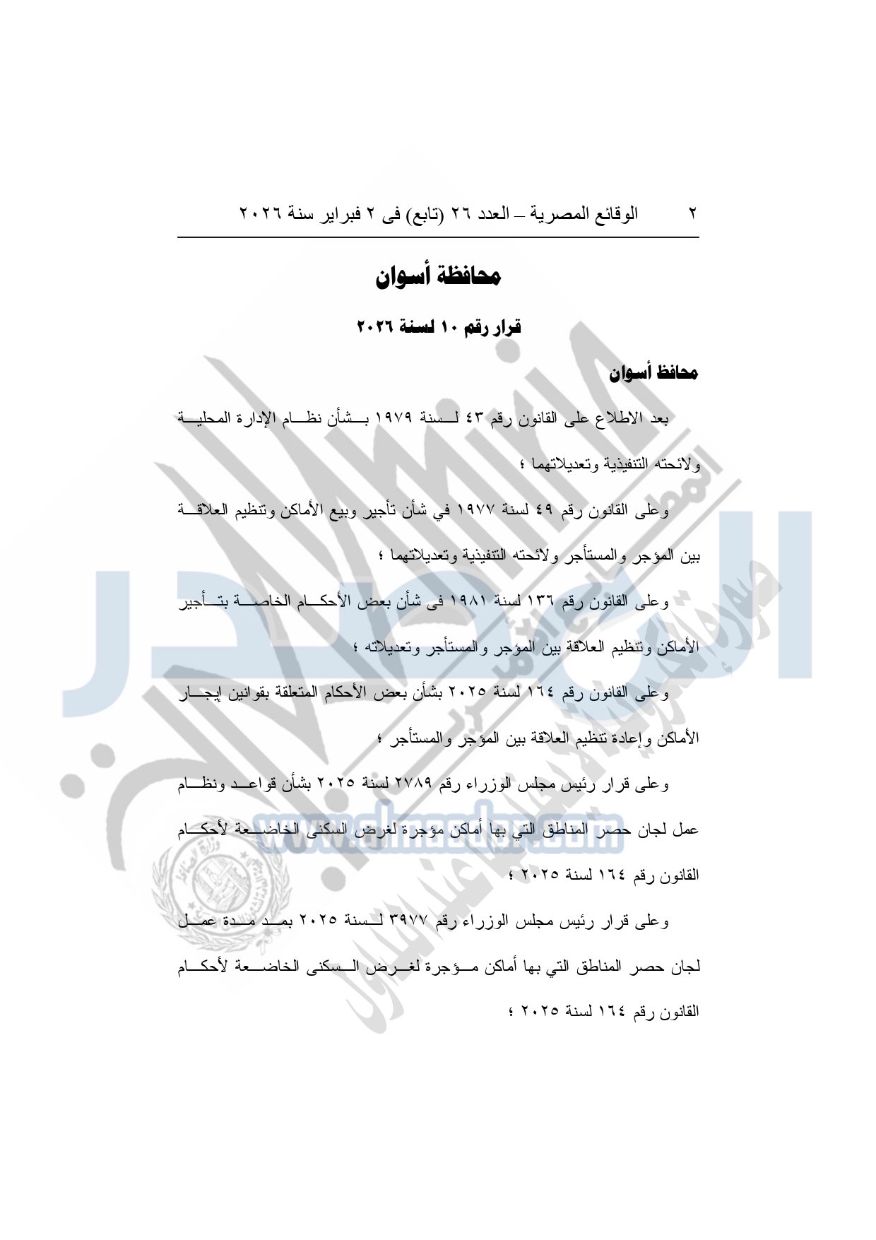 نشرت الوقائع المصرية في العدد 26 "تابع"، الصادر في 2 فبراير سنة 2026، قرار محافظة أسوان، رقم 10 لسنة 2026، بشأن بعض الأحكام المتعلقة بقوانين إيجار الأماكن وإعادة تنظيم العلاقة بين المؤجر والمستأجر بنطاق محافظة أسوان.