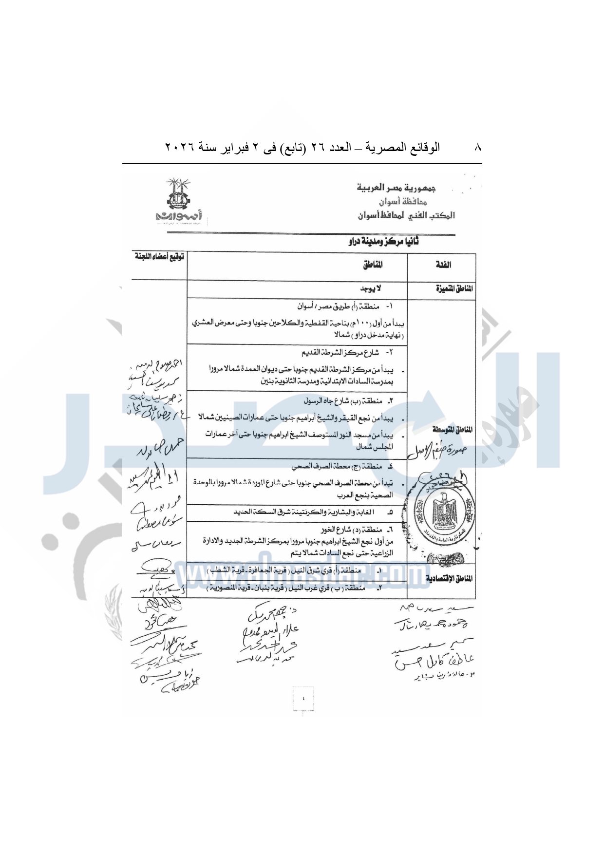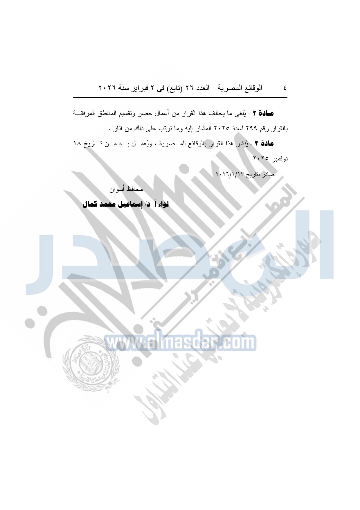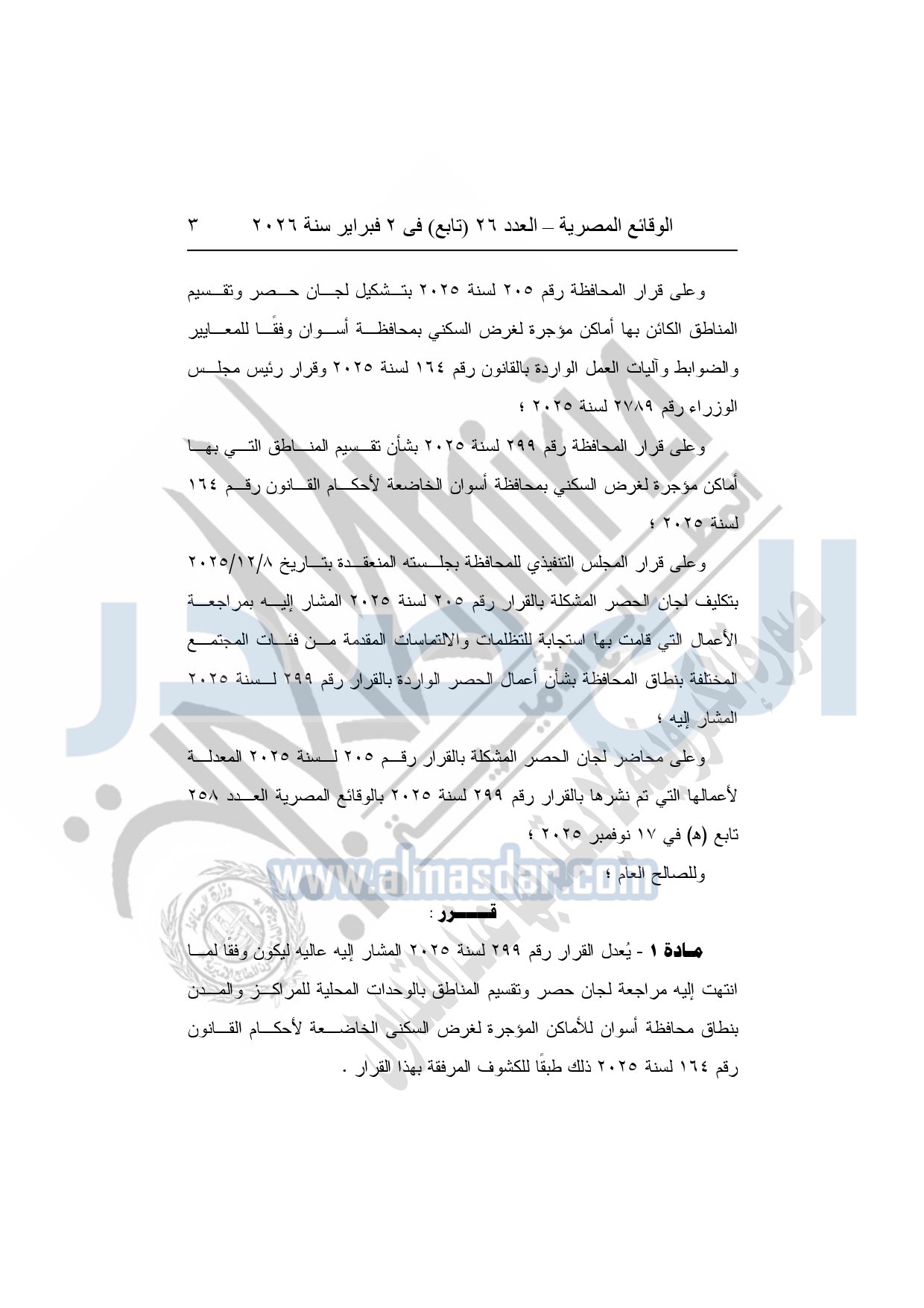 يُعدل القرار رقم 299 لسنة 2025 المشار إليه عاليه ليكون وفقا لما انتهت إليه مراجعة لجان حصر وتقسيم المناطق بالوحدات المحلية للمراكز والمدن بنطاق محافظة أسوان للأماكن المؤجرة لغرض السكنى الخاضعة لأحكام القانون رقم 164 لسنة 2025 ذلك طبقا للكشوف المرفقة بهذا القرار.