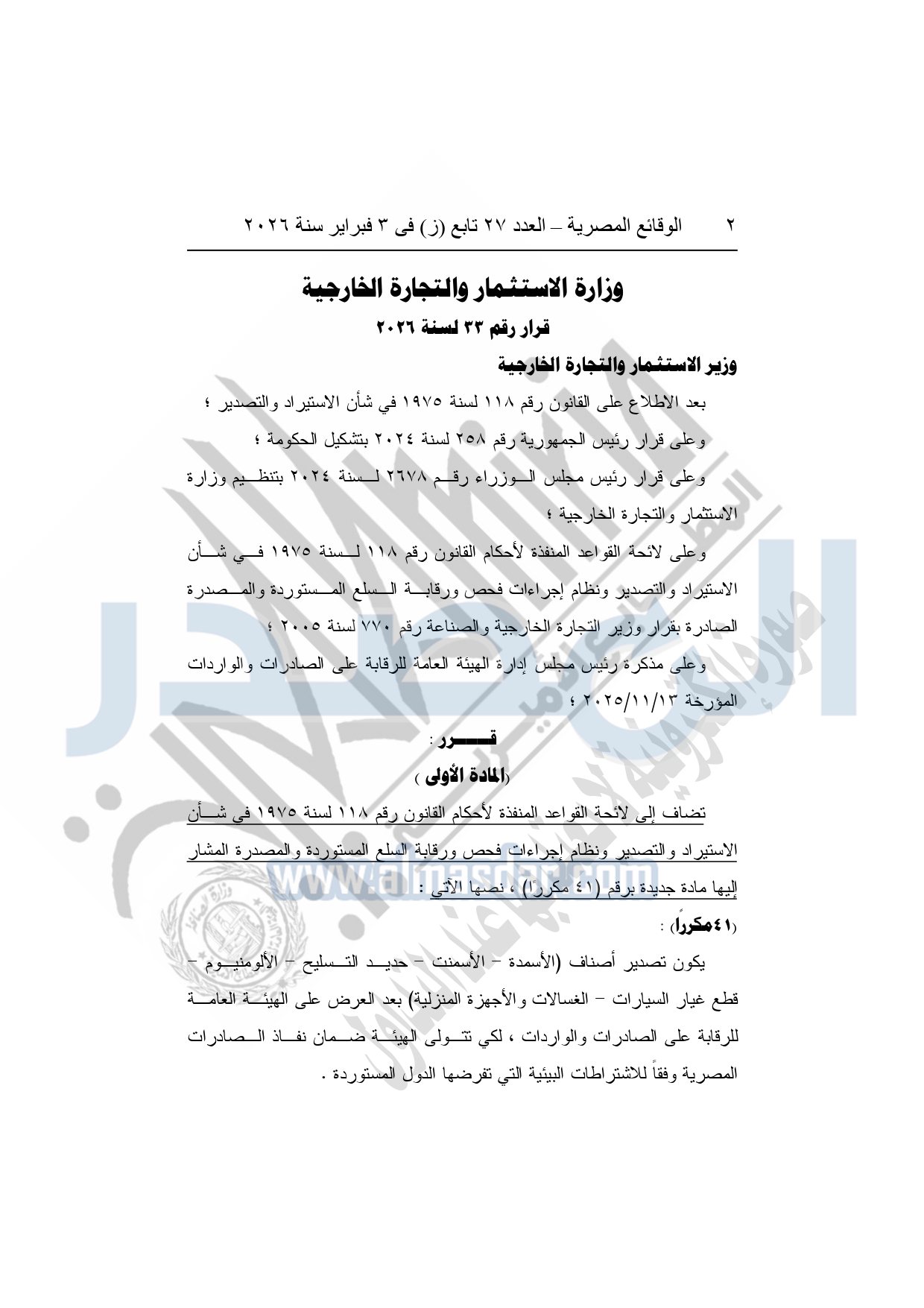 نشرت الوقائع المصرية، في العدد 27 تابع "ز"، الصادر في 3 فبراير سنة 2026، قرار وزارة الاستثمار والتجارة الخارجية، قرار رقم 33 لسنة 2026، بشأن الاستيراد والتصدير ونظام إجراءات فحص ورقابة السلع المستوردة والمصدرة.
