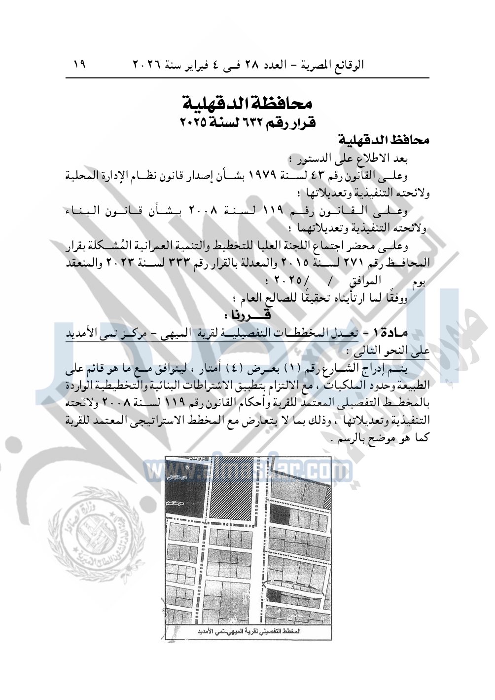 نشرت الوقائع المصرية، في العدد 28، الصادر في 4 فبراير سنة 2026، قرار محافظة الدقهلية، قرار رقم 632 لسنة 2025، بشأن تعديل المخططات التفصيلية لقرية الميهي.