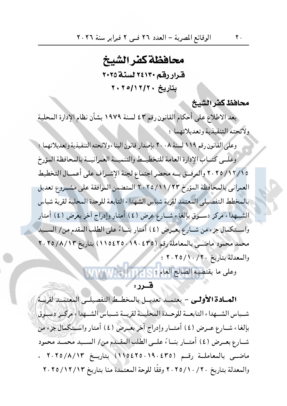 كما نشرت الوقائع المصرية، في العدد 26، الصادر في 2 فبراير سنة 2026، قرار محافظة كفر الشيخ، قرار رقم 24130 لسنة 2025، بتاريخ 20-12-2025، بشأن إعتماد تعديل بالمخطط التفصيلي المعتمد لقرية شباس.