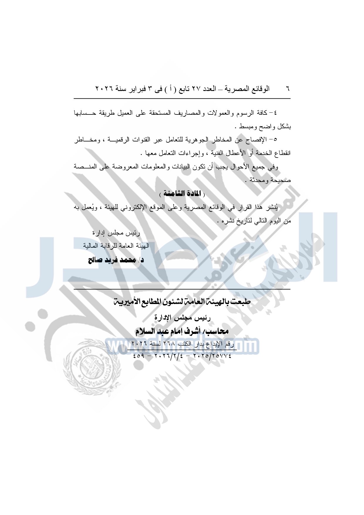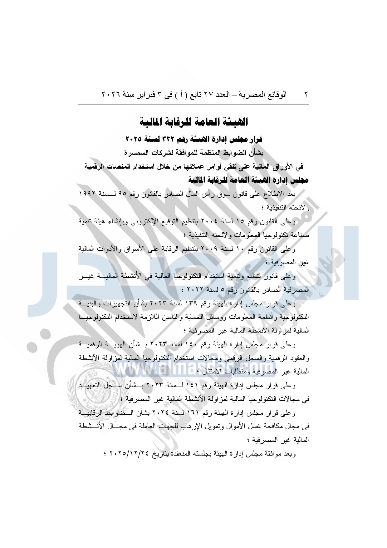 نشرت الوقائع المصرية، في العدد 27 تابع "أ"، الصادر فى 3 فبراير سنة 2026، قرار الهيئة العامة للرقابة المالية، قرار مجلس إدارة الهيئة رقم 332 لسنة 2025، بشأن الضوابط المنظمة للموافقة لشركات السمسرة في الأوراق المالية على تلقي أوامر عملائها من خلال استخدام المنصات الرقمية.