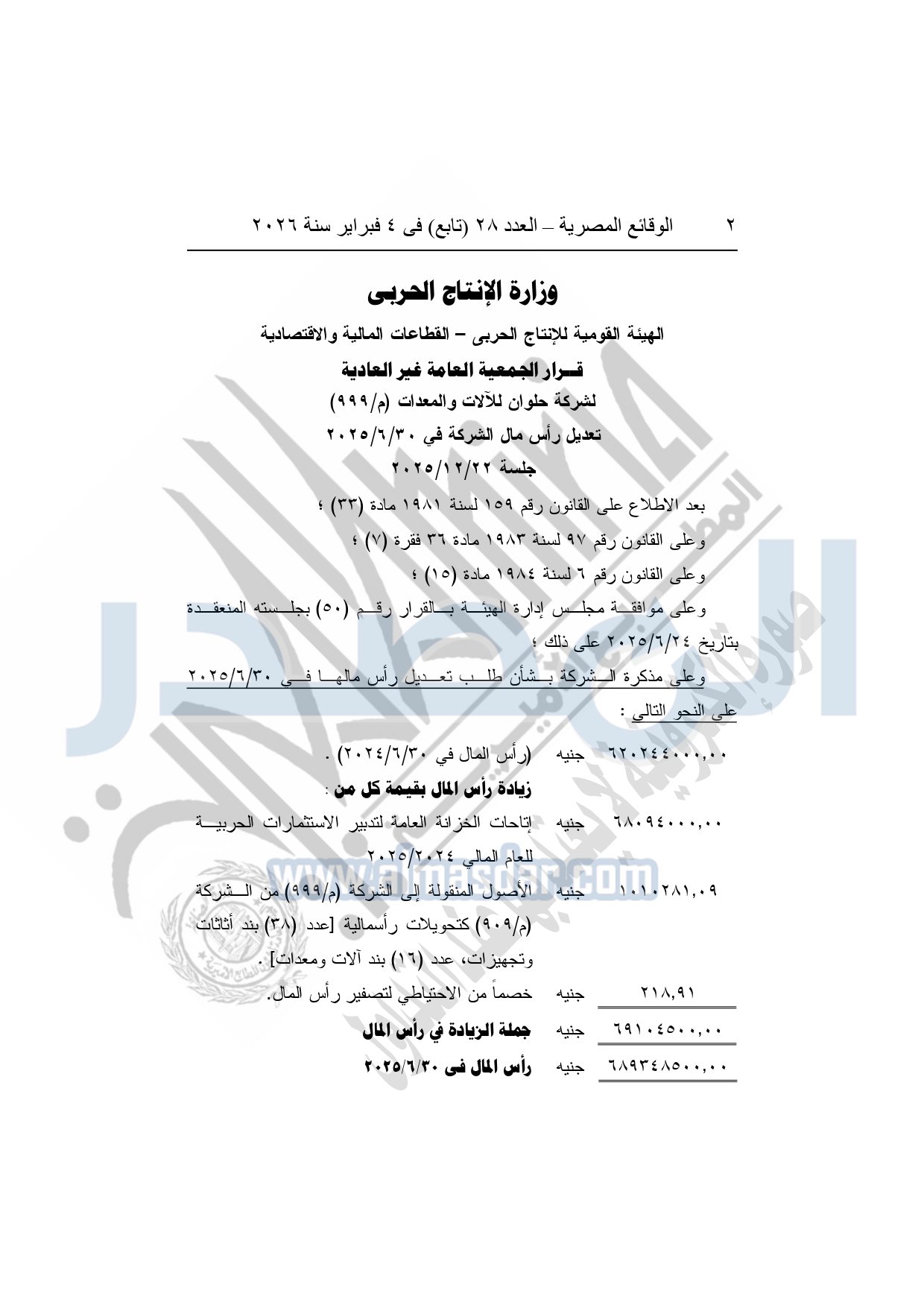 نشرت الوقائع المصرية، في العدد 28 "تابع"، الصادر فى 4 فبراير سنة 2026، قرار وزارة الإنتاج الحربى، الهيئة القومية للإنتاج الحربي - القطاعات المالية والاقتصادية قرار الجمعية العامة غير العادية لشركة حلوان للآلات والمعدات "م / 999"، تعديل رأس مال الشركة في 30-6-2025، جلسة 22-12-2025.