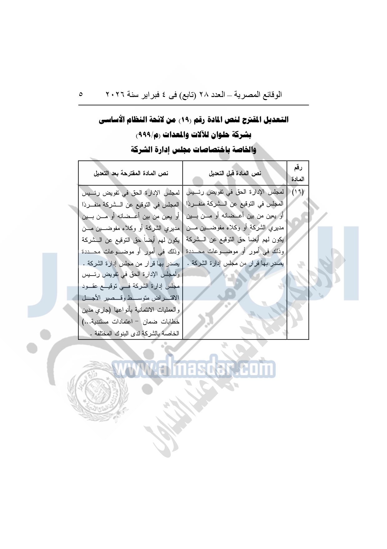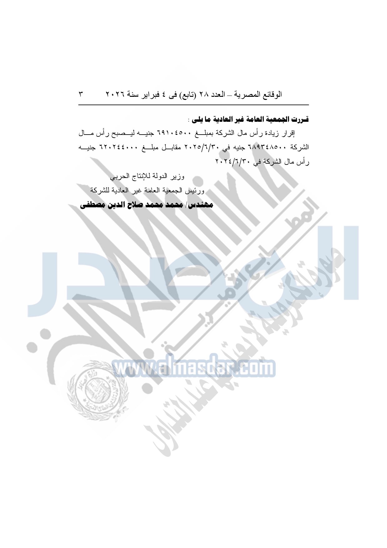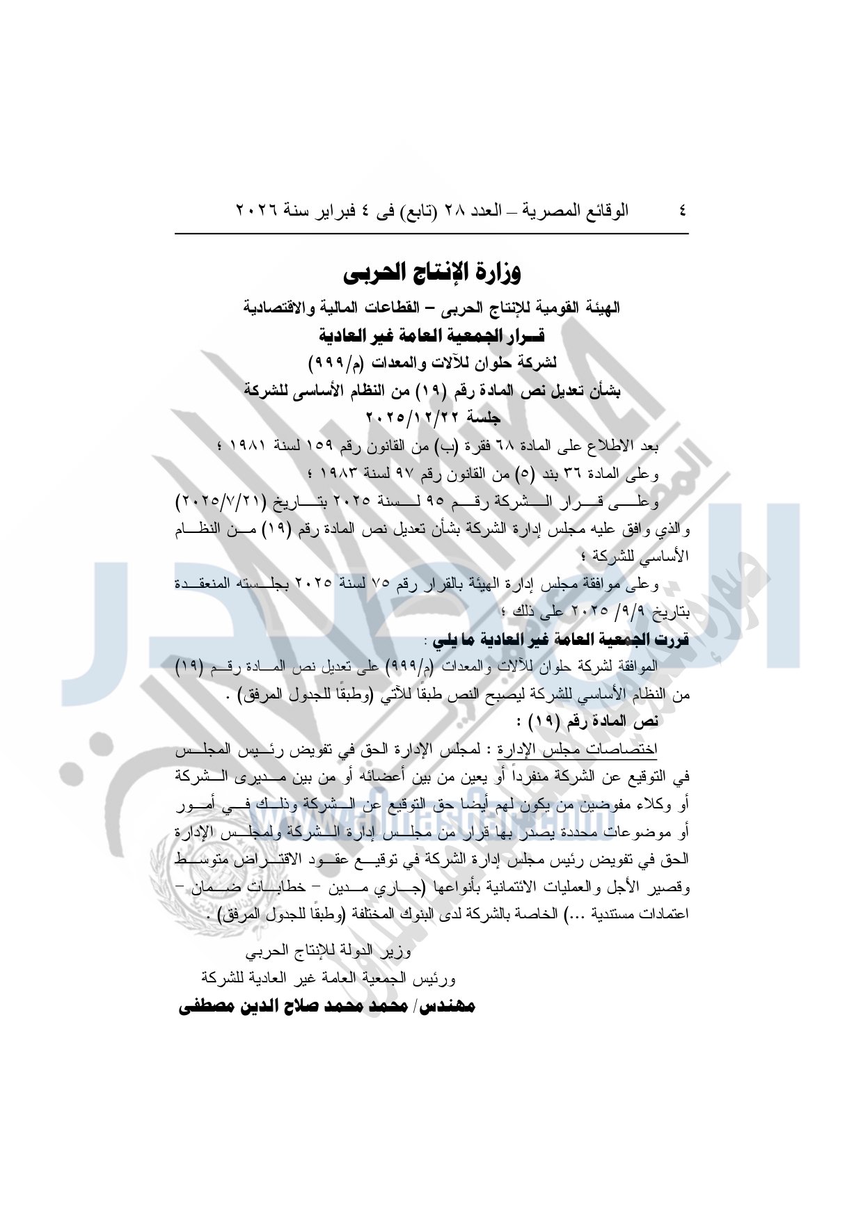 كما نشرت الوقائع المصرية، في العدد 28 "تابع"، الصادر فى 4 فبراير سنة 2026، قرار وزارة الإنتاج الحربى، الهيئة القومية للإنتاج الحربي - القطاعات المالية والاقتصادية قرار الجمعية العامة غير العادية لشركة حلوان للآلات والمعدات "م / 999"، تعديل رأس مال الشركة في 30-6-2025، جلسة 22-12-2025.