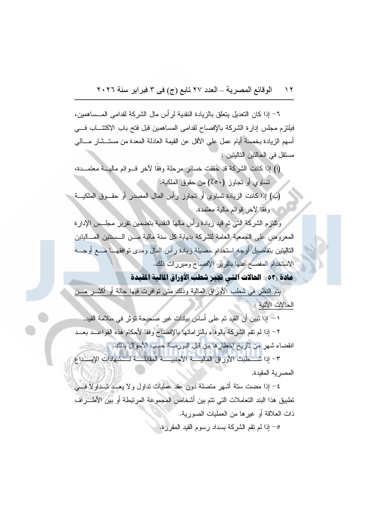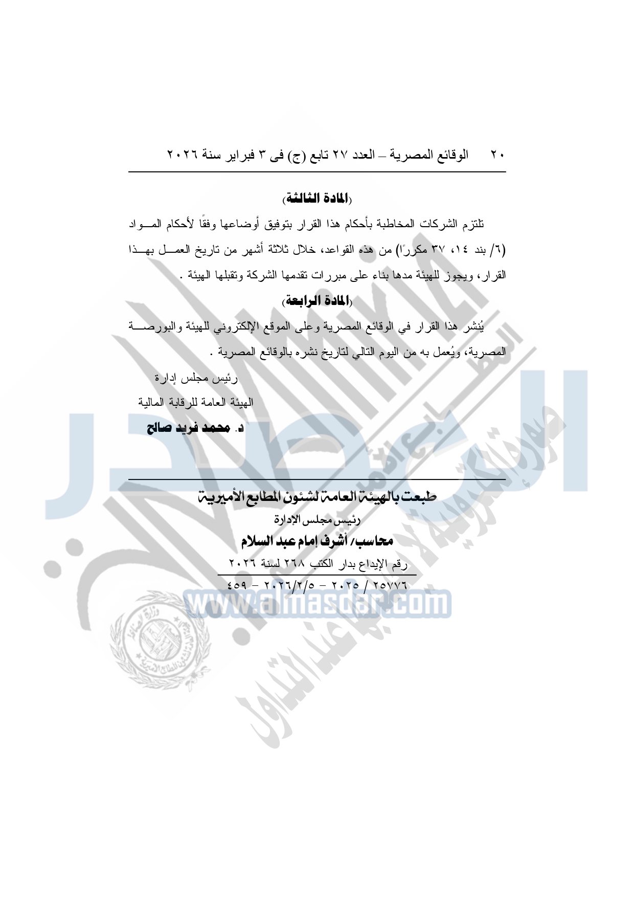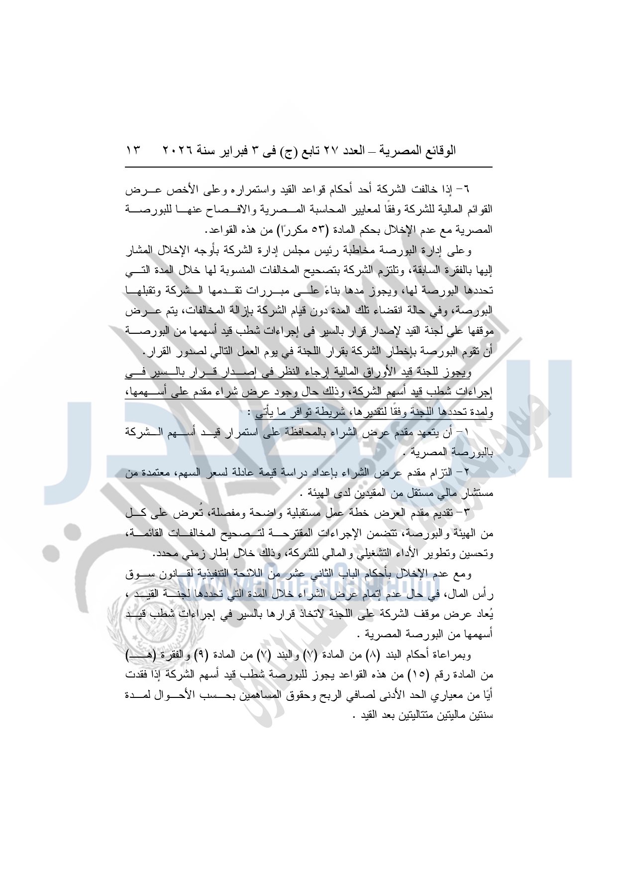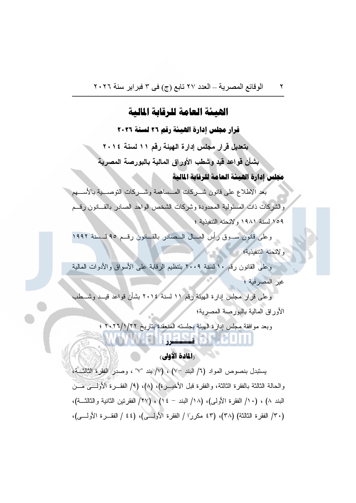 نشرت الوقائع المصرية، في العدد 27 تابع "ج"، الصادر في 3 فبراير سنة 2026، قرار الهيئة العامة للرقابة المالية، قرار مجلس إدارة الهيئة رقم 26 لسنة 2026، بتعديل قرار مجلس إدارة الهيئة رقم 11 لسنة 2014، بشأن قواعد قيد وشطب الأوراق المالية بالبورصة المصرية.