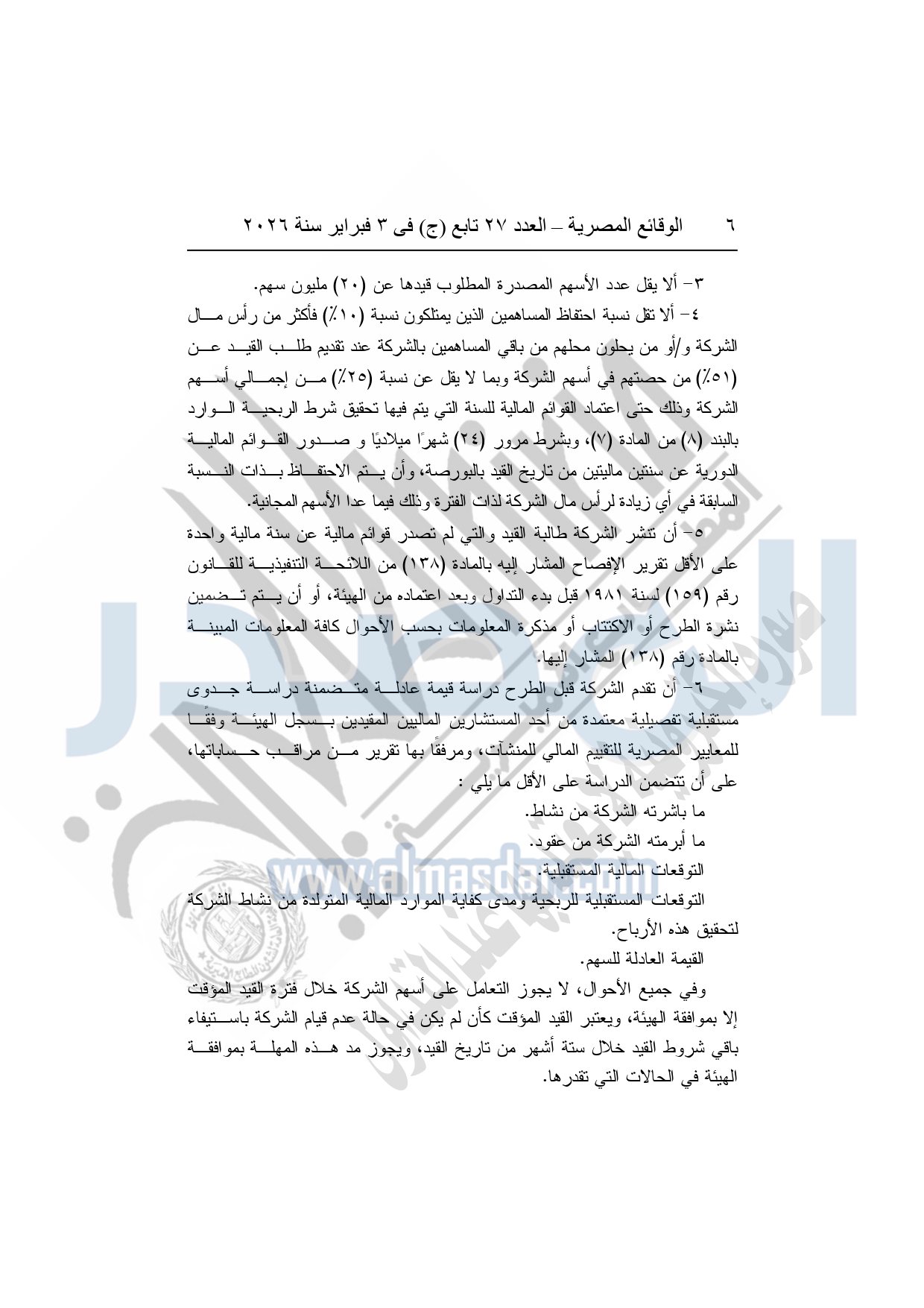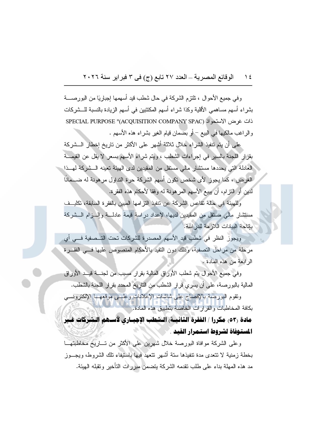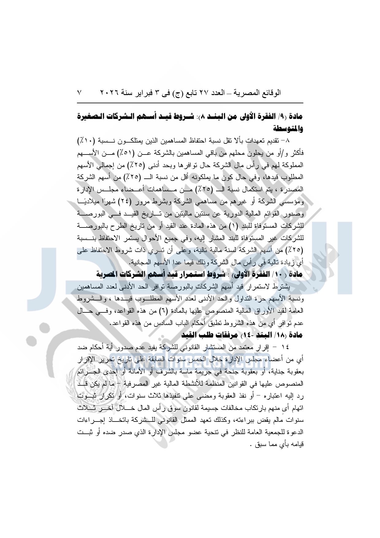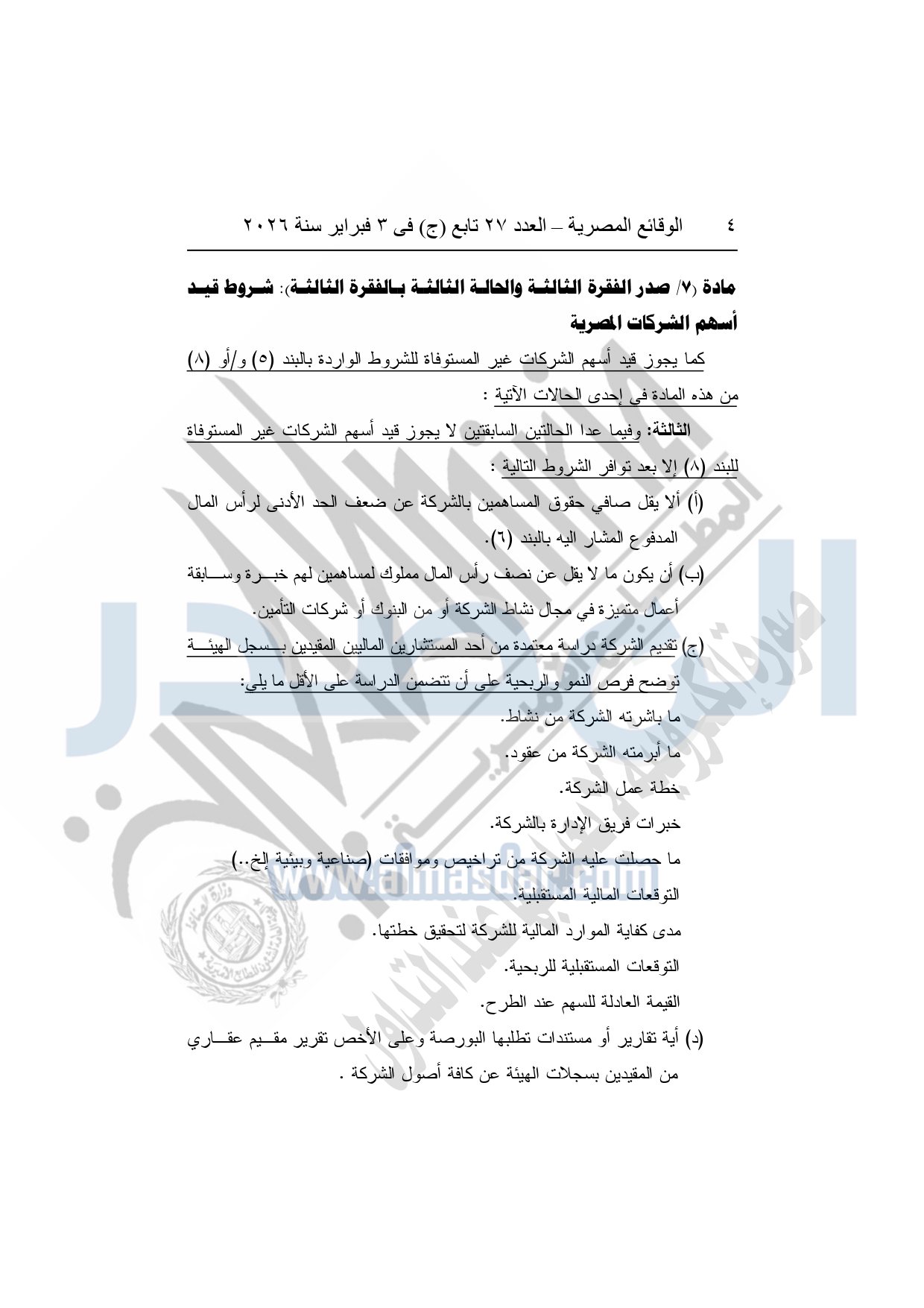 نشرت الوقائع المصرية، في العدد 27 تابع "ج"، الصادر في 3 فبراير سنة 2026، قرار الهيئة العامة للرقابة المالية، قرار مجلس إدارة الهيئة رقم 26 لسنة 2026، بتعديل قرار مجلس إدارة الهيئة رقم 11 لسنة 2014، بشأن قواعد قيد وشطب الأوراق المالية بالبورصة المصرية.