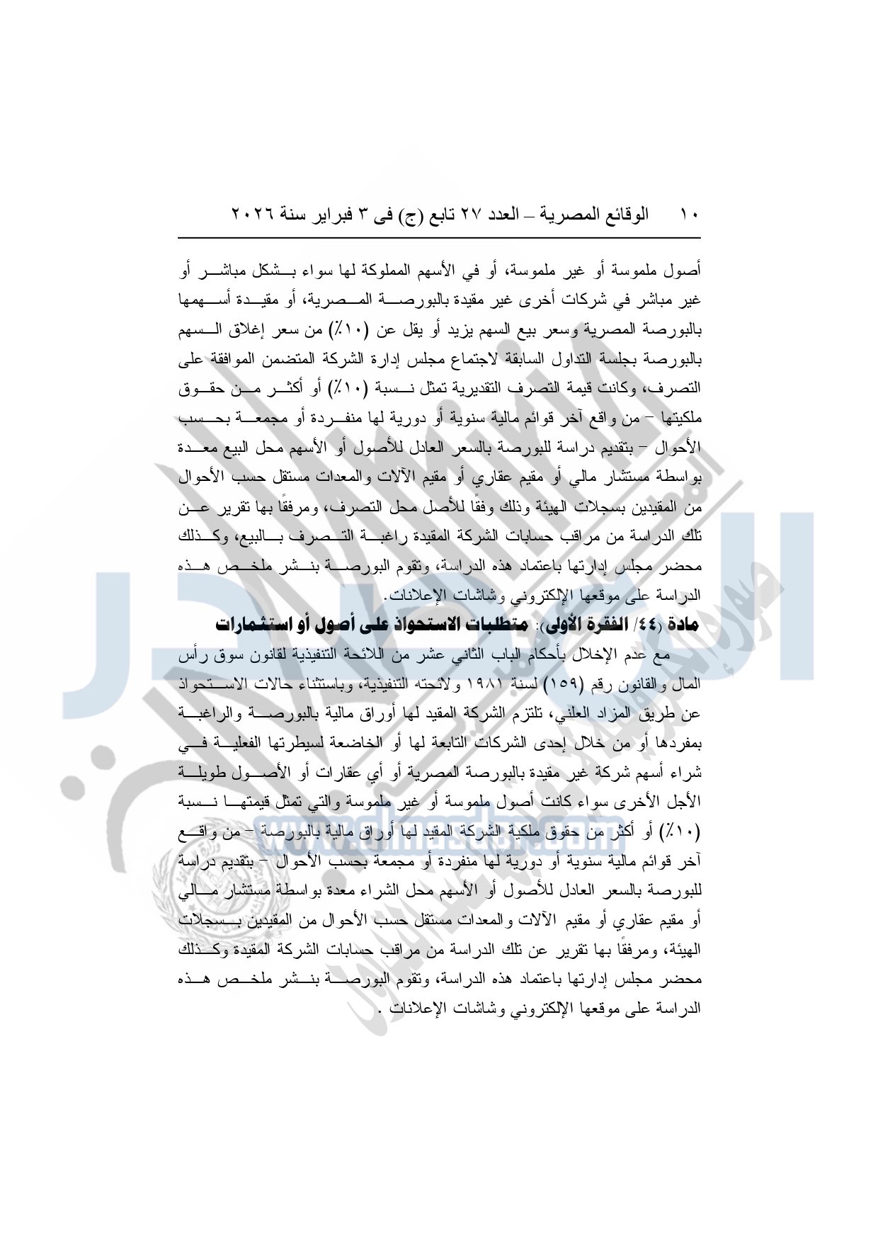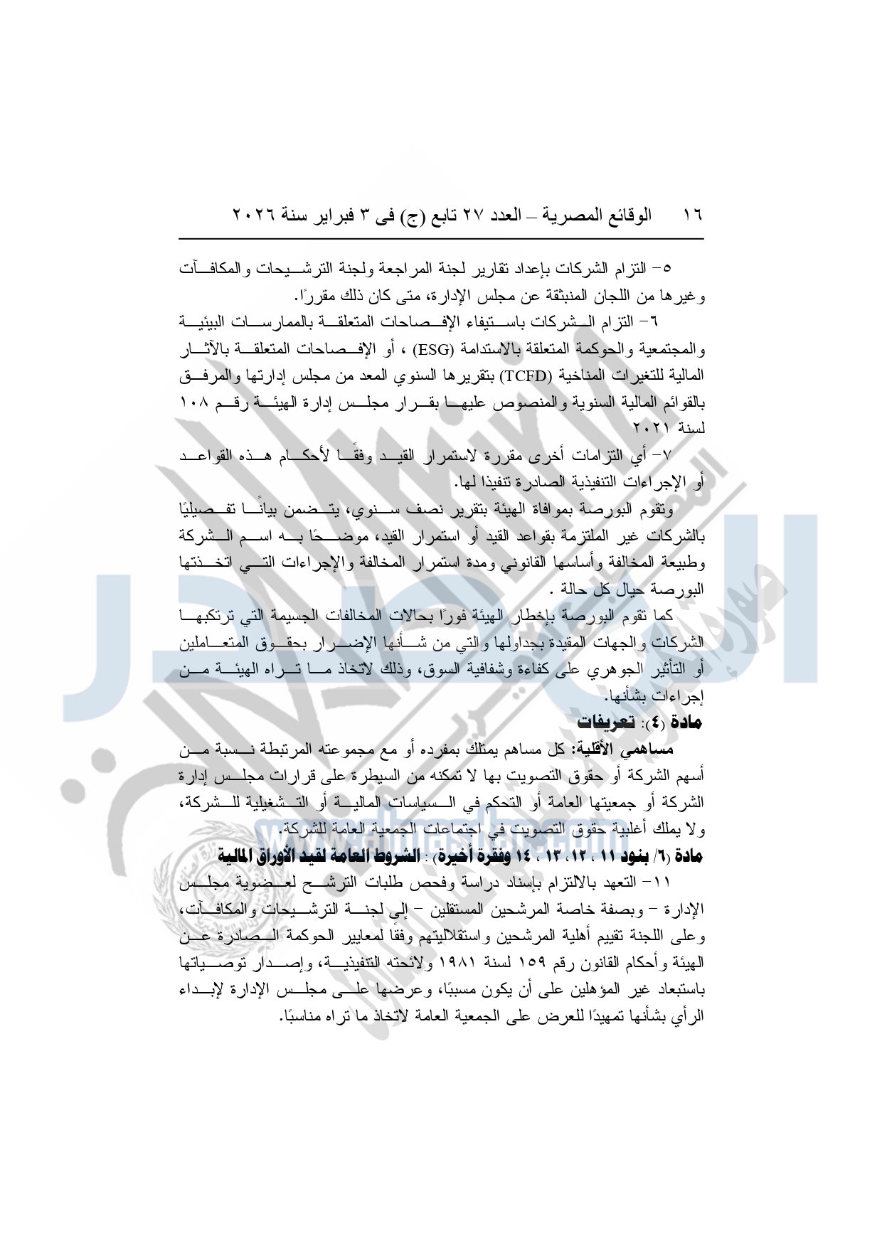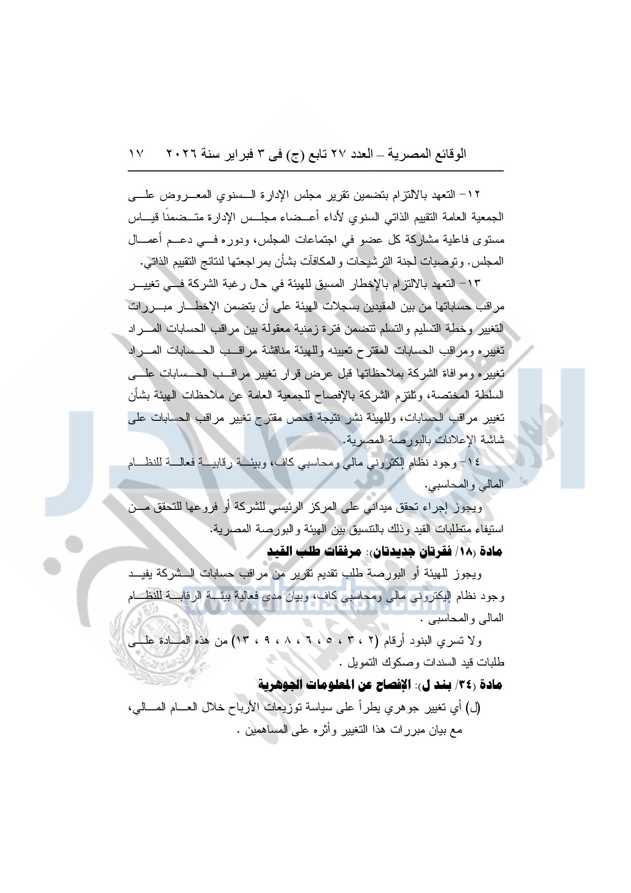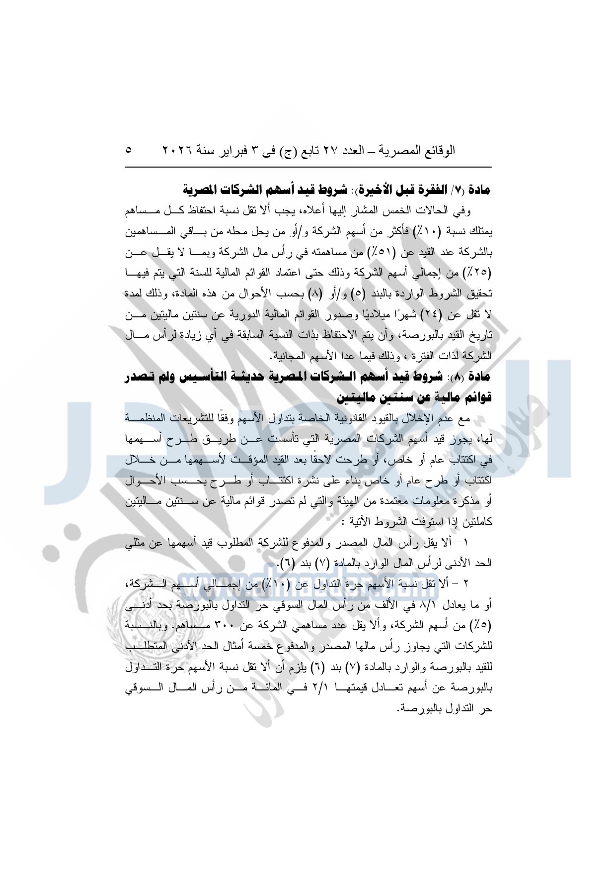 نشرت الوقائع المصرية، في العدد 27 تابع "ج"، الصادر في 3 فبراير سنة 2026، قرار الهيئة العامة للرقابة المالية، قرار مجلس إدارة الهيئة رقم 26 لسنة 2026، بتعديل قرار مجلس إدارة الهيئة رقم 11 لسنة 2014، بشأن قواعد قيد وشطب الأوراق المالية بالبورصة المصرية.