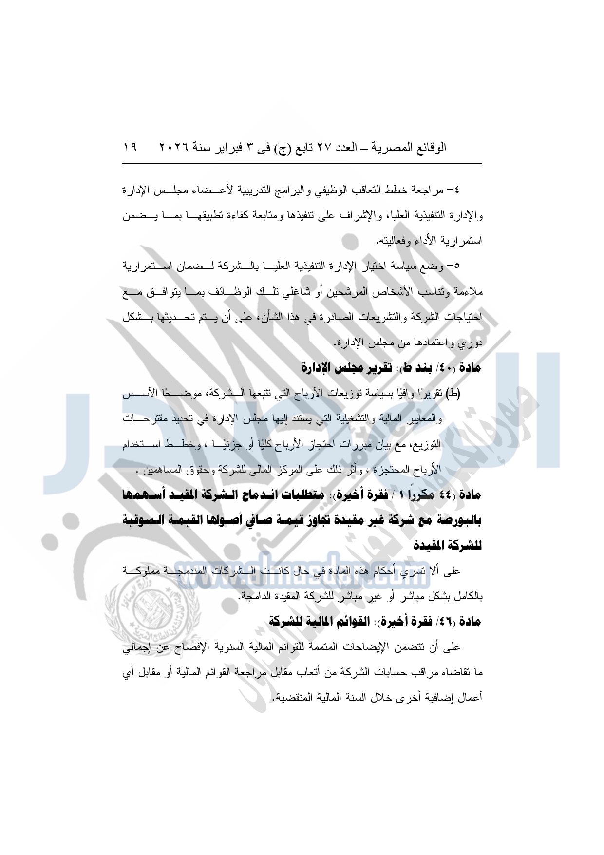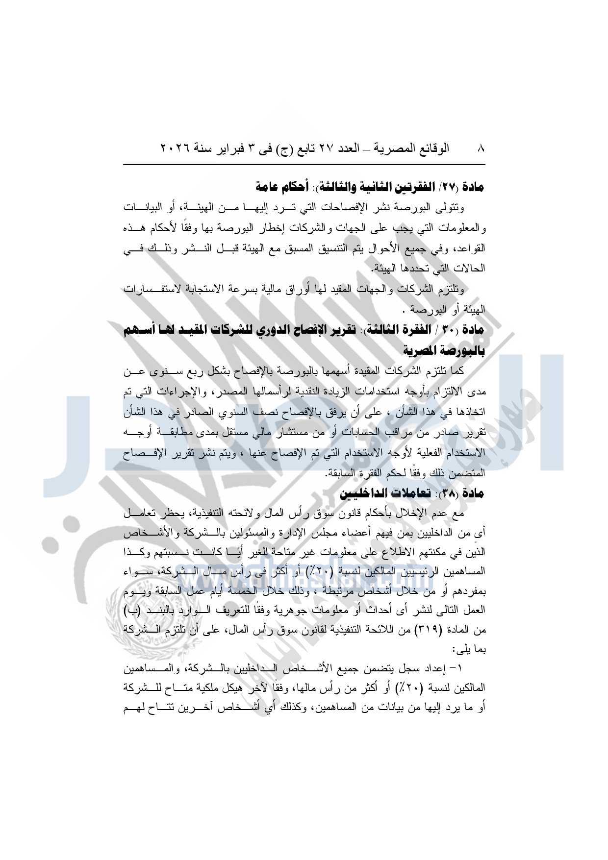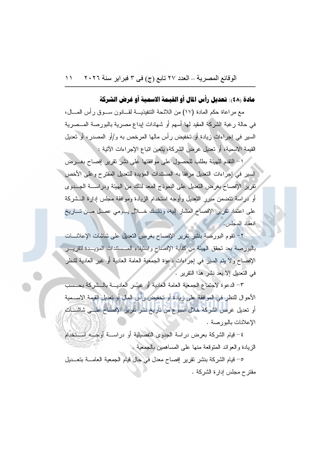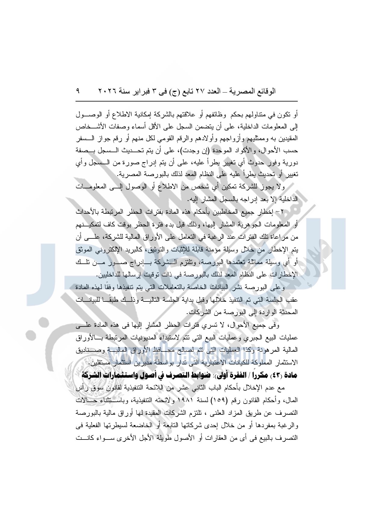 نشرت الوقائع المصرية، في العدد 27 تابع "ج"، الصادر في 3 فبراير سنة 2026، قرار الهيئة العامة للرقابة المالية، قرار مجلس إدارة الهيئة رقم 26 لسنة 2026، بتعديل قرار مجلس إدارة الهيئة رقم 11 لسنة 2014، بشأن قواعد قيد وشطب الأوراق المالية بالبورصة المصرية.