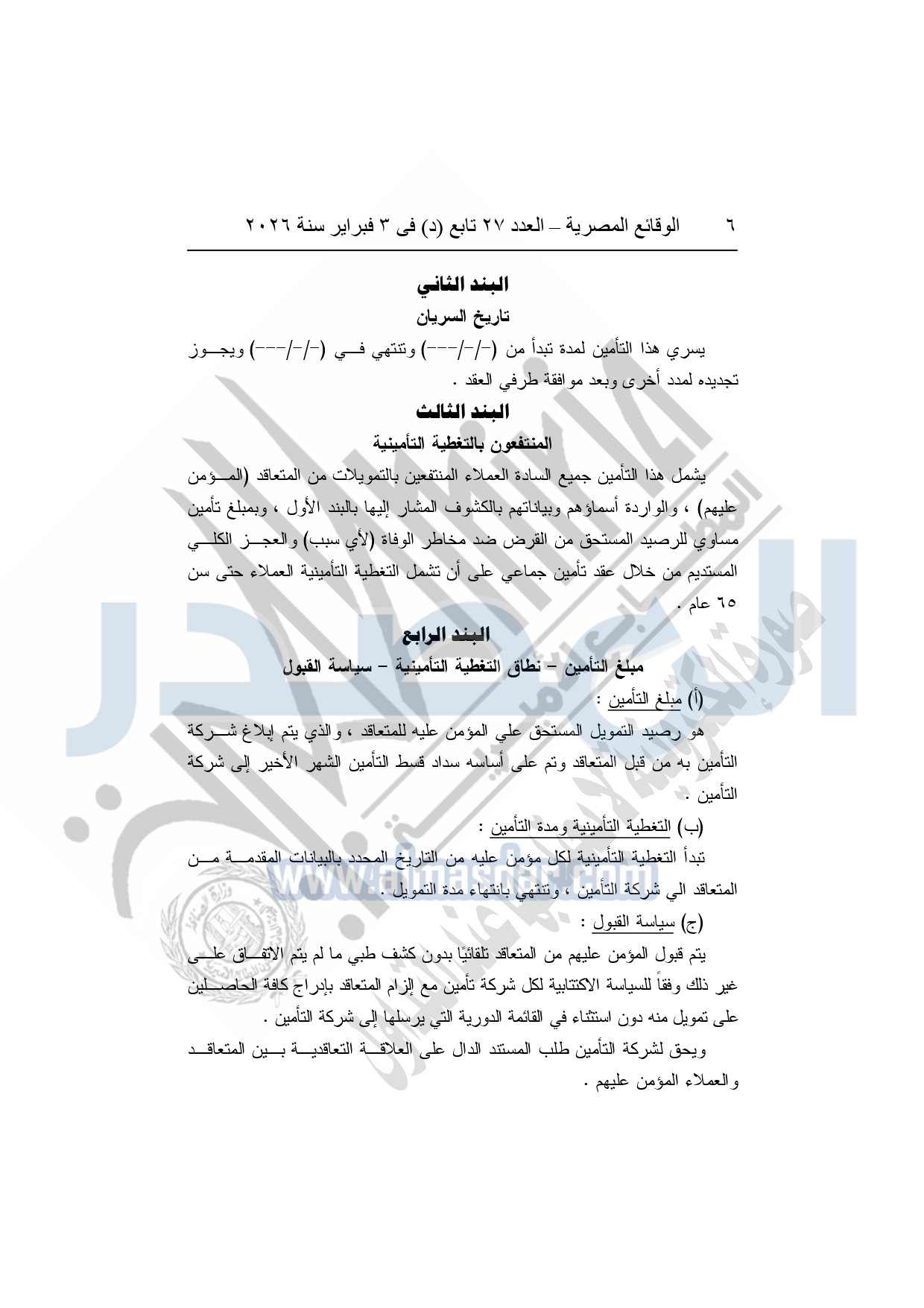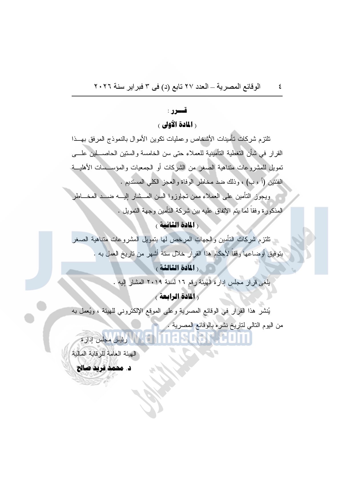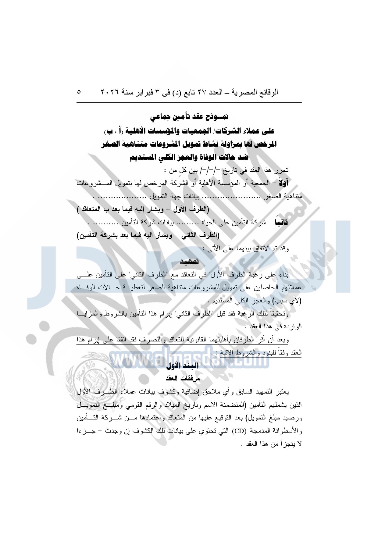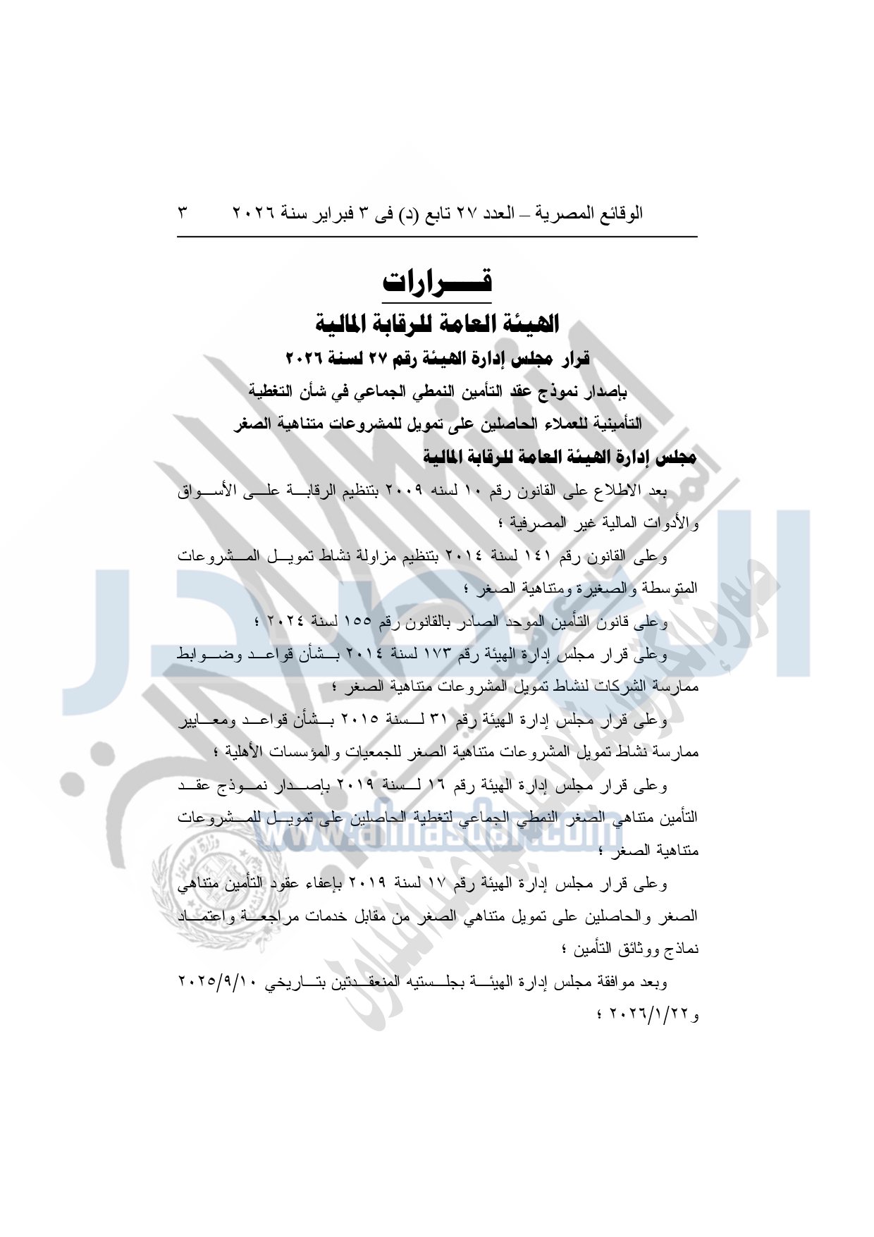 نشرت الوقائع المصرية، في العدد 27 تابع "د"، الصادر في 3 فبراير سنة 2026، قرار الهيئة العامة للرقابة المالية، قرار مجلس إدارة الهيئة رقم 27 لسنة 2026، بشأن إصدار نموذج عقد التأمين النمطي الجماعي في شأن التغطية التأمينية للعملاء الحاصلين على تمويل للمشروعات متناهية الصغر.