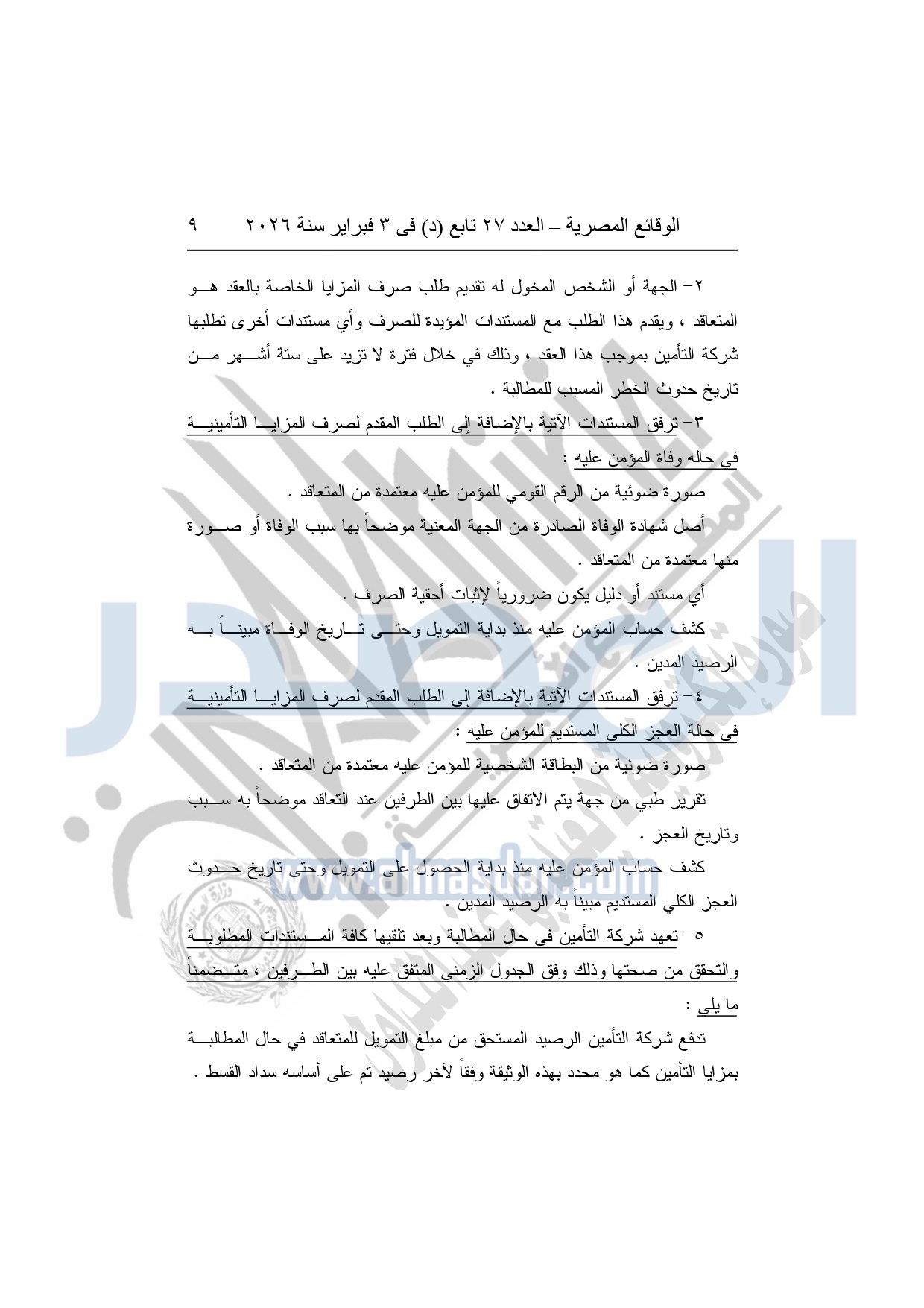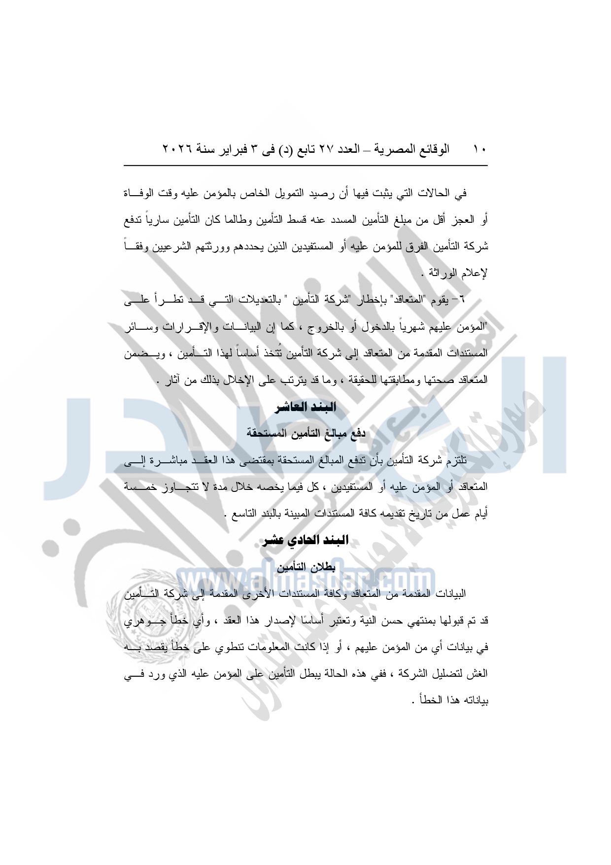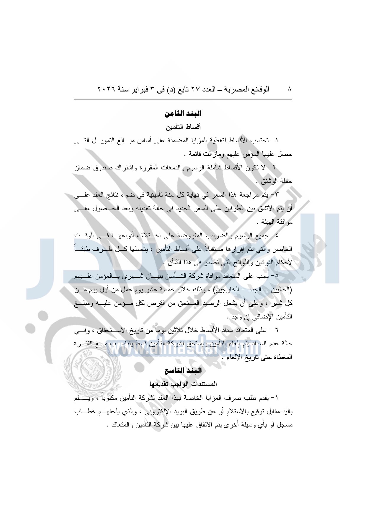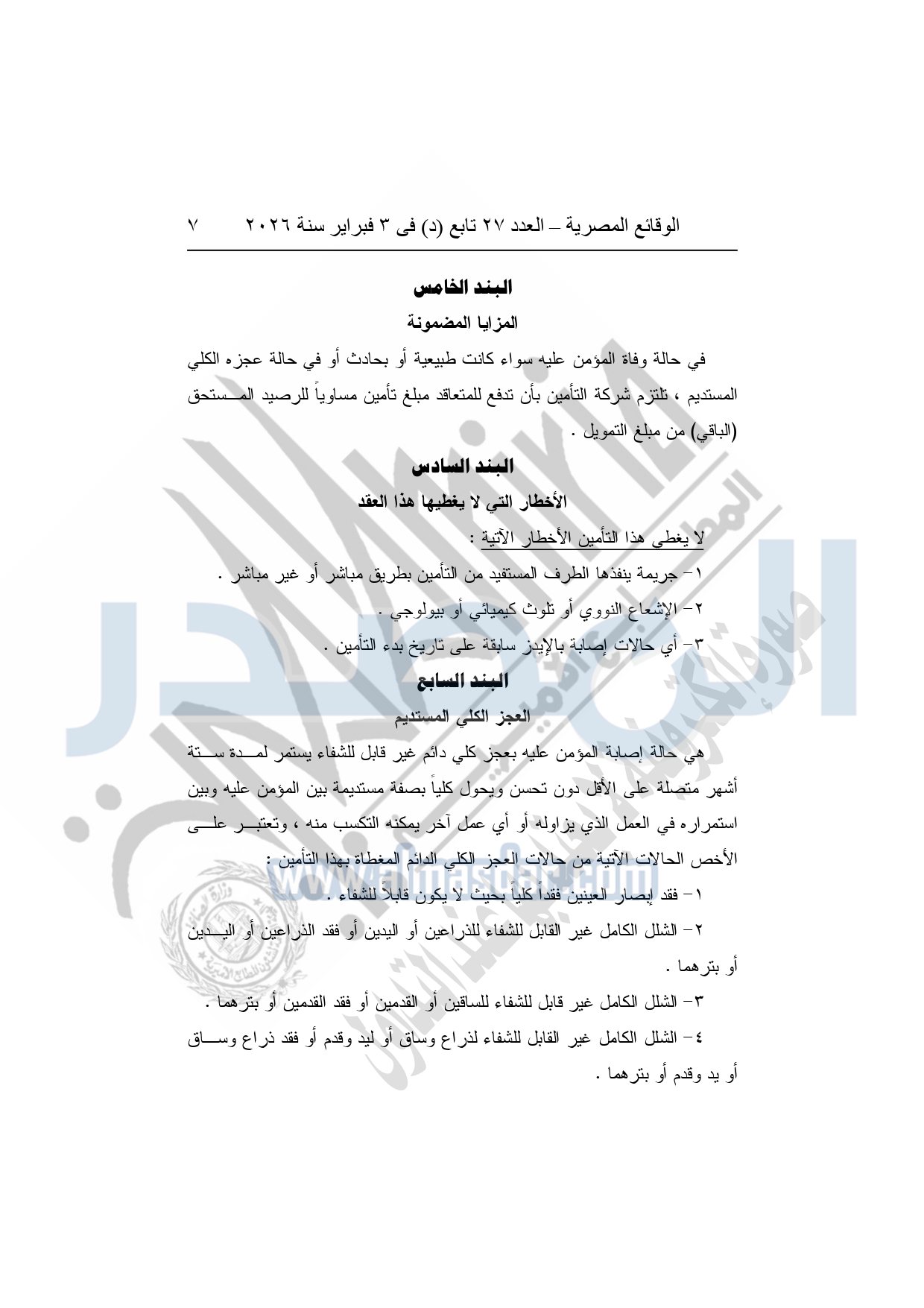 نشرت الوقائع المصرية، في العدد 27 تابع "د"، الصادر في 3 فبراير سنة 2026، قرار الهيئة العامة للرقابة المالية، قرار مجلس إدارة الهيئة رقم 27 لسنة 2026، بشأن إصدار نموذج عقد التأمين النمطي الجماعي في شأن التغطية التأمينية للعملاء الحاصلين على تمويل للمشروعات متناهية الصغر.