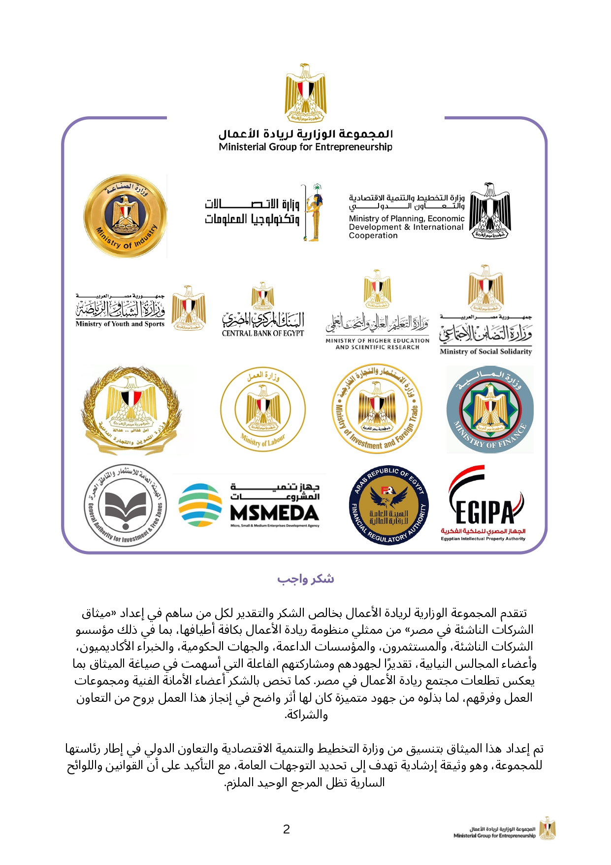 أطلقت مصر، "ميثاق الشركات الناشئة في مصر" والذي يُعد نقلة نوعية الأولى من نوعها في توجه الحكومة نحو التعامل مع قطاع الشركات الناشئة ورواد الأعمال والمبتكرين، وذلك تنفيذًا لتوجيهات الرئيس عبد الفتاح السيسي، رئيس الجمهورية، بتوفير كافة أوجه الدعم للشركات الناشئة، وذلك لأول مرة وبعد مشاورات استمرت لأكثر من عام بين 15 جهة وطنية وأكثر من 250 ممثلًا عن مجتمع الشركات الناشئة ورواد الأعمال وممثلي المجالس النيابية، تحت مظلة المجموعة الوزارية لريادة الأعمال.
