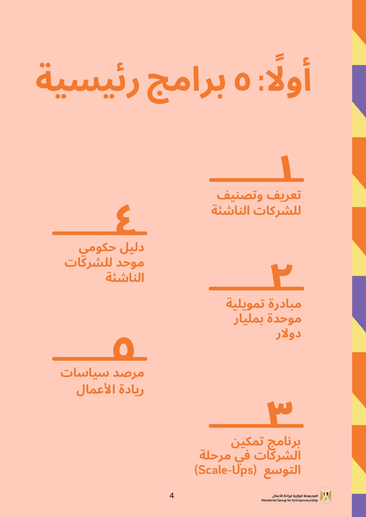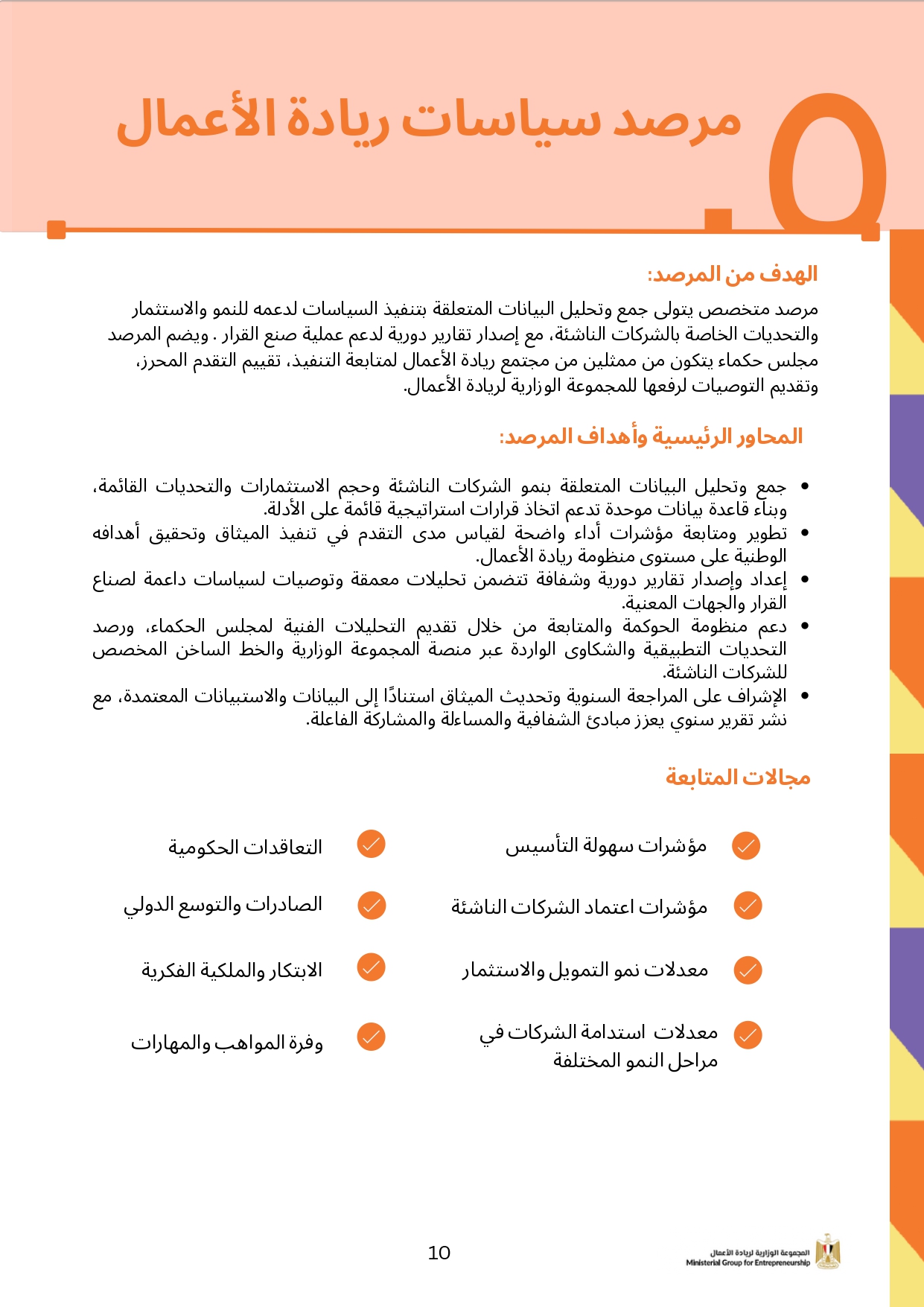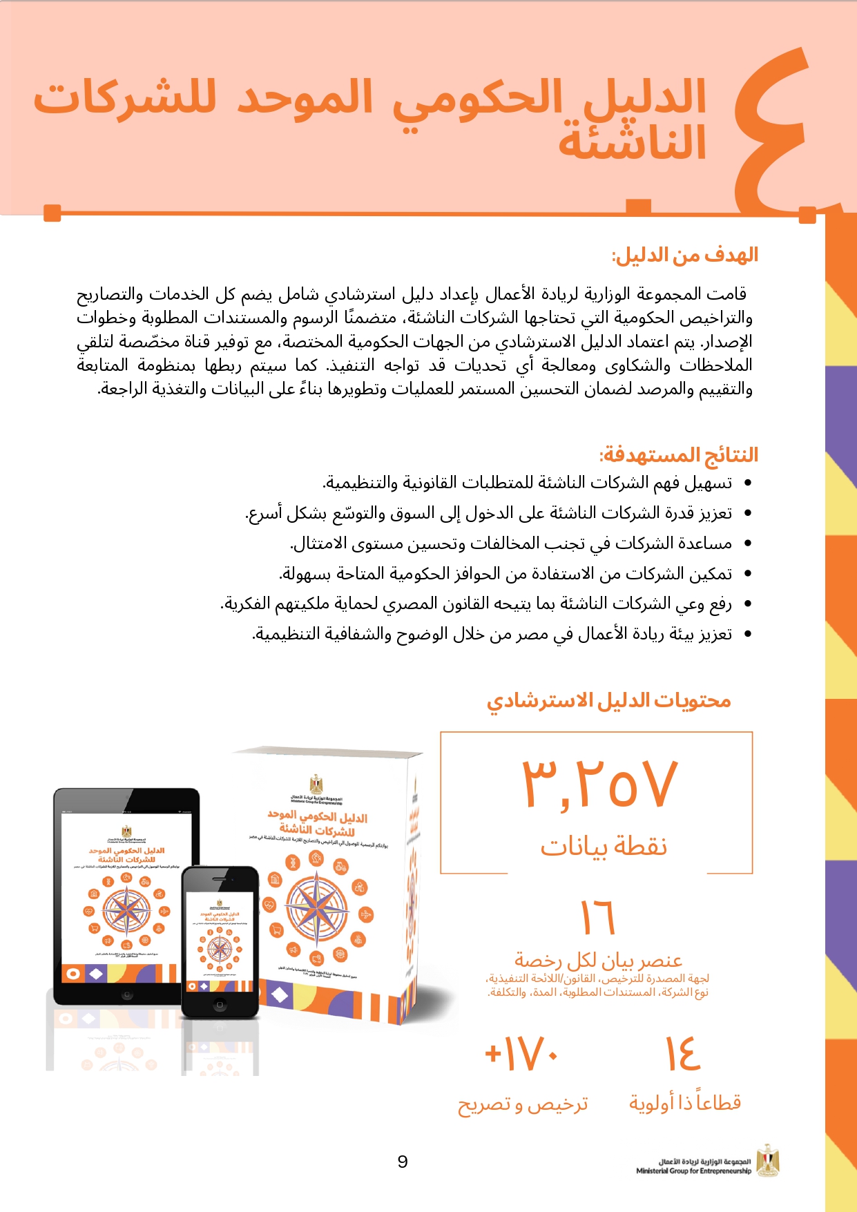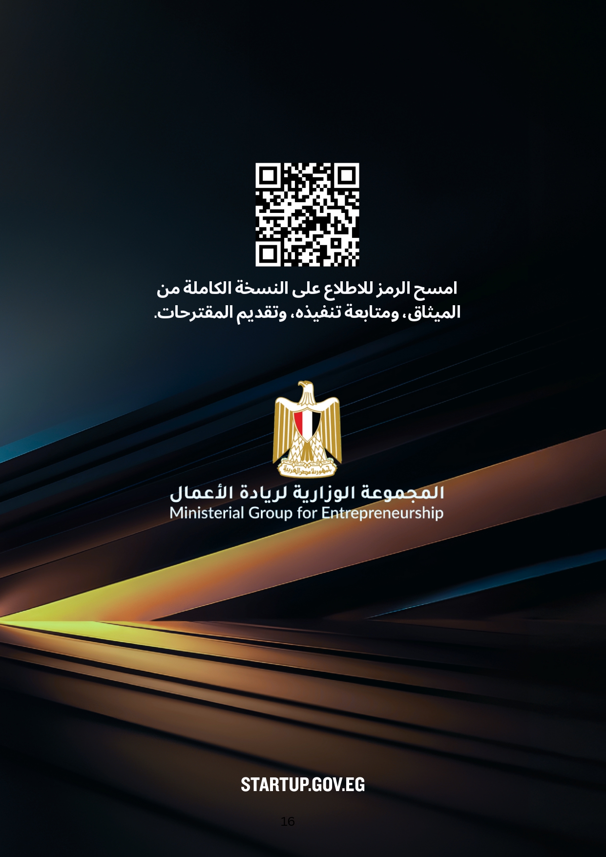كما أعدت المجموعة الوزارية لريادة الأعمال، دليلًا استرشادية شاملًا يضم كافة الخدمات والتصاريح والتراخيص الحكومية التي تحتاجها الشركات الناشئة، متضمنًا الرسوم والمستندات المطلوبة وخطوات الإصدار، وذلك بهدف تسهيل فهم الشركات الناشئة للمتطلبات القانونية والتنظيمية، وتعزيز قدرة الشركات الناشئة على الدخول إلى السوق والتوسع بشكل أسرع، ومساعدتها في تجنب المخالفات وتحسين مستويات الامتثال، وتمكينها من الاستفادة من الحوافز الحكومية المتاحة، وتعزيز بيئة ريادة الأعمال في مصر من خلال الوضوح والشفافية التنظيمية، وقد تم إعداد الميثاق بالتعاون مع شركة انطلاق وUN Women،