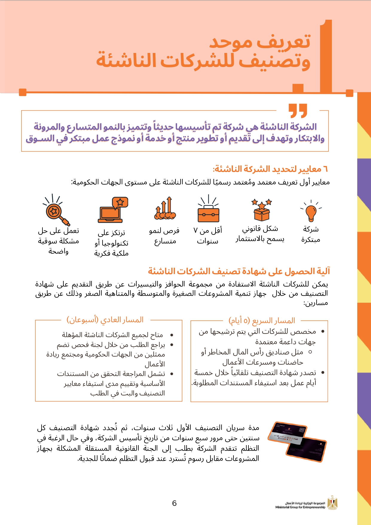 ويتضمن «ميثاق الشركات الناشئة»، التعريف الموحد للشركات الناشئة وهي الشركات التي تم تأسيسها حديثًا وتتميز بالنمو المتسارع والمرونة والابتكار، وتهدف إلى تقديم أو تطوير منتج أو خدمة أو نموذج عمل مبتكر في السوق، موضحة أن التعريف الموحد للشركات الناشئة يمكنها من الاستفادة من مجموعة الحوافز والتيسيرات عن طريق الحصول على شهادة التصنيف من جهات المشروعات الصغيرة والمتوسطة.