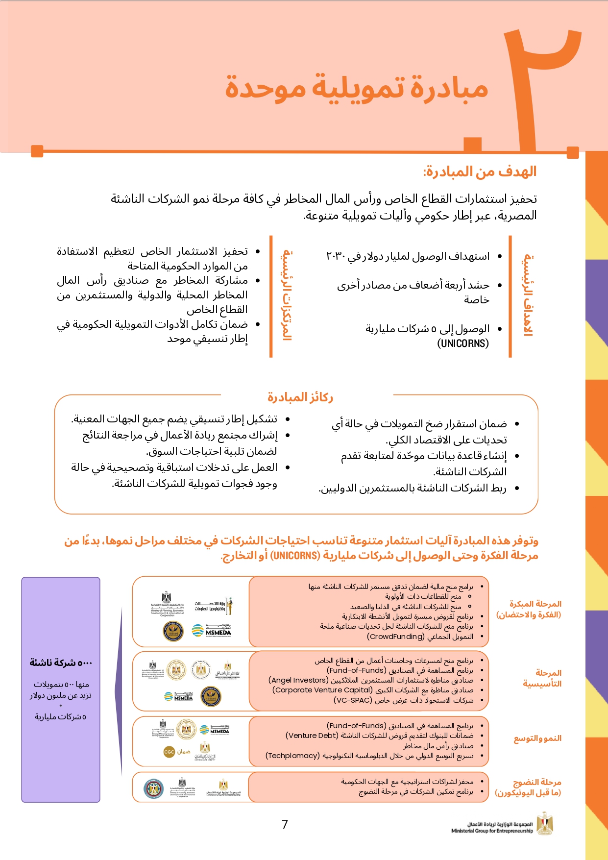 وأضافت الدكتورة رانيا المشاط، أن الميثاق يتضمن مبادرة تمويلية موحّدة تهدف إلى تنسيق الموارد التمويلية المتاحة لدى الجهات الحكومية، وتفعيل آليات مبتكرة لتعظيم أثرها بمعدل يصل إلى أربعة أضعاف، وتستهدف المبادرة حشد تمويلات بقيمة مليار دولار على مدار خمس سنوات لقطاع الشركات الناشئة، من خلال موارد حكومية وضمانات واستثمارات مشتركة مع صناديق رأس المال المخاطر وجهات استثمارية وتمويلية أخرى من القطاع الخاص.