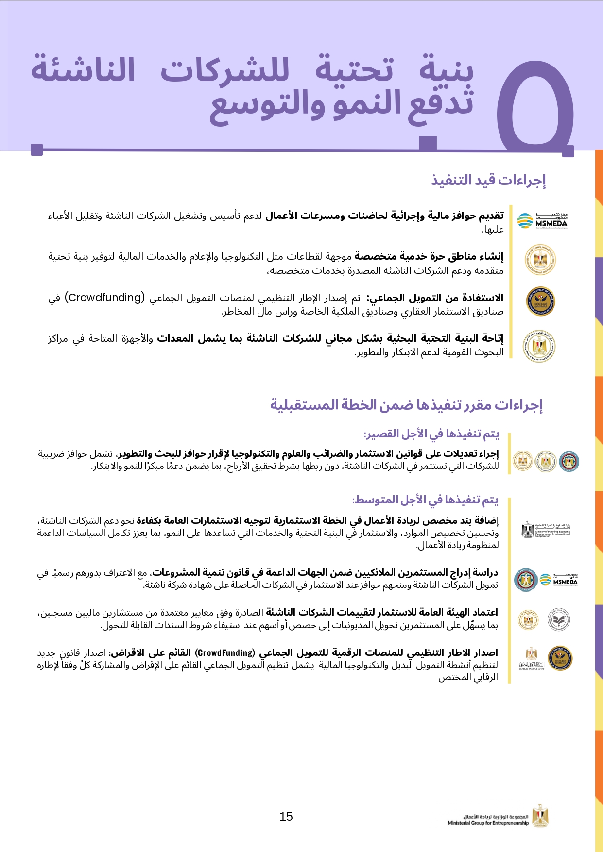 من جانب آخر، يتضمن ميثاق الشركات الناشئة، مجموعة من الإجراءات التي يجري تنفيذها من أجل سد الفجوة الإجرائية، وتمكين الشركات الناشئة من الاستفادة من المحفزات الحكومية، فضلًا عن إجراءات تم تنفيذها بالفعل من أجل استحداث آليات تمويلية مثل التمويل التشاركي Crowd Funding، بالإضافة إلى إجراءات أخرى قصيرة ومتوسطة المدى لتحسين بيئة الأعمال للشركات الناشئة، من بينها تيسير المعاملات الضريبية لتلك الشركات، وتيسير إجراءات التصفية والتخارج، وإجراء دراسة شاملة لتحديد التحديات التنظيمية والإجرائية الخاصة بالقطاعات الفرعية ذات الأولوية، واقتراح تيسيرات وحلول عملية تتناسب مع طبيعة أنشطتها.