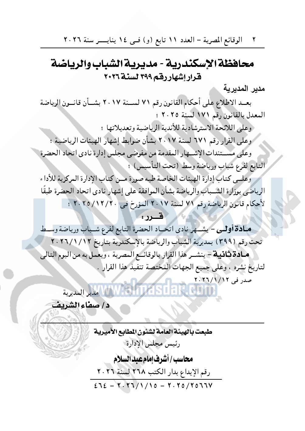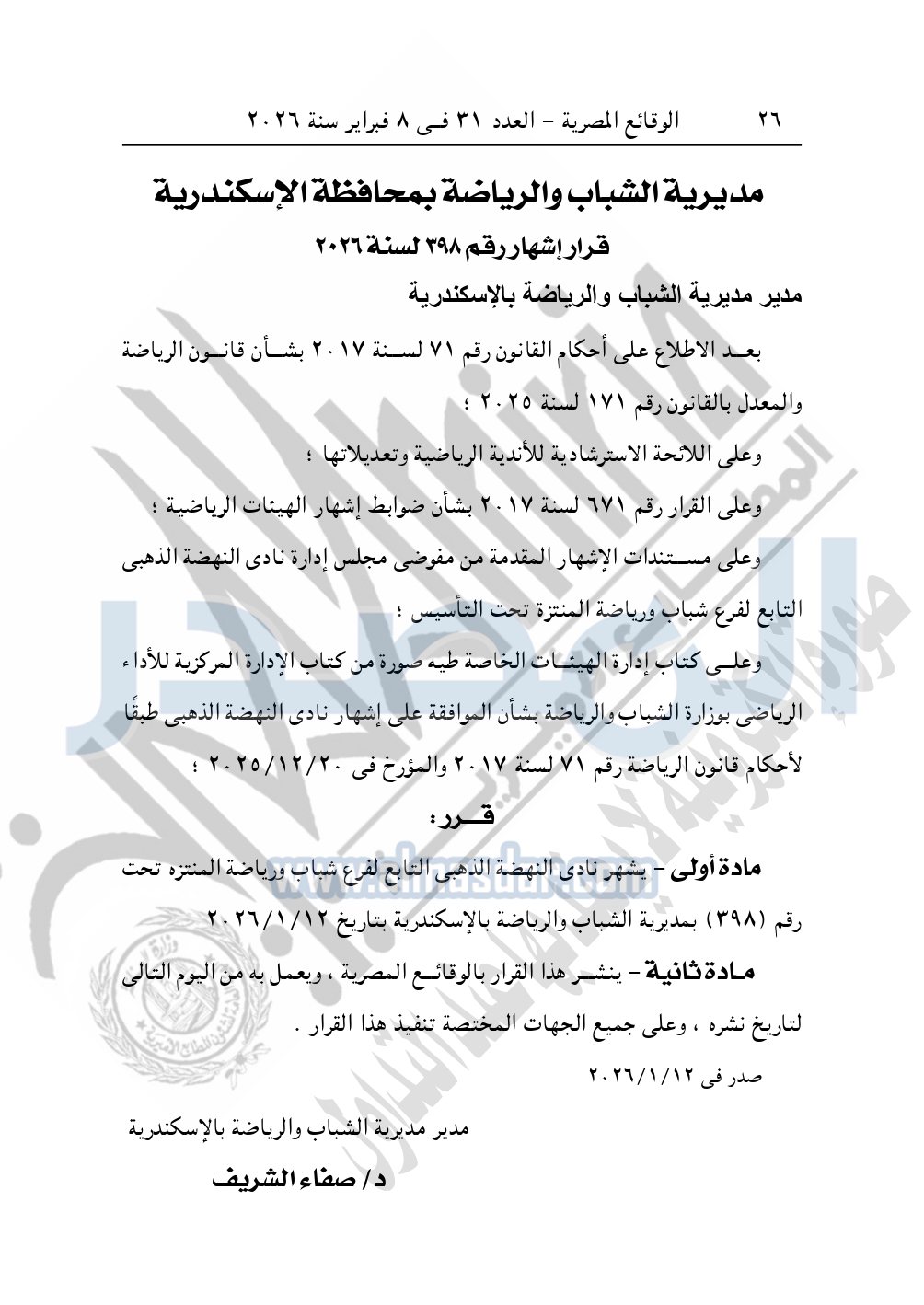 كما نشرت الوقائع المصرية في العدد 11 تابع "و"، الصادر في 14 يناير 2026، قرار مديرية الشباب والرياضة بمحافظة الإسكندرية، قرار إشهار رقم 399 لسنة 2026، بشأن إشهار نادى اتحاد الحضرة.