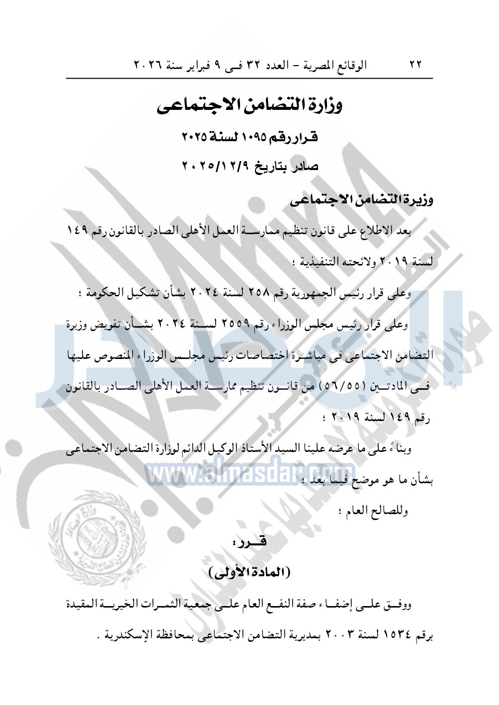 نشرت الوقائع المصرية في العدد 32، الصادر في 9 فبراير سنة 2026، وزارة التضامن الاجتماعي، رقم 1095 لسنة 2025، بتاريخ 9-12-2025، بشأن الموافقة على إضفاء صفة النفع العام على جمعية الثمرات الخيرية.