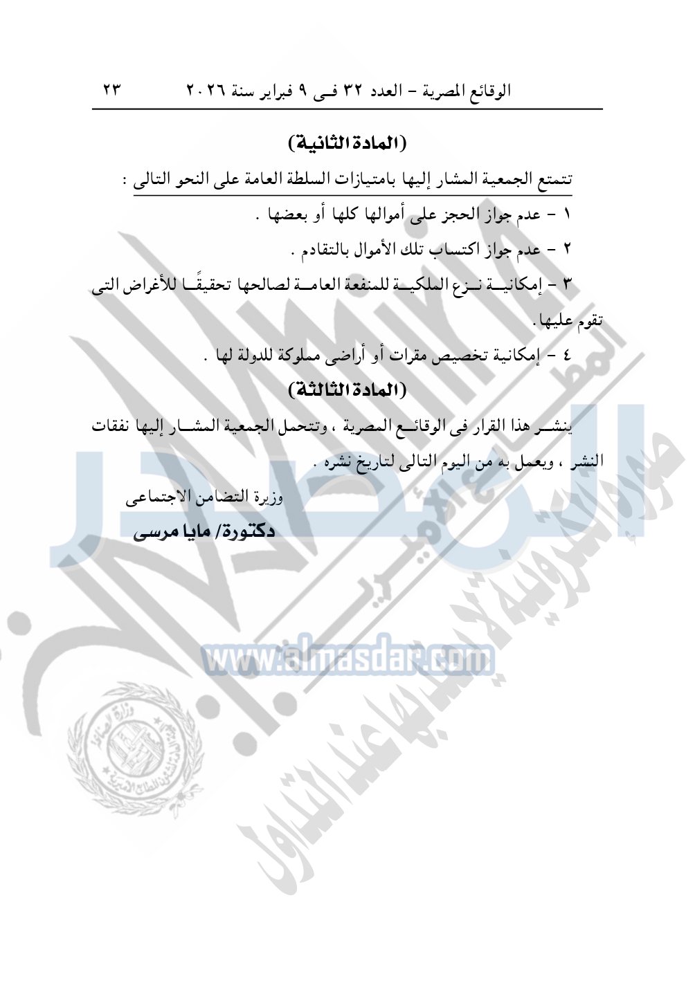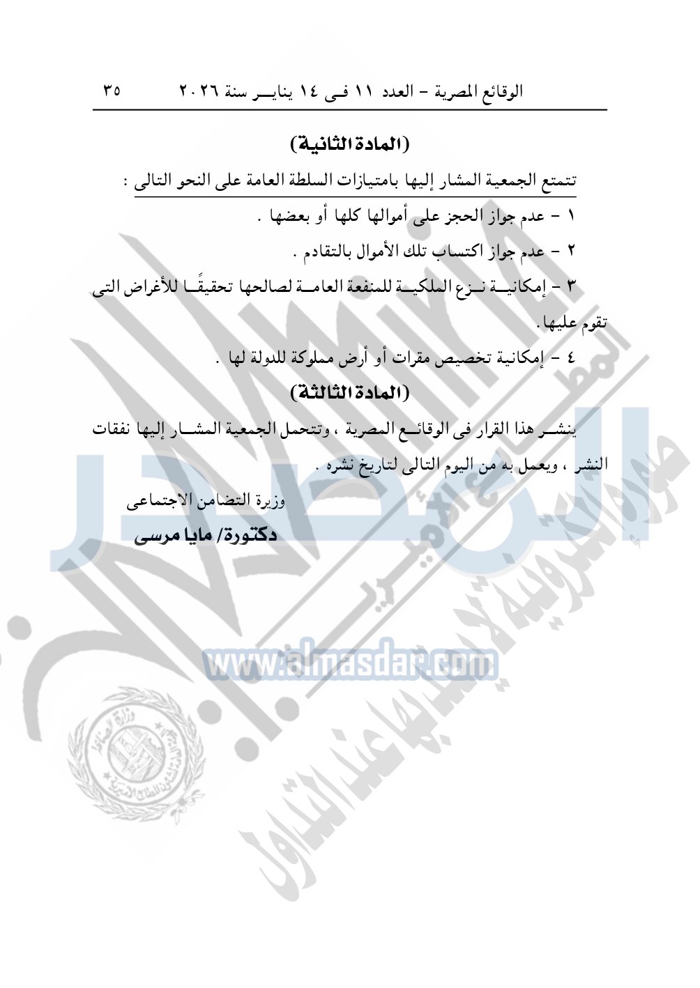 كما نشرت الوقائع المصرية في العدد 11، الصادر في 14 يناير سنة 2026، وزارة التضامن الاجتماعي، رقم 261 لسنة 2025، بتاريخ 26-2-2025، بشأن الموافقة على إضفاء صفة النفع العام على جمعية الهدف الرياضي للتنمية بالسماعنة.