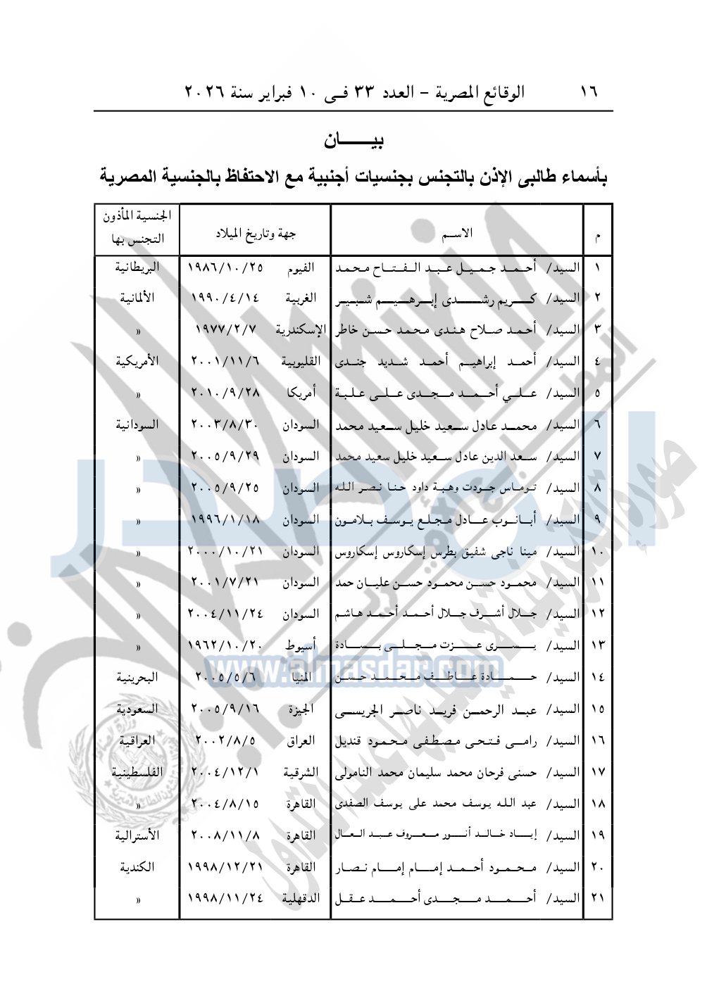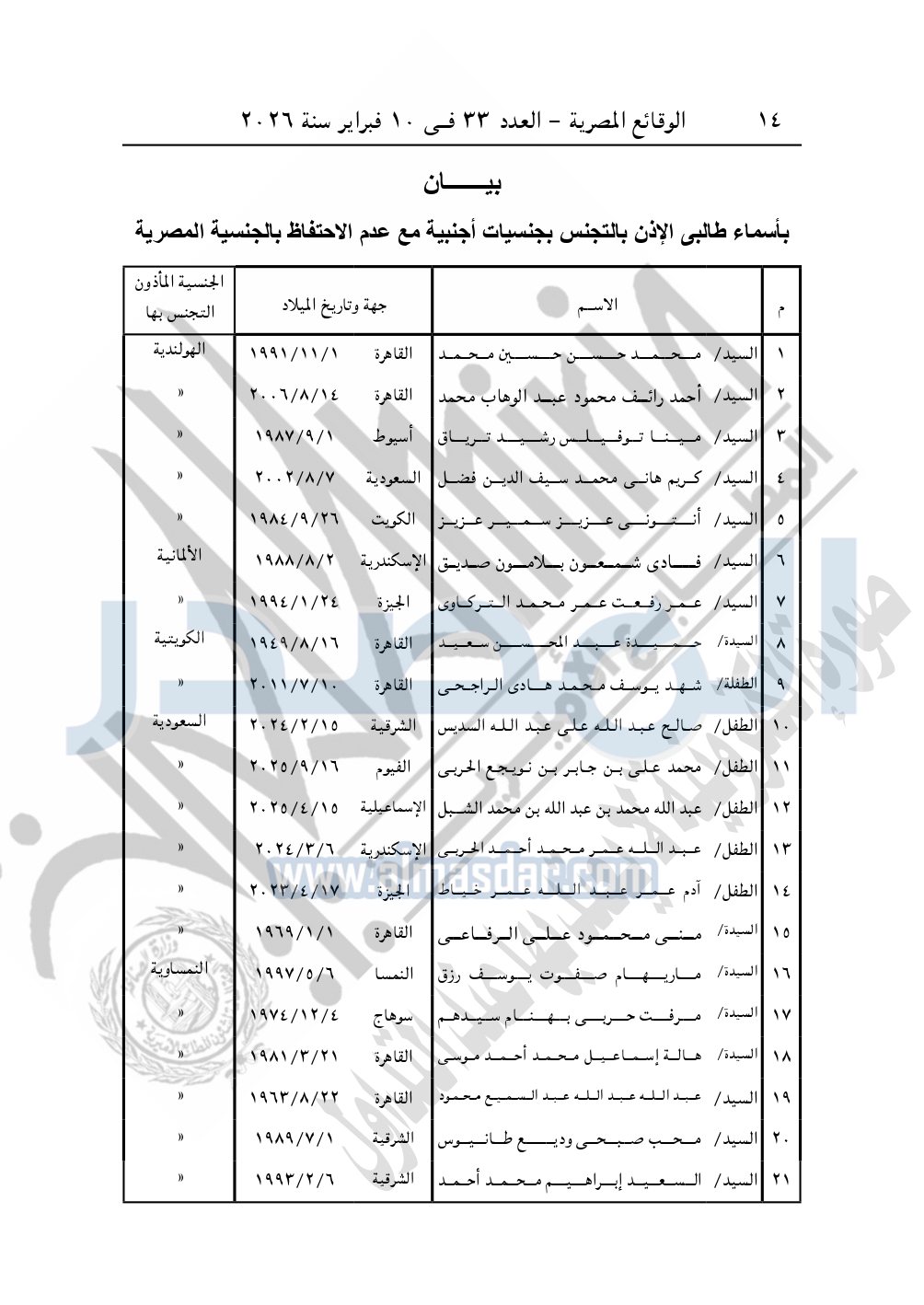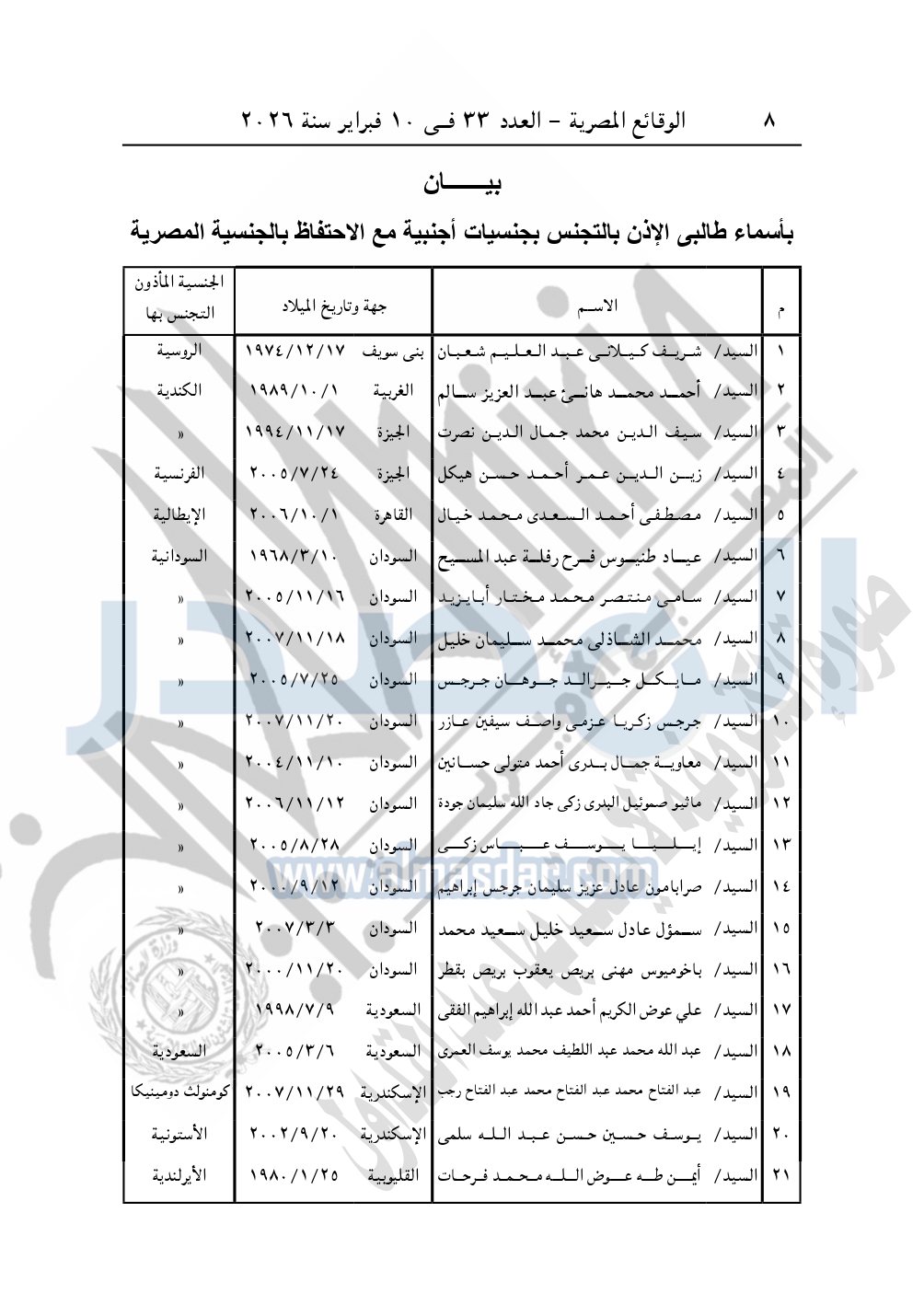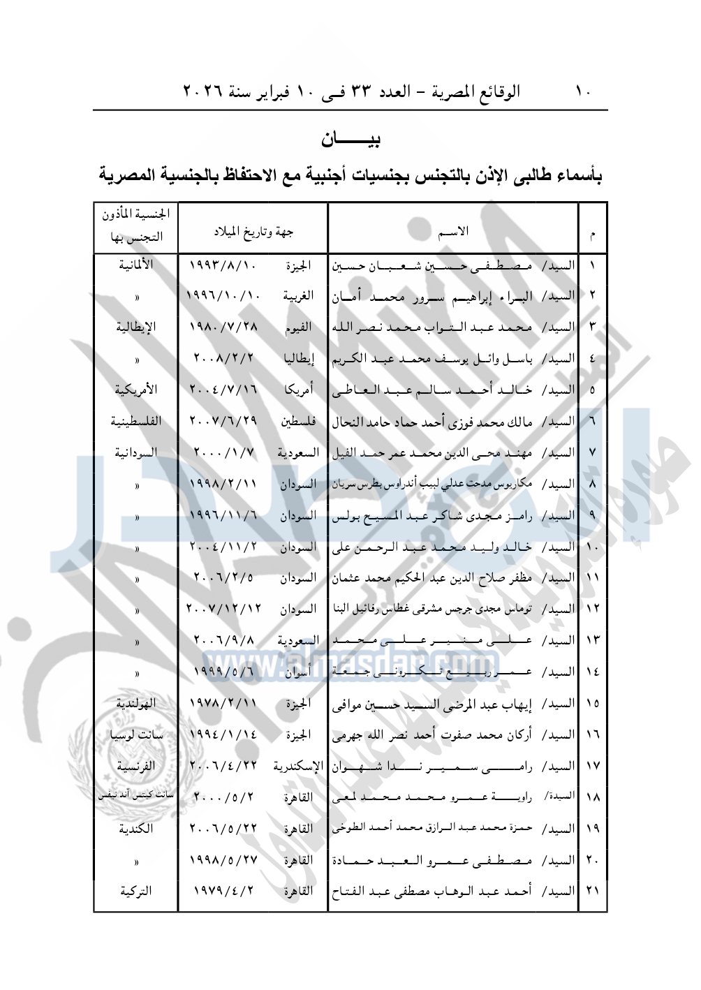 وأيضا نشرت الوقائع المصرية في العدد 33 الصادر في 10 فبراير سنة 2026، قرار وزارة الداخلية، رقم 113 لسنة 2026، بشأن الإذن للواحد والعشرين مواطن بالحصول على الجنسية الأجنبية مع احتفاظهم بالجنسية المصرية.