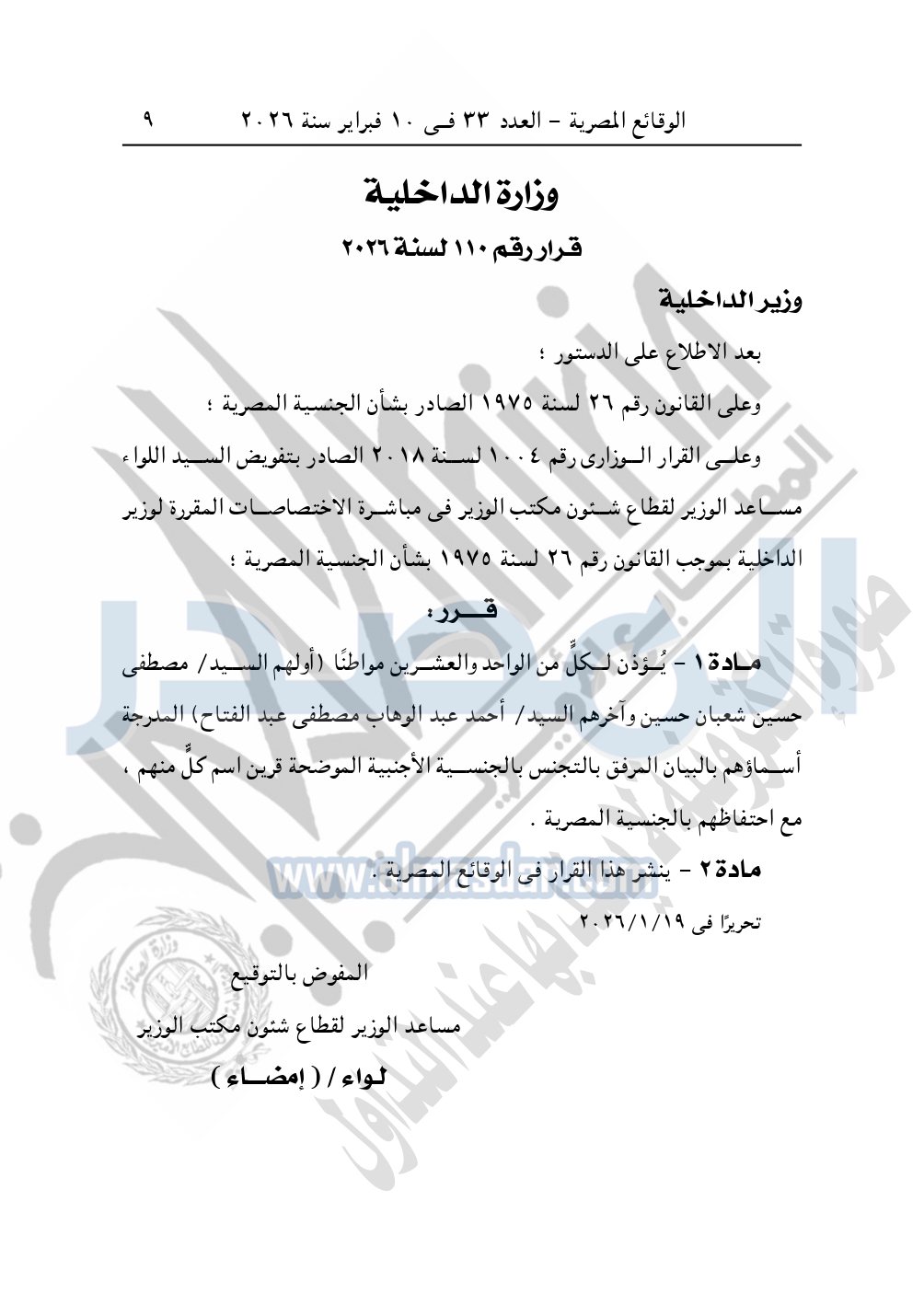 كما نشرت الوقائع المصرية في العدد 33 الصادر في 10 فبراير سنة 2026، قرار وزارة الداخلية، رقم 110 لسنة 2026، بشأن الإذن للواحد والعشرين مواطن بالحصول على الجنسية الأجنبية مع احتفاظهم بالجنسية المصرية.