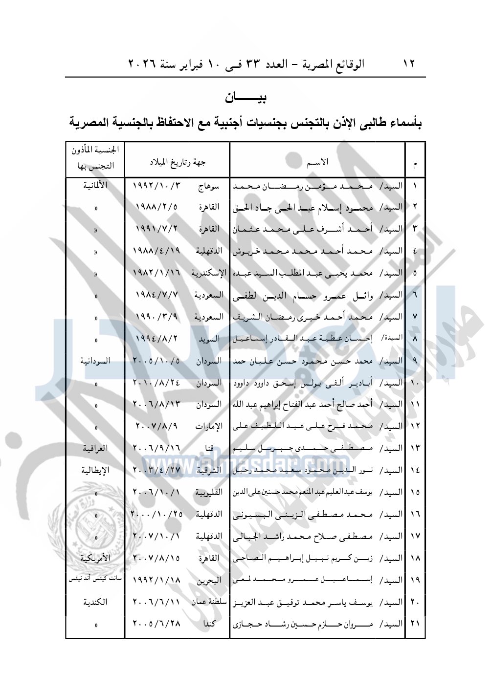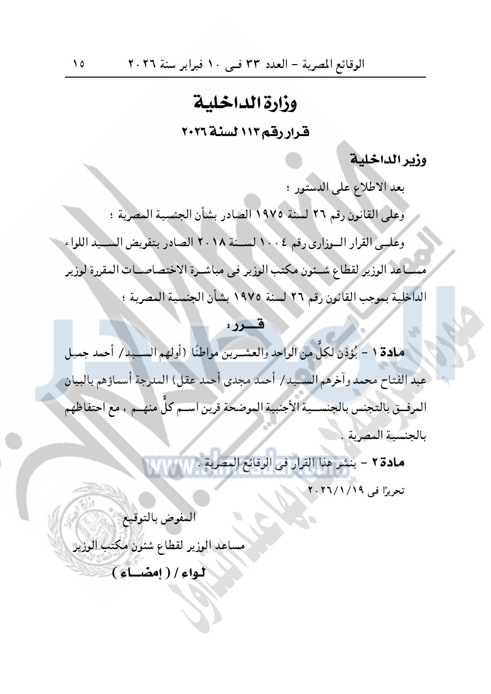 ونشرت الوقائع المصرية في العدد 33 الصادر في 10 فبراير سنة 2026، قرار وزارة الداخلية، رقم 112 لسنة 2026، بشأن الإذن للواحد والعشرين مواطن بالحصول على الجنسية الأجنبية مع احتفاظهم بالجنسية المصرية.