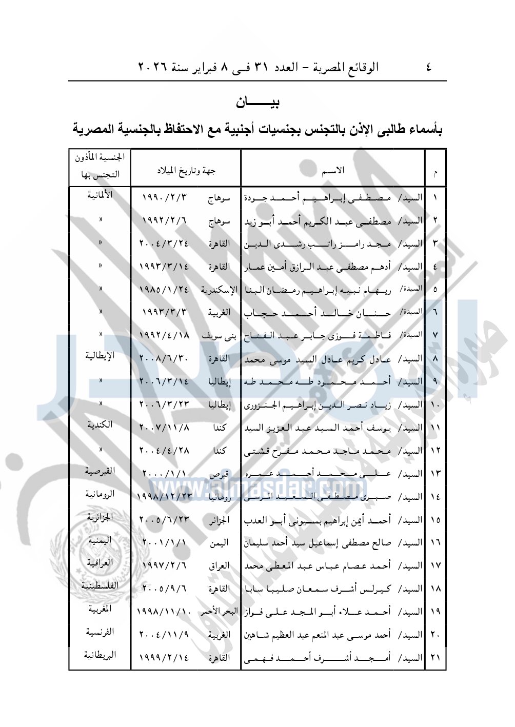 ونشرت الوقائع المصرية في العدد 31 الصادر في 8 فبراير سنة 2026، قرار وزارة الداخلية، رقم 57 لسنة 2026، بشأن الإذن للواحد والعشرين مواطن بالحصول على الجنسية الأجنبية مع احتفاظهم بالجنسية المصرية.