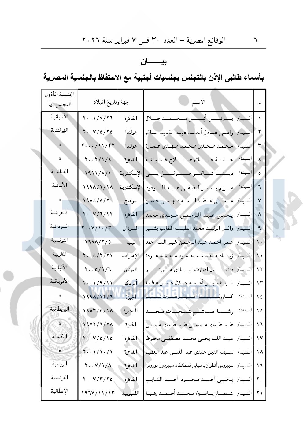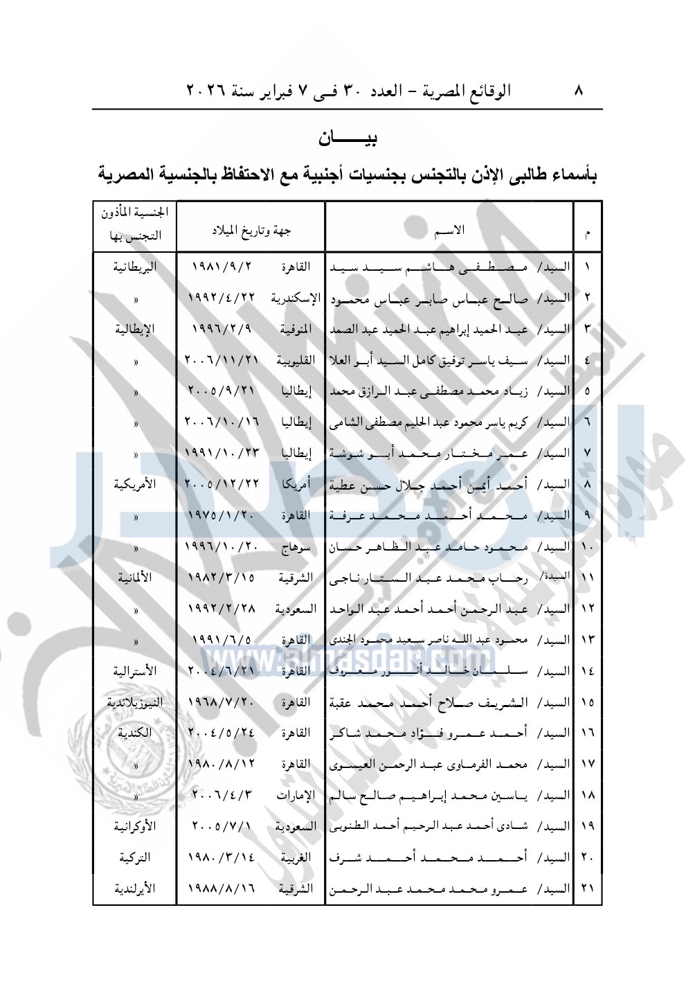 وأيضا نشرت الوقائع المصرية في العدد 30 الصادر في 7 فبراير سنة 2026، قرار وزارة الداخلية، رقم 56 لسنة 2026، بشأن الإذن للواحد والعشرين مواطن بالحصول على الجنسية الأجنبية مع احتفاظهم بالجنسية المصرية.