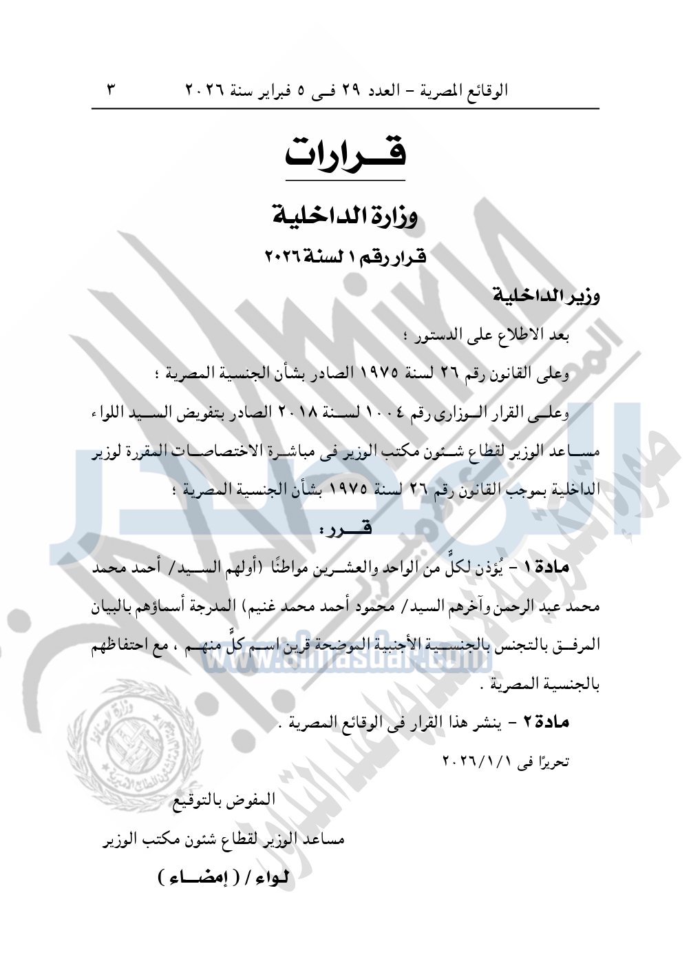 نشرت الوقائع المصرية في العدد 29 الصادر في 5 فبراير سنة 2026، قرار وزارة الداخلية، رقم 1 لسنة 2026، بشأن الإذن للواحد والعشرين مواطن بالحصول على الجنسية الأجنبية مع احتفاظهم بالجنسية المصرية.