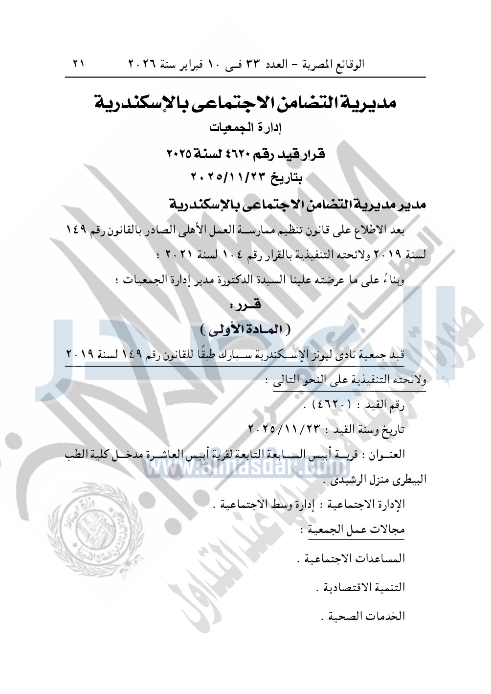 نشرت الوقائع المصرية في العدد 33، الصادر في 10 فبراير 2026، قرار مديرية التضامن الاجتماعي بالإسكندرية، قيد رقم 4620 لسنة 2025، بتاريخ 23-11-2025، بشأن قيد جمعية نادي ليونز الإسكندرية سبارك.