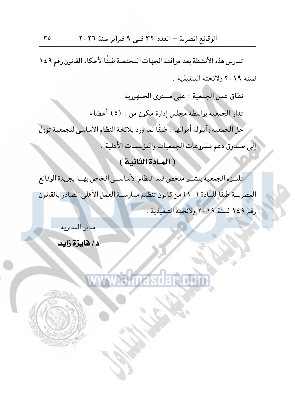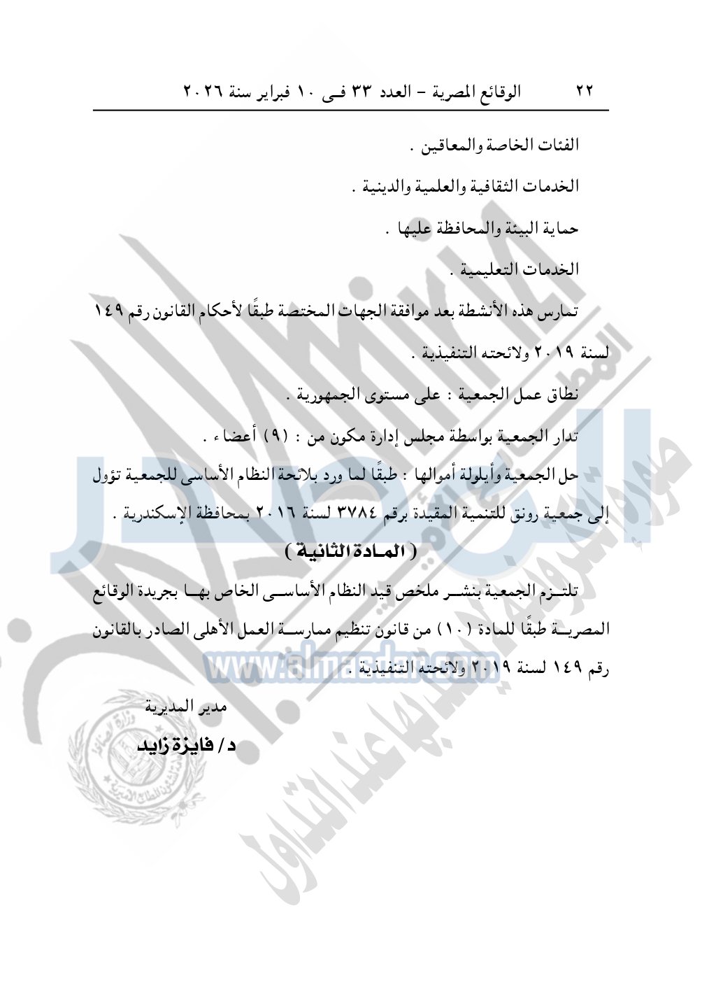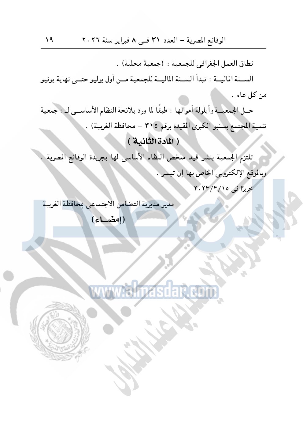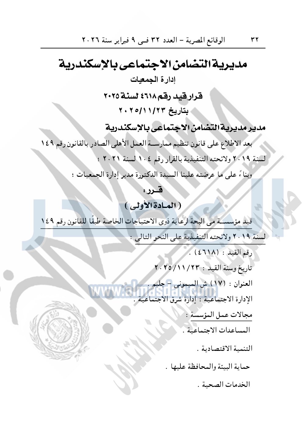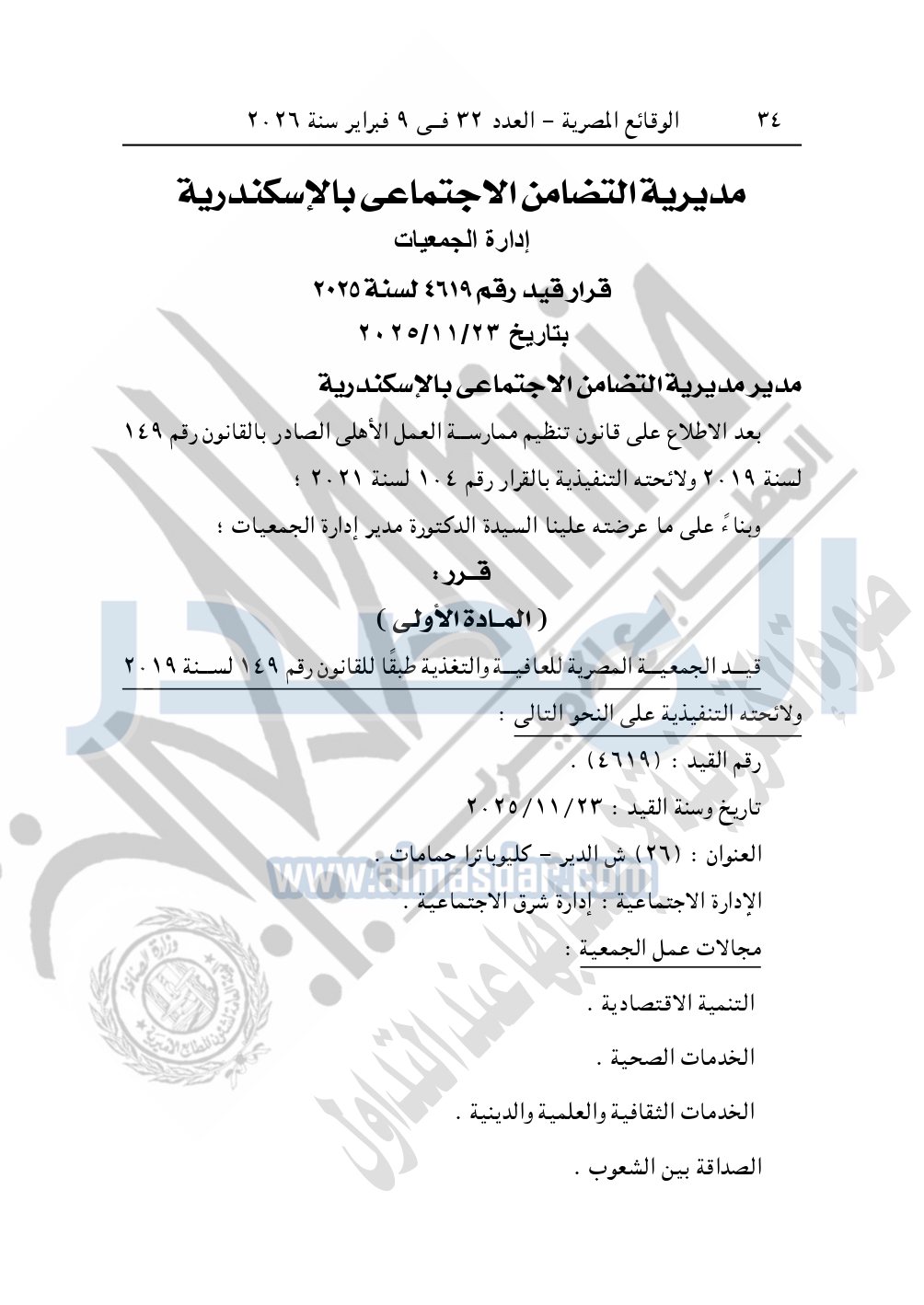 ونشرت الوقائع المصرية في العدد 32، الصادر في 9 فبراير 2026، قرار مديرية التضامن الاجتماعي بالإسكندرية، قيد رقم 4619 لسنة 2025، بتاريخ 23-11-2025، بشأن قيد الجمعية المصرية للعافية والتغذية.
