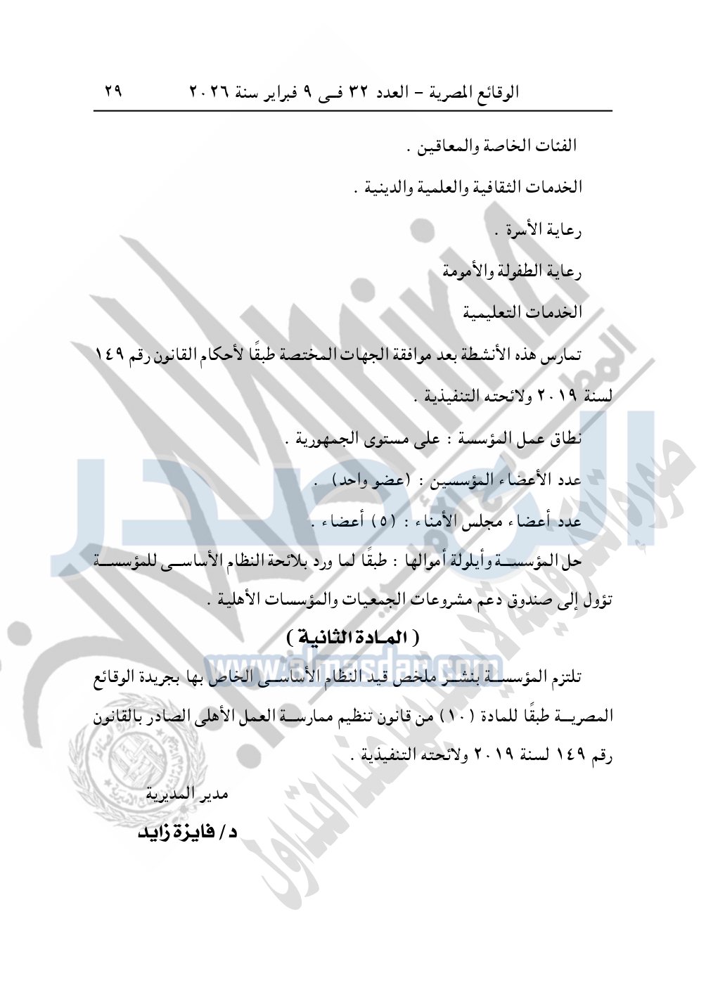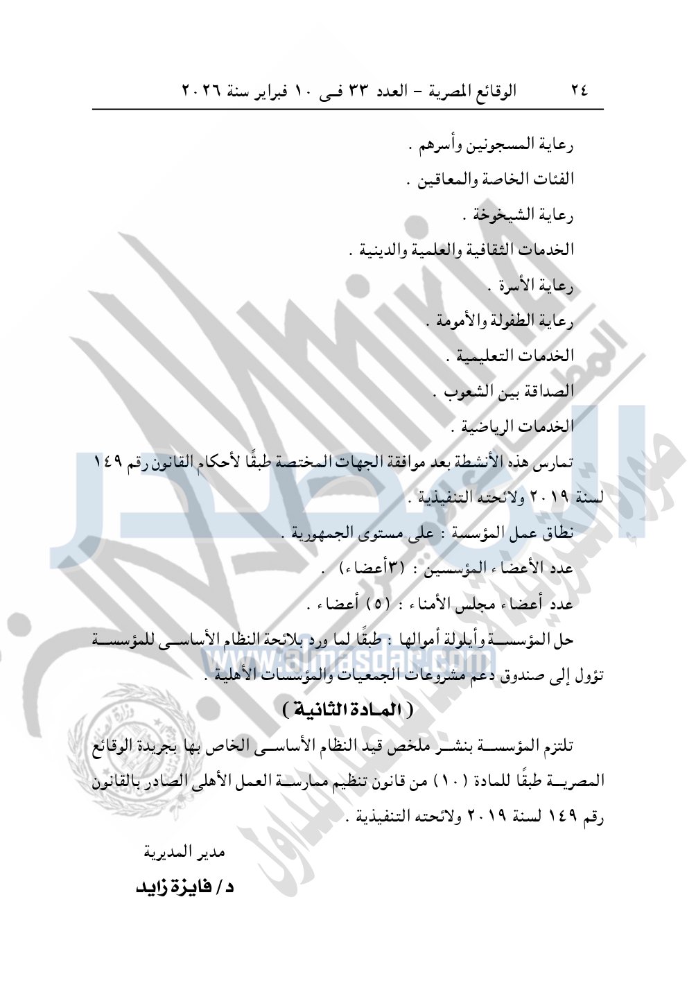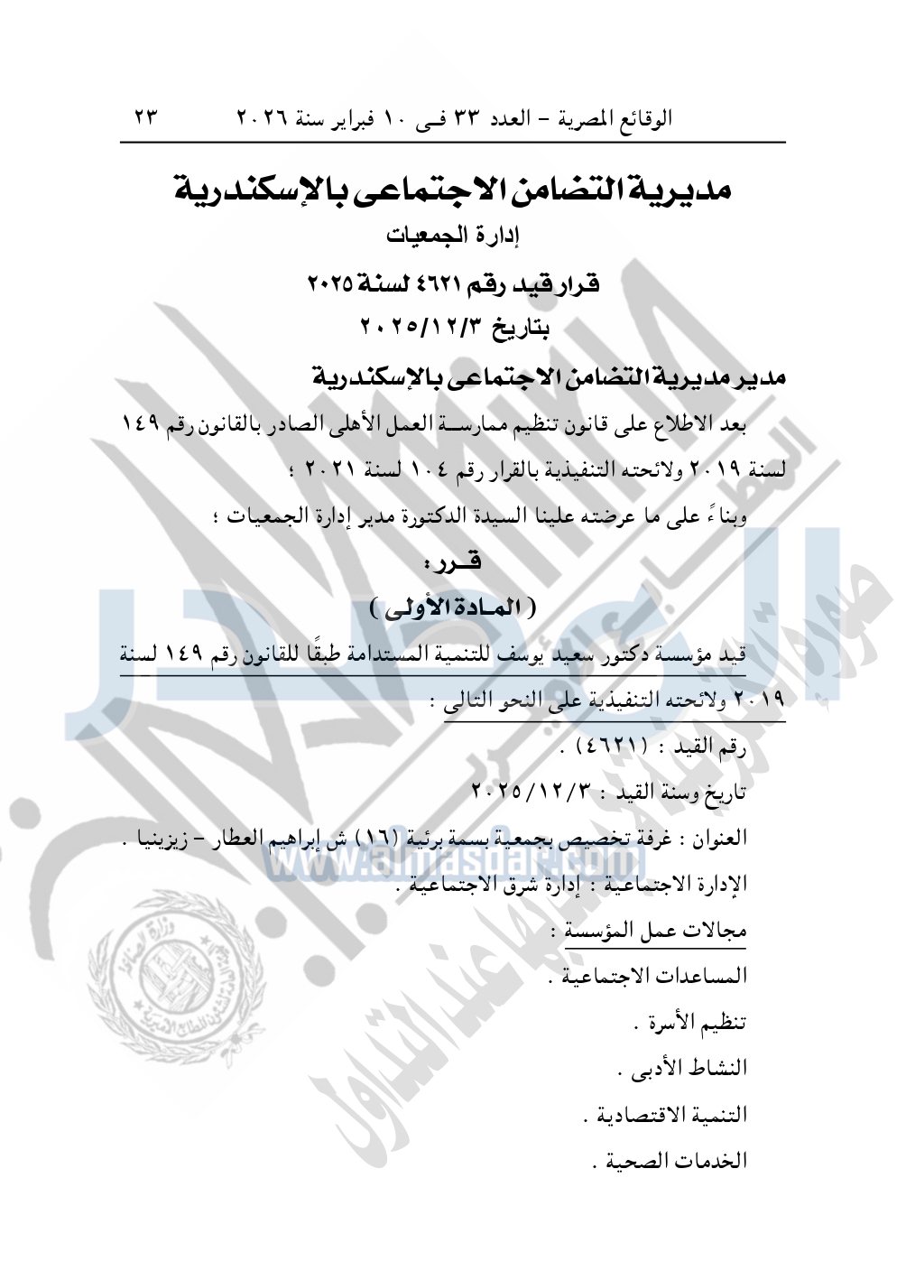 كما نشرت الوقائع المصرية في العدد 33، الصادر في 10 فبراير 2026، قرار مديرية التضامن الاجتماعي بالإسكندرية، قيد رقم 4621 لسنة 2025، بتاريخ 3-12-2025، بشأن قيد مؤسسة دكتور سعيد يوسف للتنمية المستدامة.