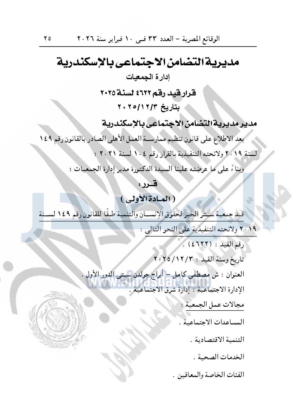 وأيضا نشرت الوقائع المصرية في العدد 33، الصادر في 10 فبراير 2026، قرار مديرية التضامن الاجتماعي بالإسكندرية، قيد رقم 4622 لسنة 2025، بتاريخ 3-12-2025، بشأن قيد جمعية ستر الخير لحقوق الإنسان والتنمية.