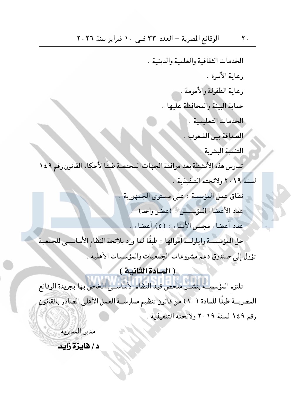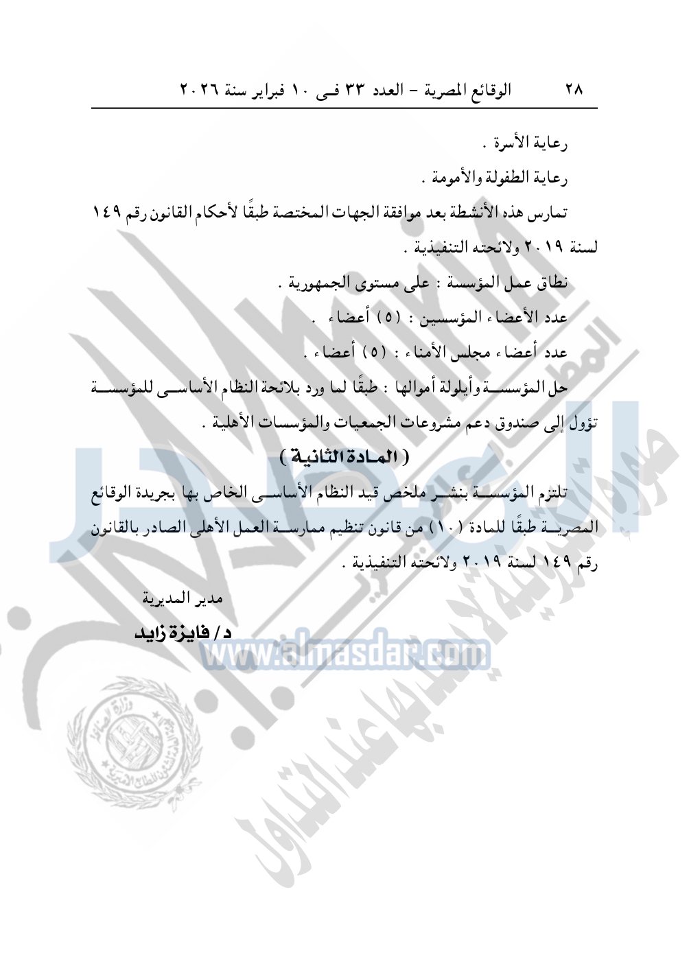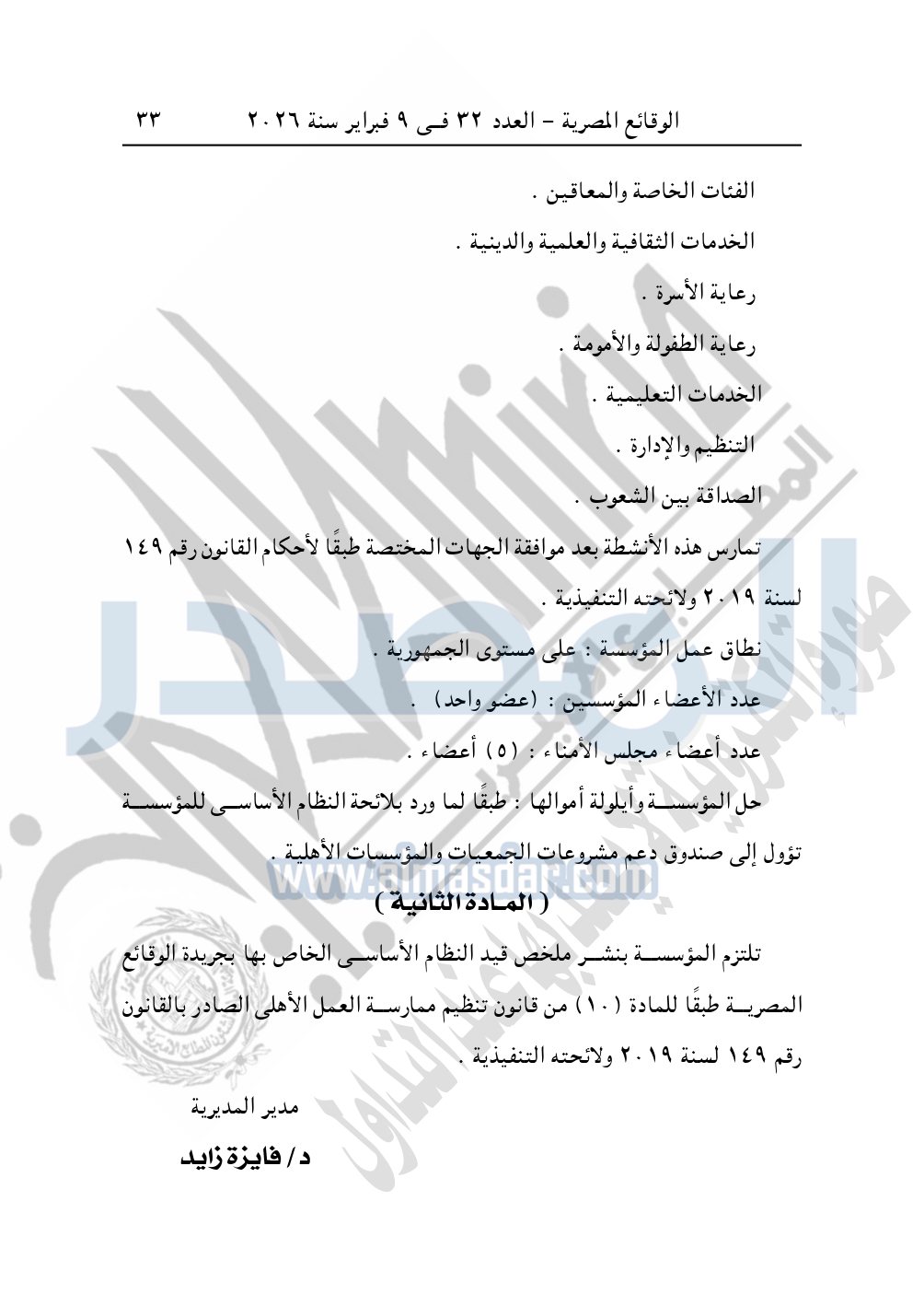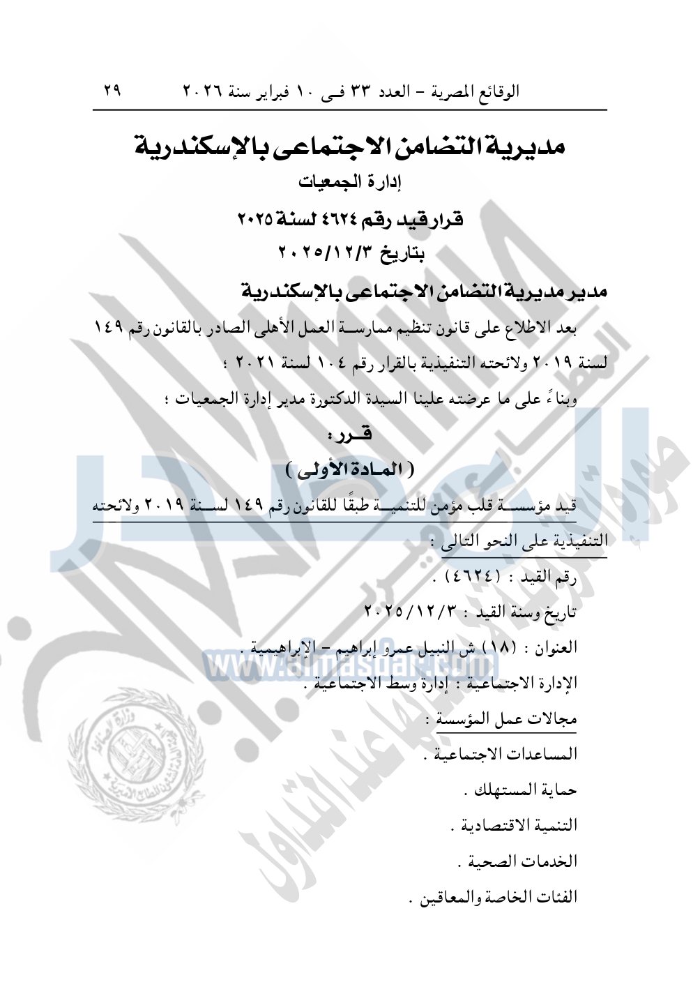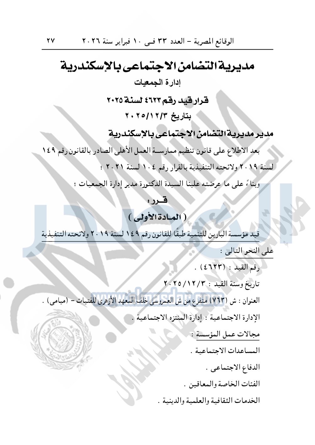 ونشرت الوقائع المصرية في العدد 33، الصادر في 10 فبراير 2026، قرار مديرية التضامن الاجتماعي بالإسكندرية، قيد رقم 4623 لسنة 2025، بتاريخ 3-12-2025، بشأن قيد مؤسسة البارين للتنمية.