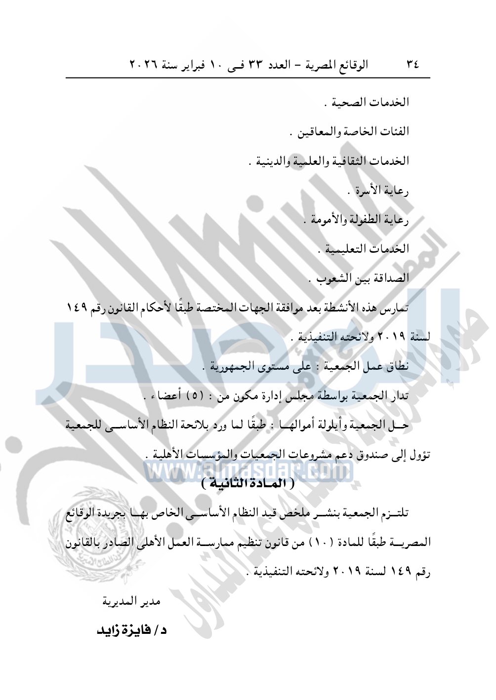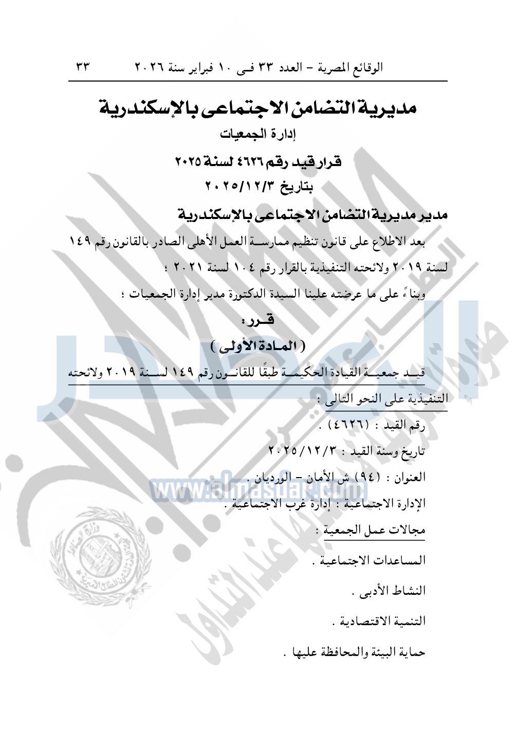 ونشرت الوقائع المصرية في العدد 33، الصادر في 10 فبراير 2026، قرار مديرية التضامن الاجتماعي بالإسكندرية، قيد رقم 4626 لسنة 2025، بتاريخ 3-12-2025، بشأن قيد جمعية القيادة الحكيمة.