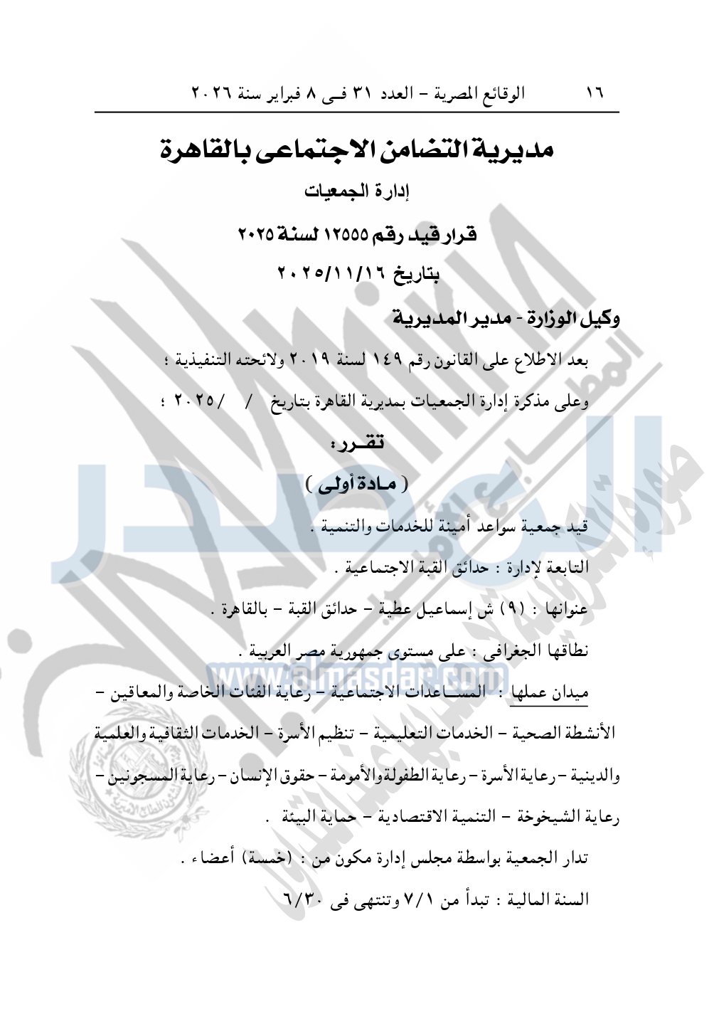 كما نشرت الوقائع المصرية في العدد 31، الصادر في 8 فبراير 2026، قرار مديرية التضامن الاجتماعي بالقاهرة، قيد رقم 12555 لسنة 2025، بتاريخ 16-11-2025، بشأن قيد جمعية سواعد أمنية للخدمات والتنمية.